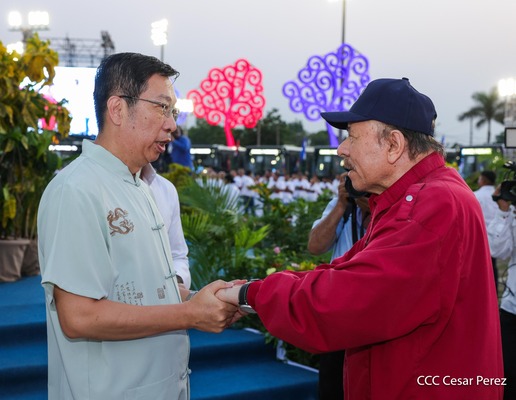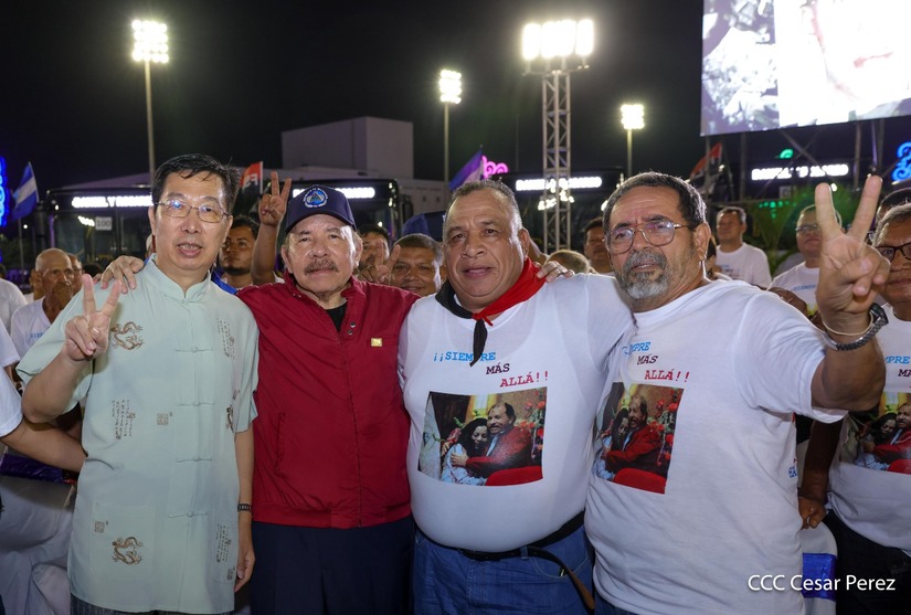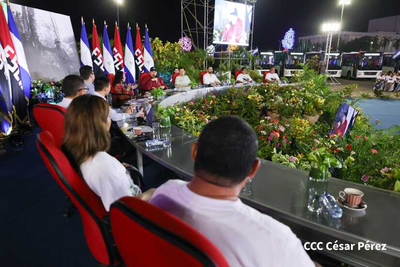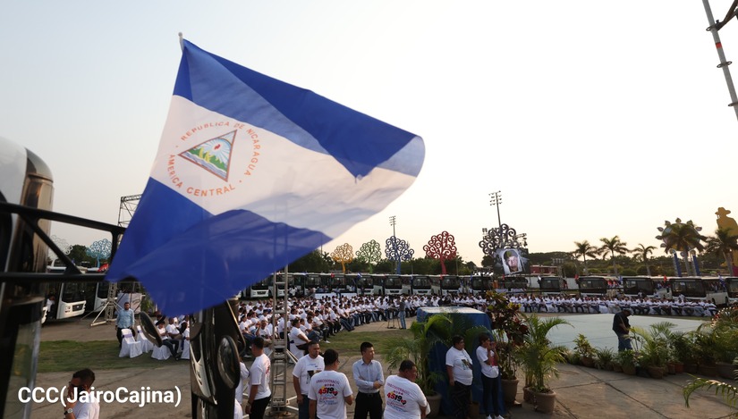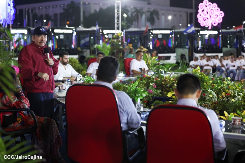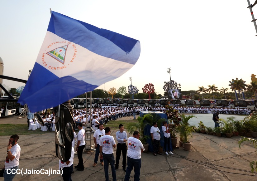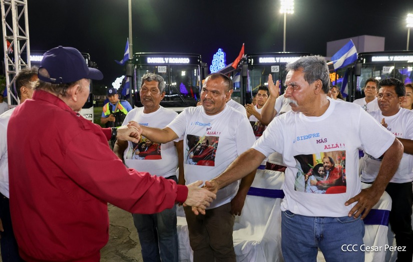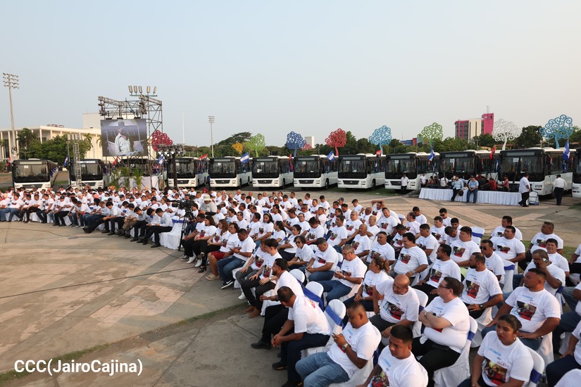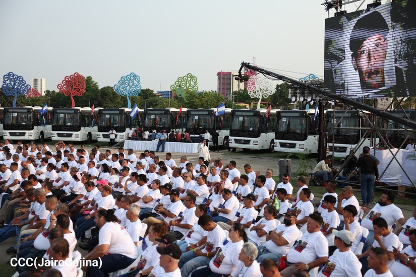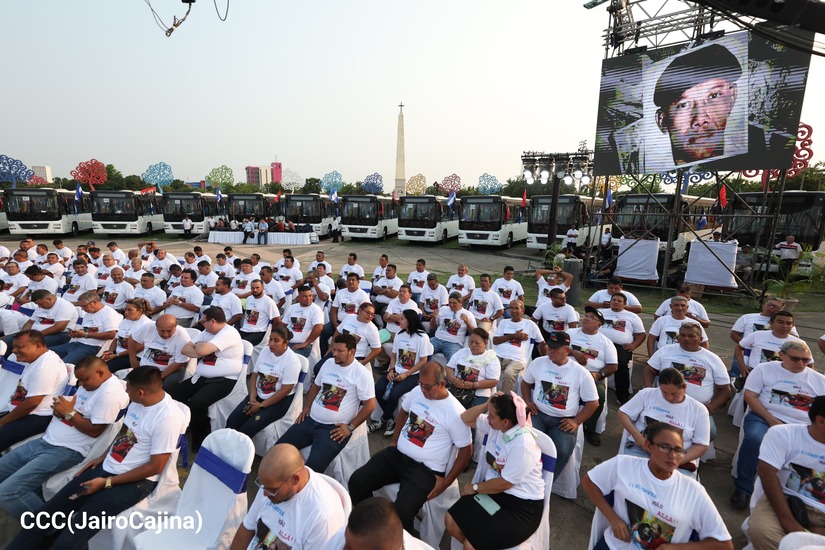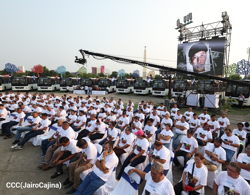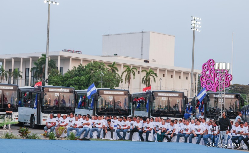 El Presidente de la República, Comandante Daniel Ortega y la Vicepresidenta Compañera Rosario Murillo, presiden el acto de la entrega de autobuses provenientes de la República Popular China a transportistas de las cooperativas de Managua, en conmemoración al Comandante Germán Pomares Ordóñez.