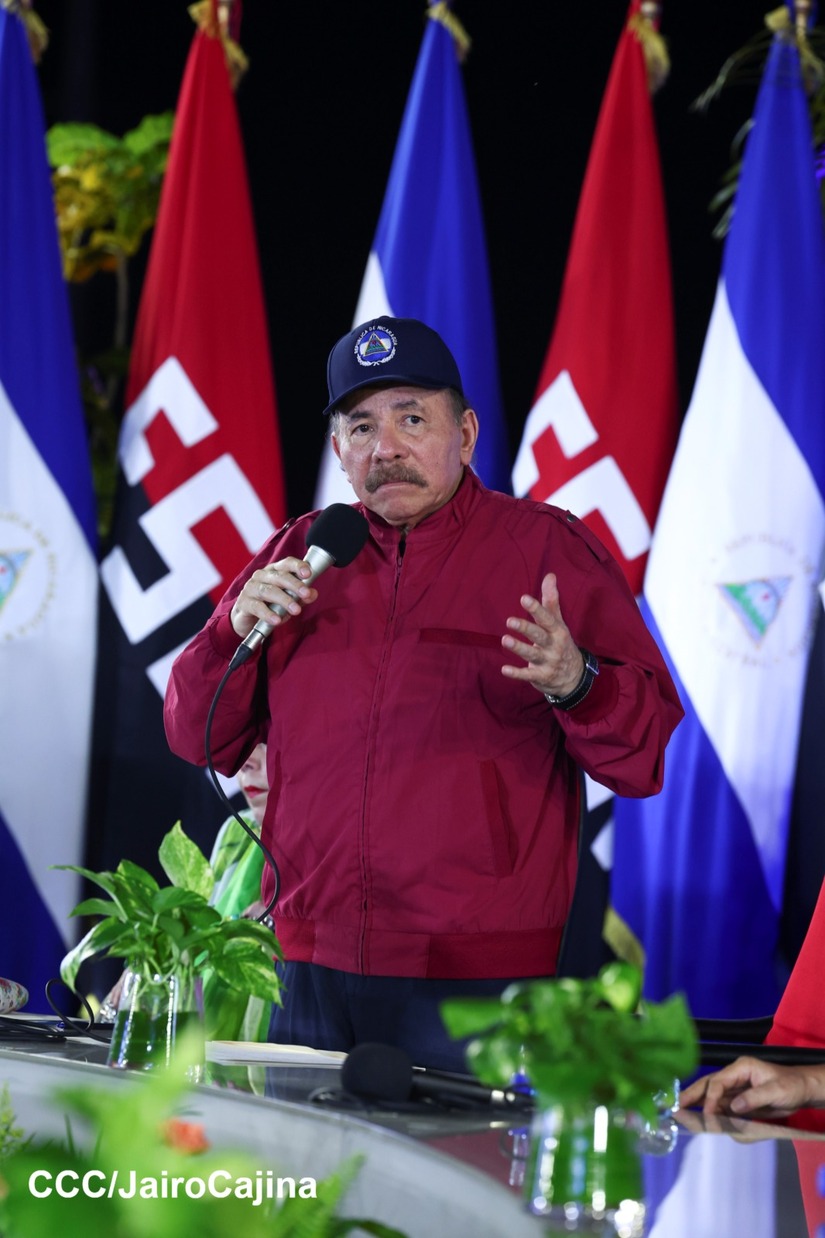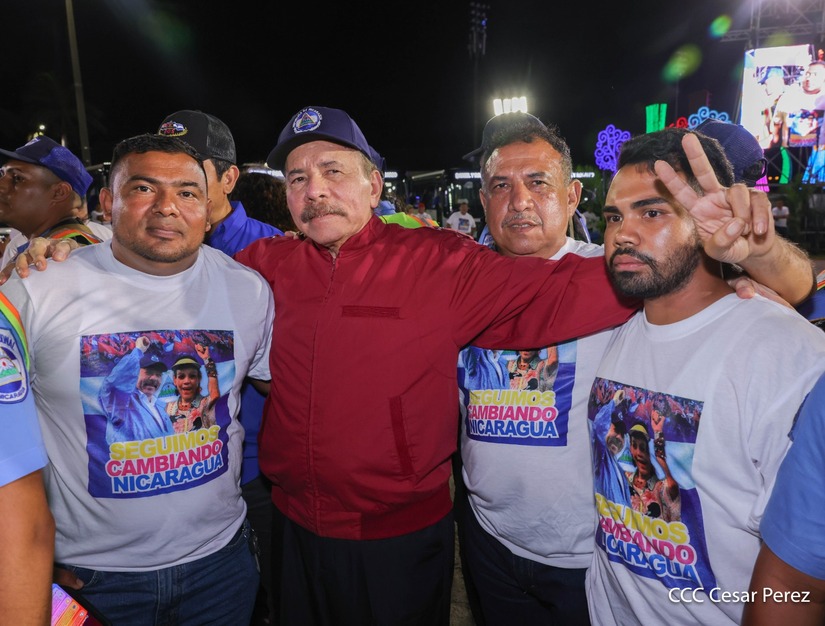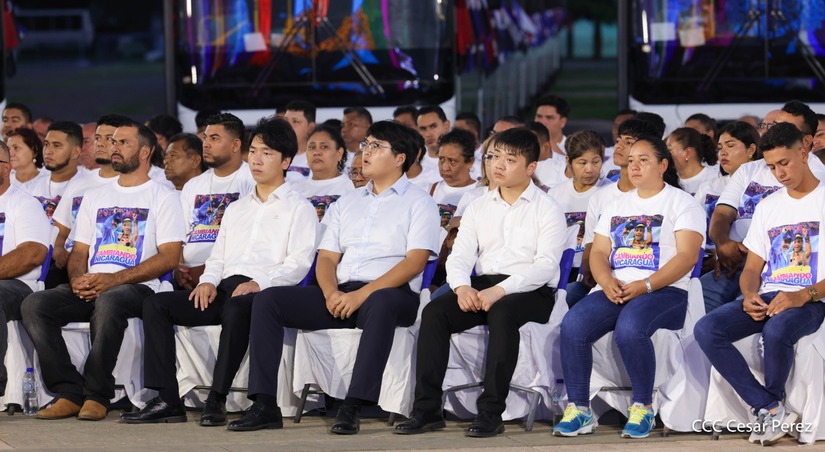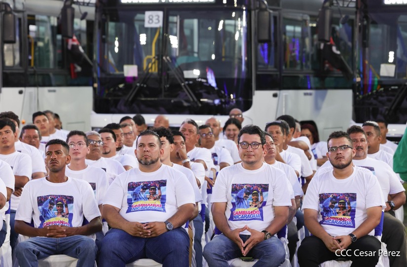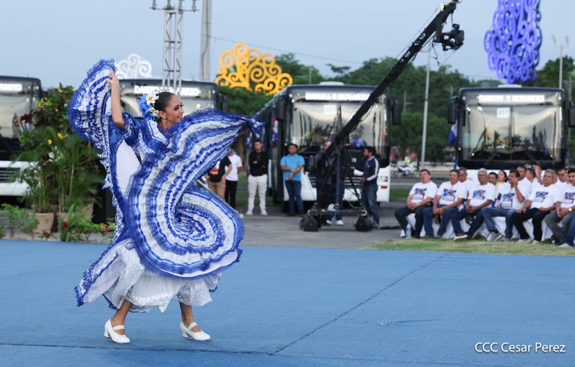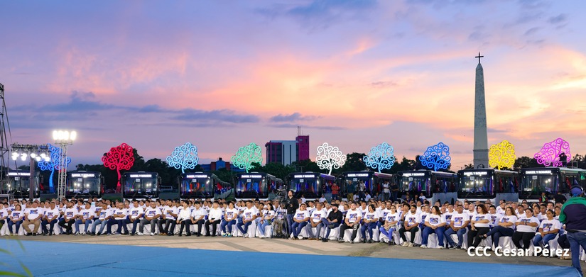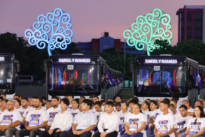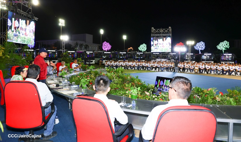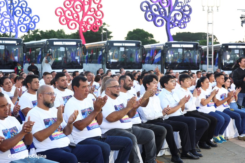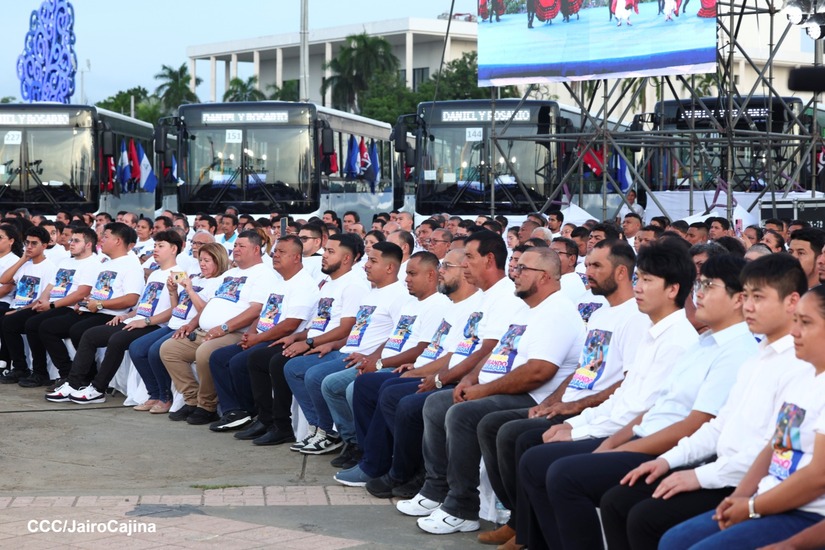 El Presidente de la República, Comandante Daniel Ortega y la Vicepresidenta Compañera Rosario Murillo, presiden el acto de la entrega de 250 autobuses provenientes de la República Popular China a 28 cooperativas de Managua, en saludo al 45 aniversario de la Revolución Popular Sandinista.
