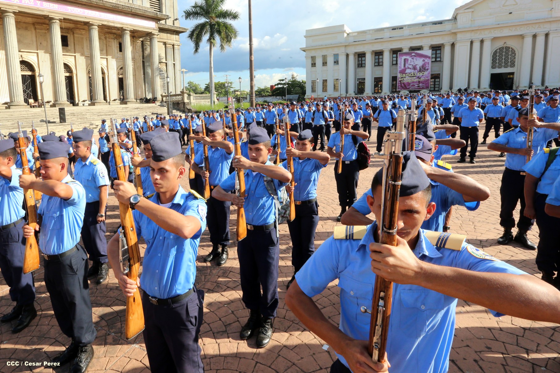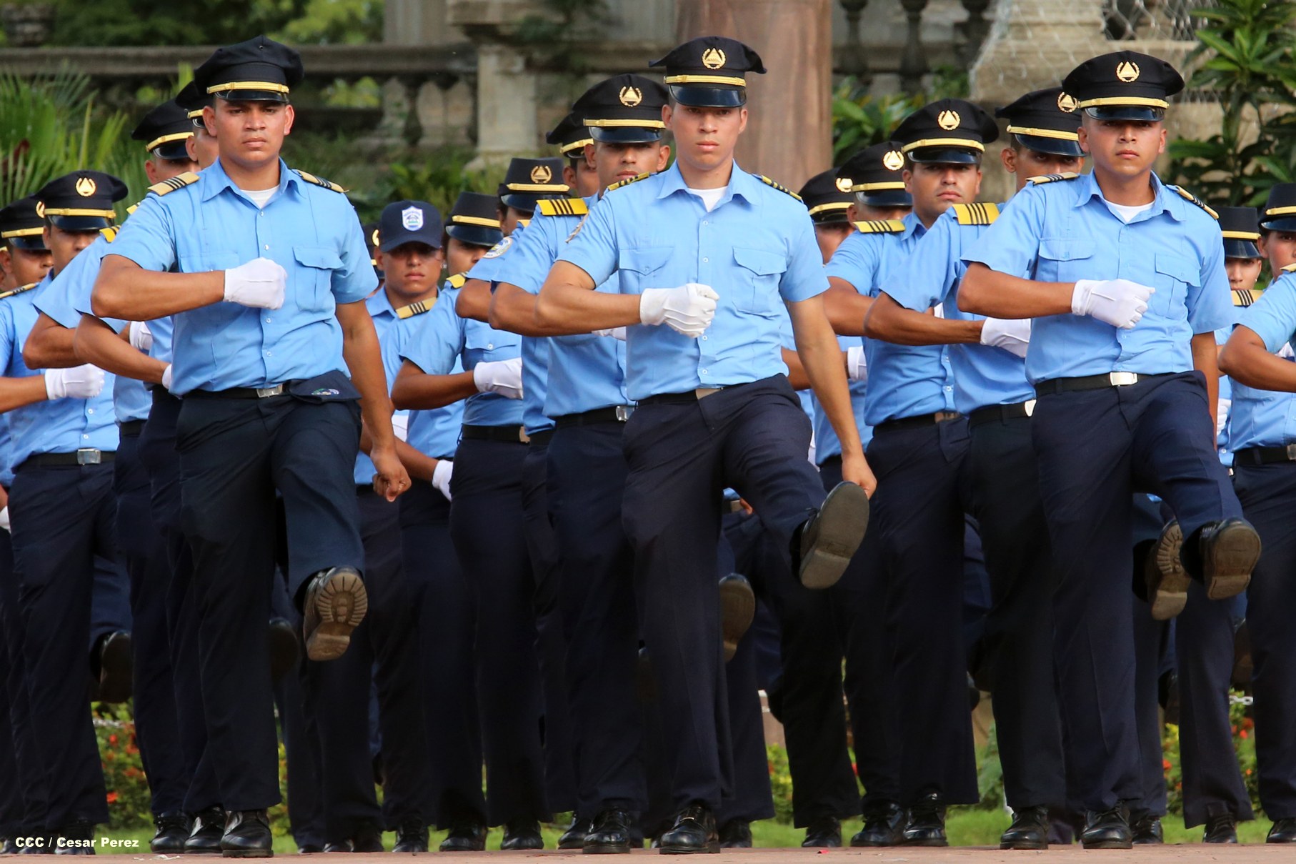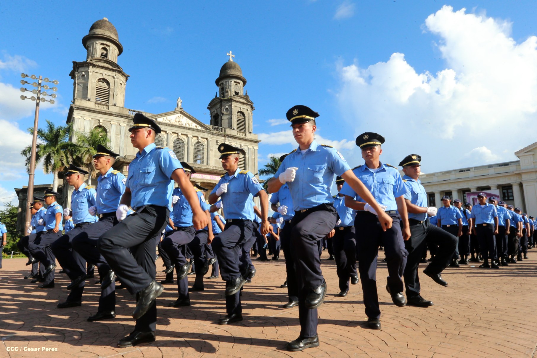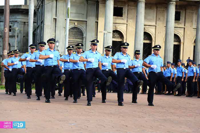 Cadetes de la Policía Nacional practican en la Plaza de la Revolución (Managua) previo al Acto Oficial de Graduación que será presidido por el Comandante Daniel Ortega.