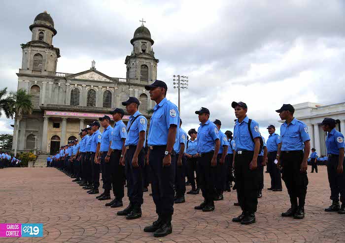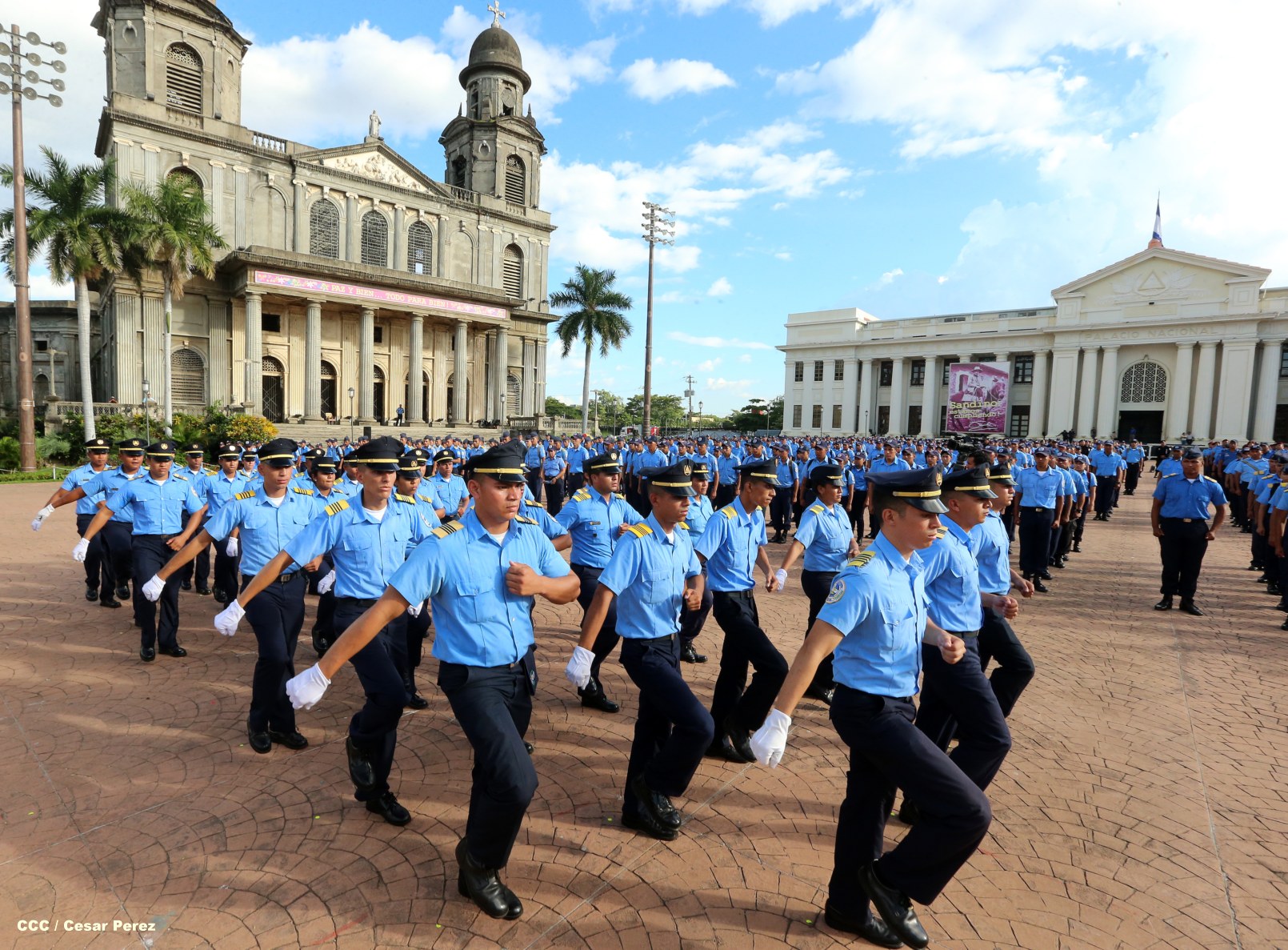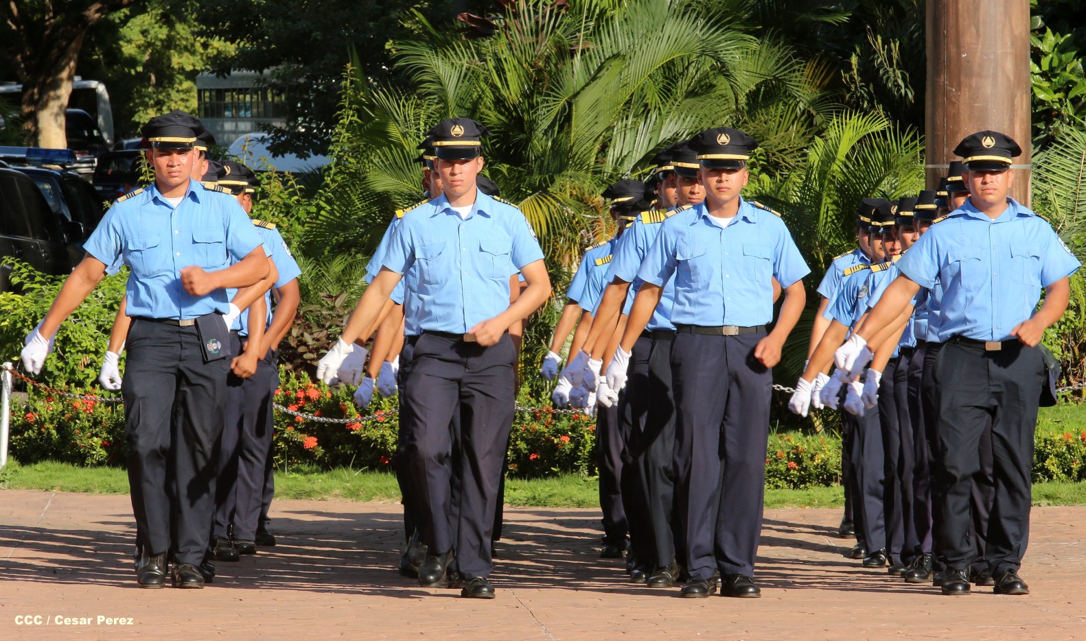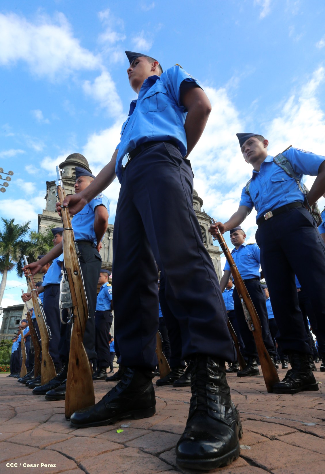 Cadetes de la Policía Nacional practican en la Plaza de la Revolución (Managua) previo al Acto Oficial de Graduación que será presidido por el Comandante Daniel Ortega.