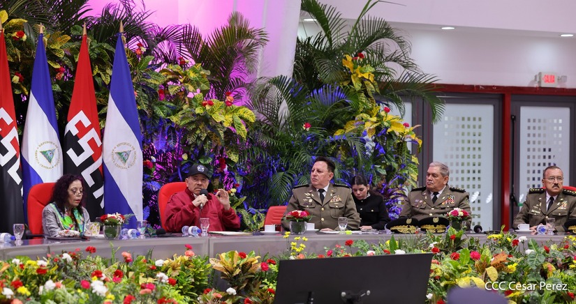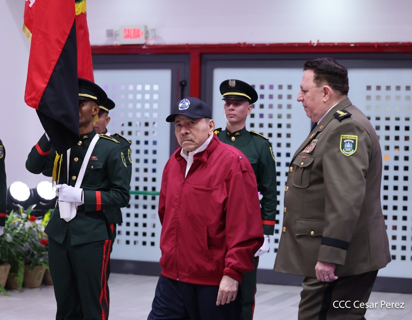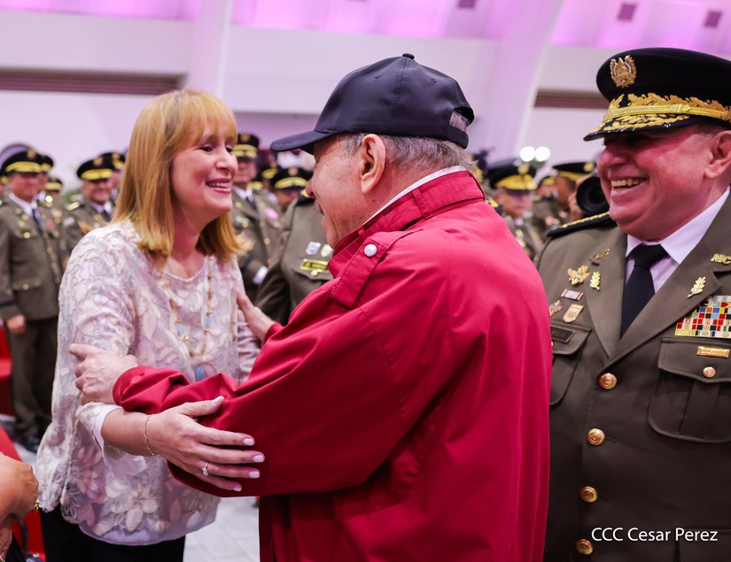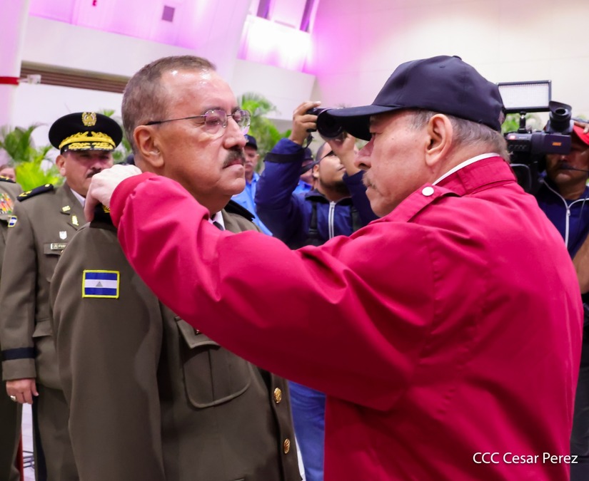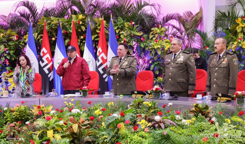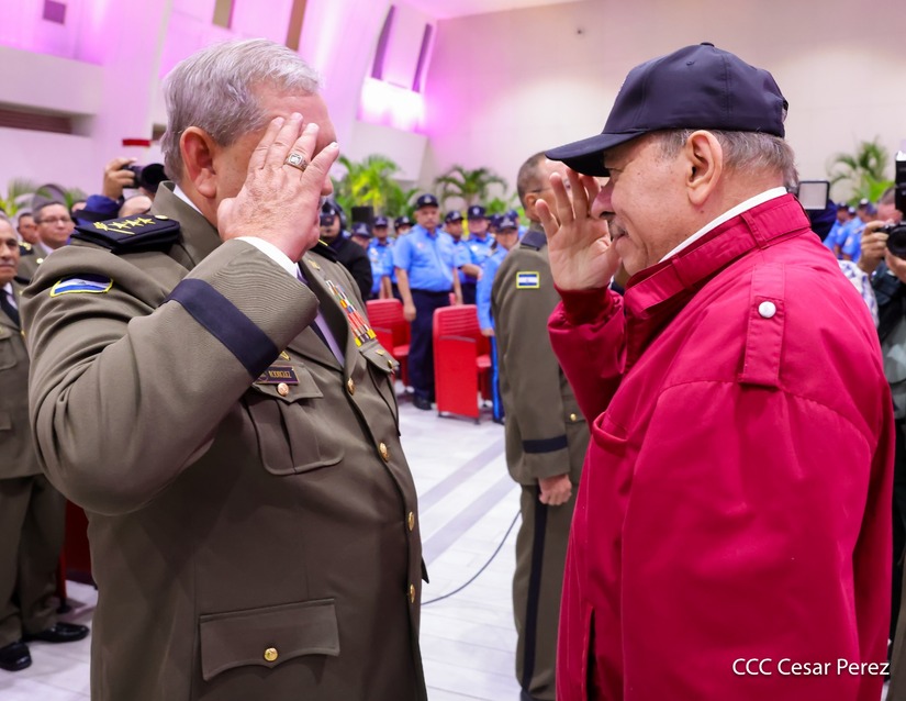 El Copresidente de la República y Jefe Supremo del Ejército de Nicaragua, Comandante Daniel Ortega, junto a la Copresidenta Compañera Rosario Murillo, presiden el solemne acto de ascenso al grado de Coronel General de los Mayores Generales Bayardo Ramón Rodríguez, Jefe del Estado Mayor General, y Marvin Elías Corrales Rodríguez, Inspector General del Ejército de Nicaragua.
