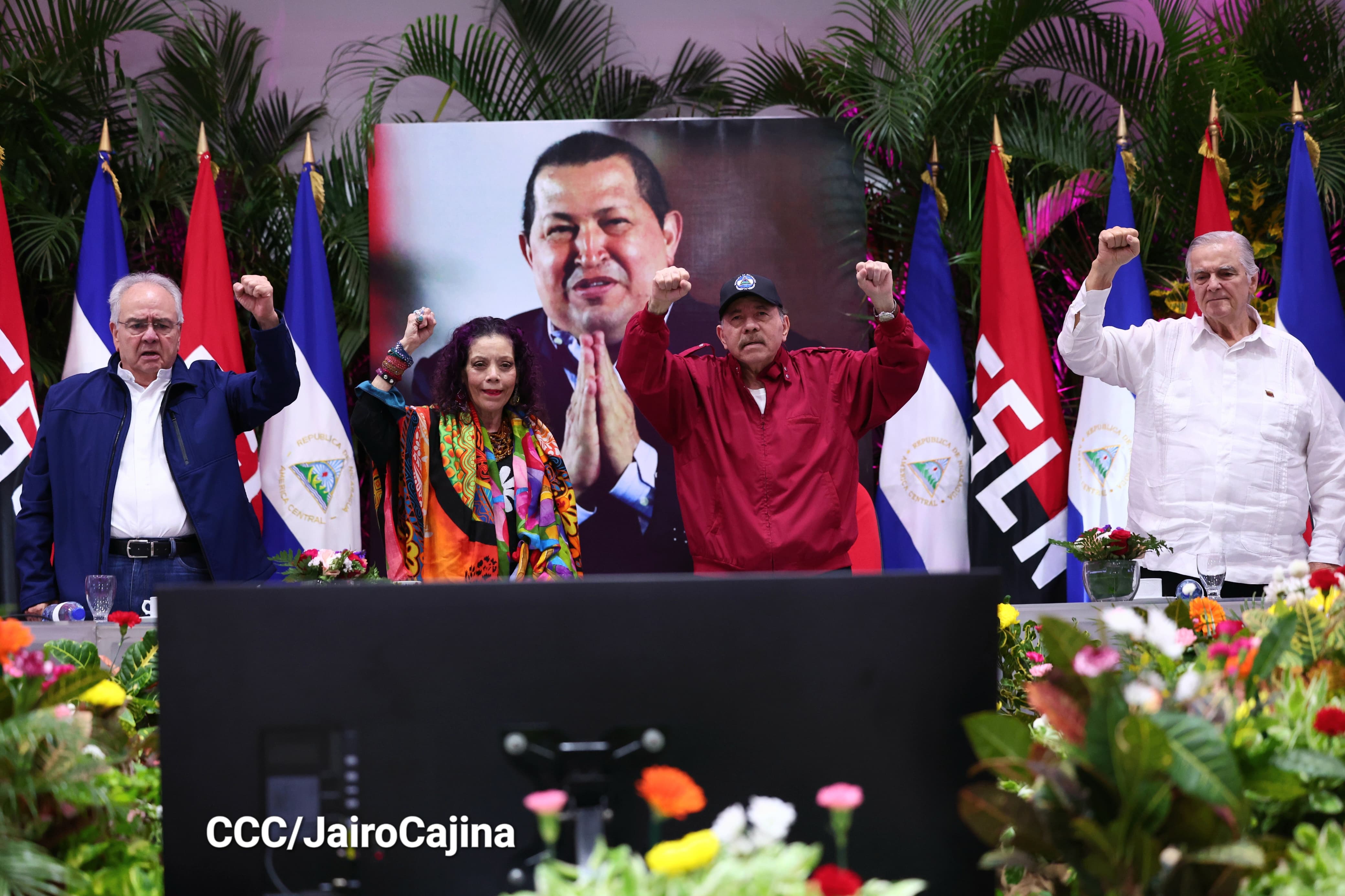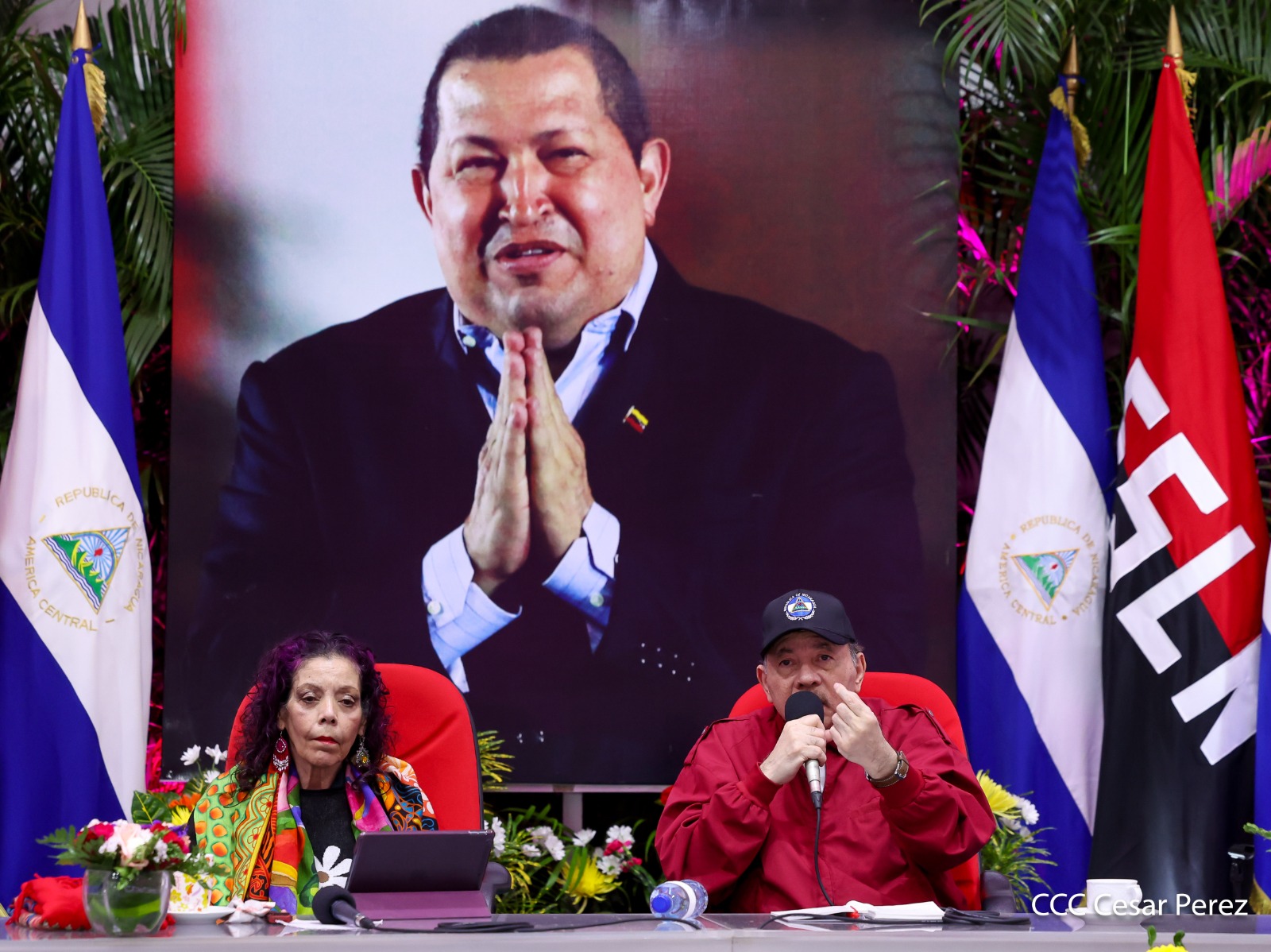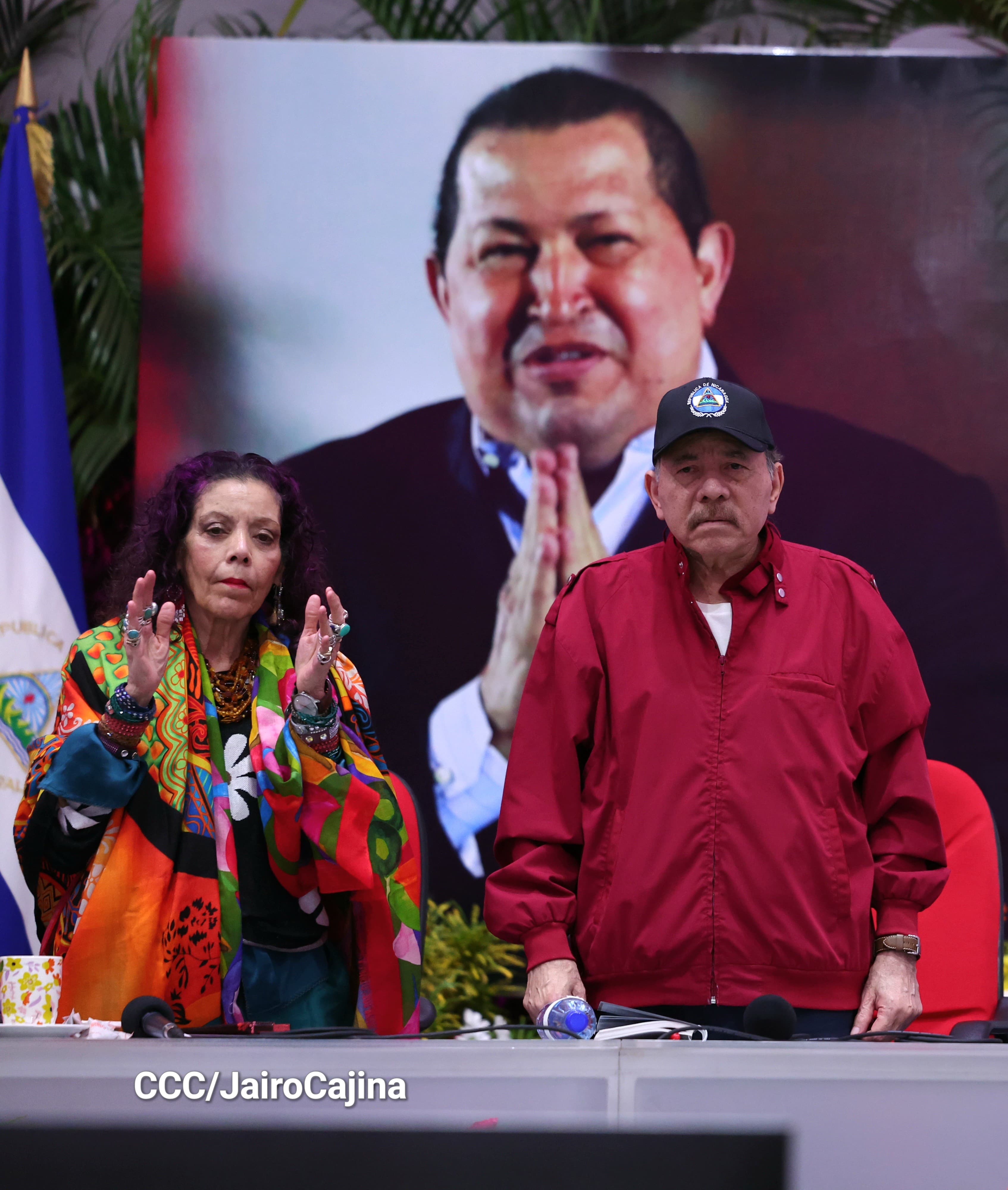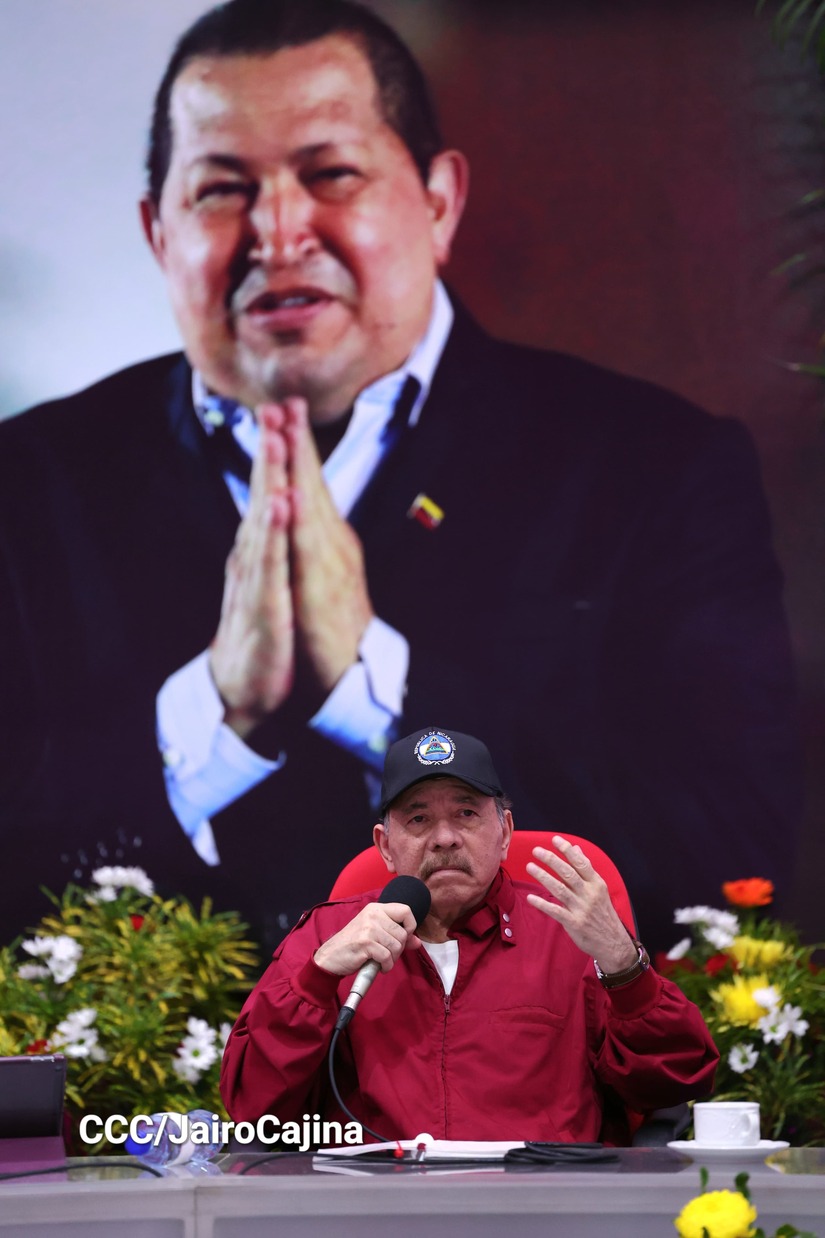 En el Centro de Convenciones Olof Palme, los Copresidentes de Nicaragua, Comandante Daniel Ortega y Compañera Rosario Murillo, encabezan esta tarde-noche el acto de celebración del 71 aniversario natal del Comandante Eterno Hugo Chávez Frías.