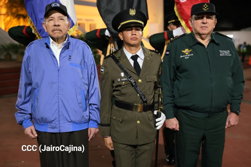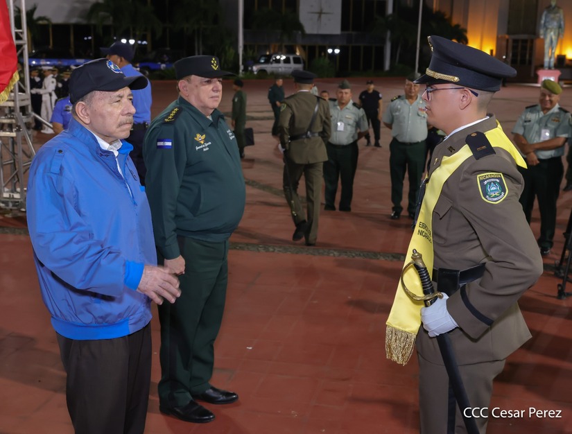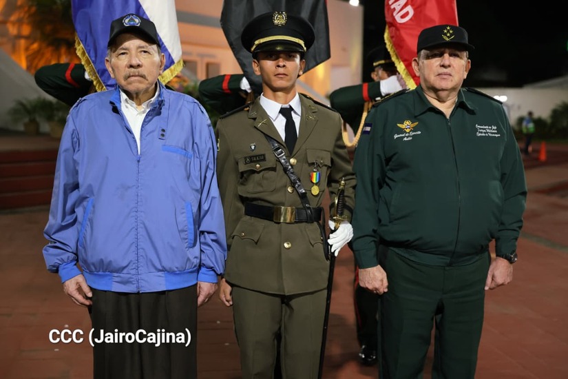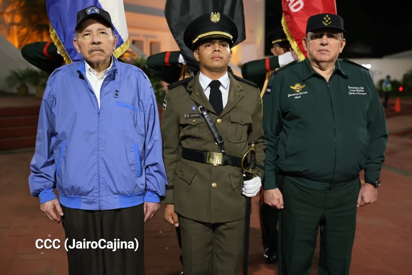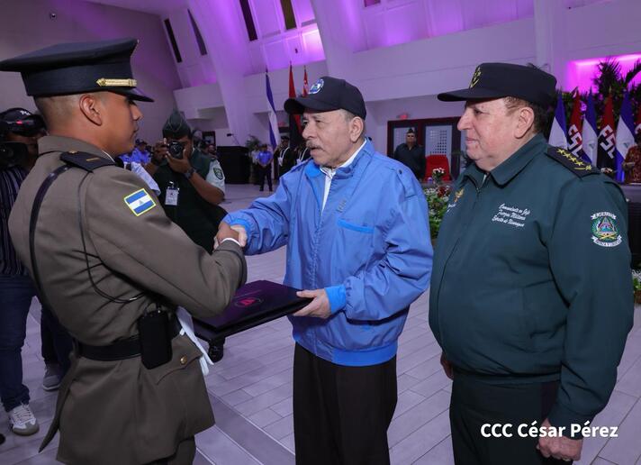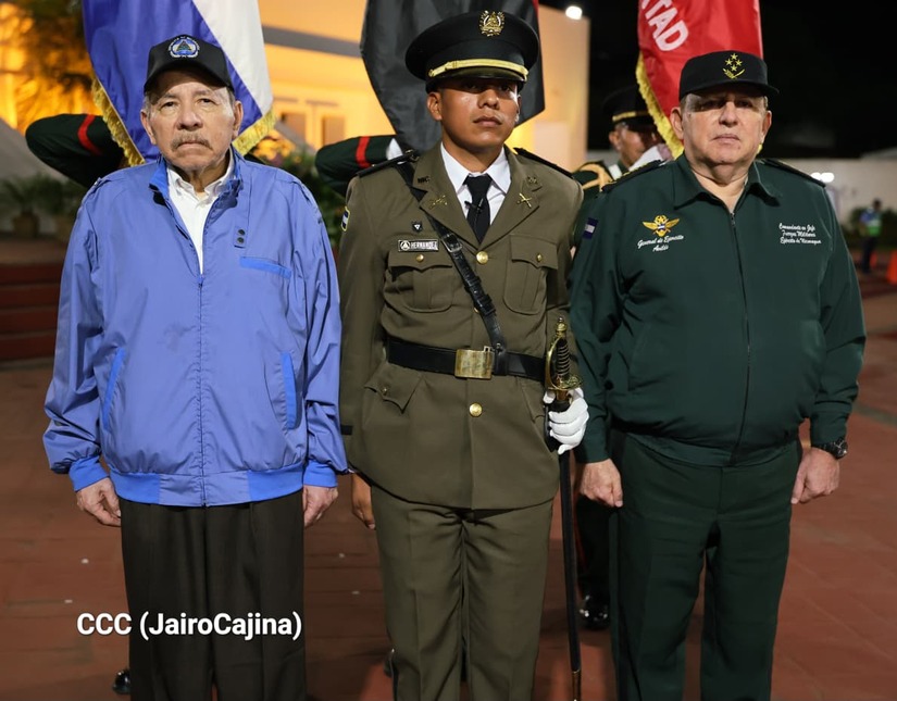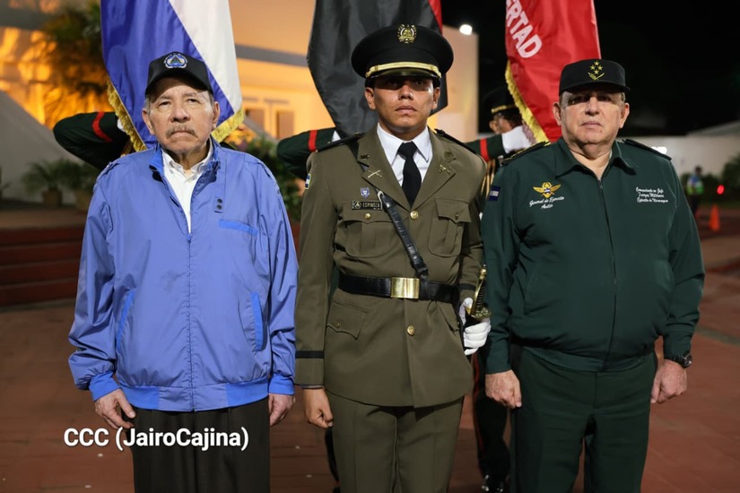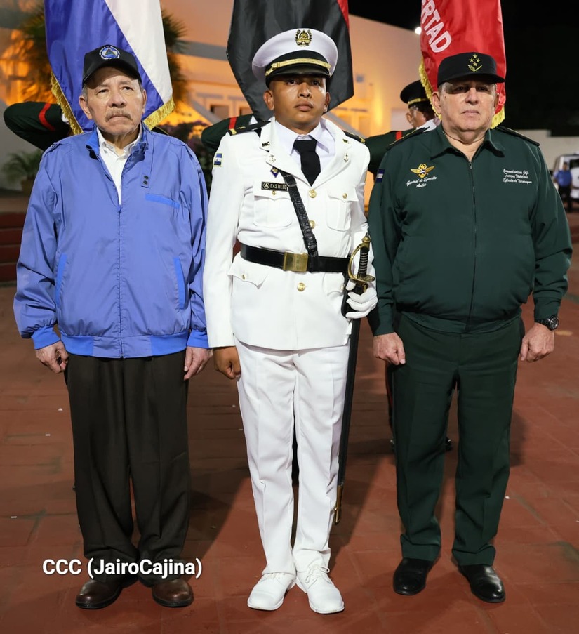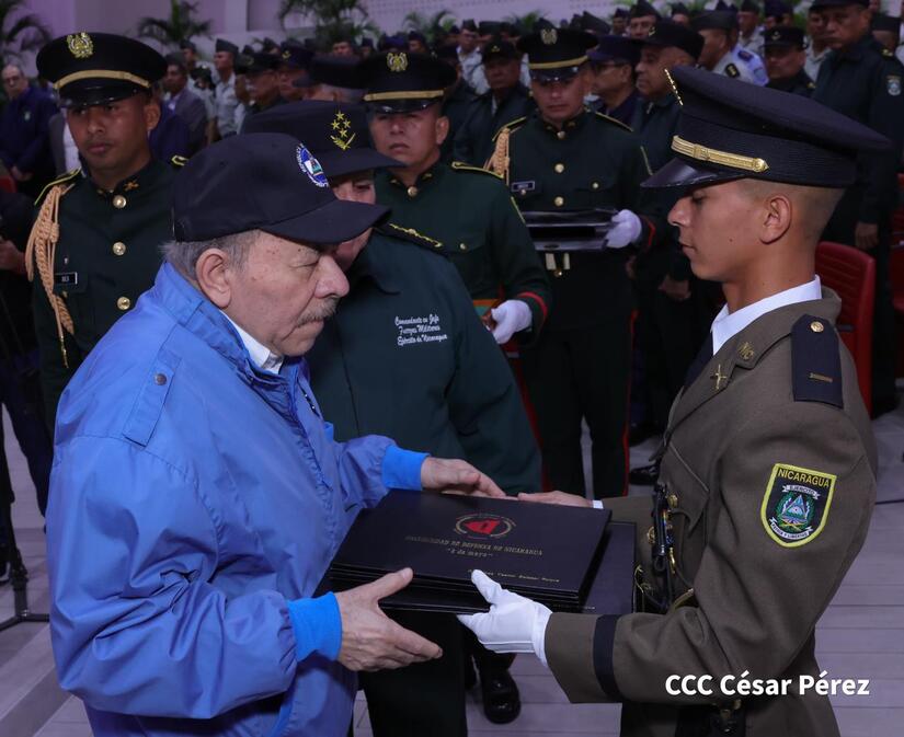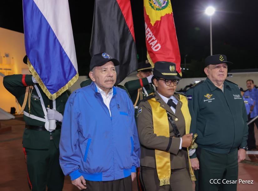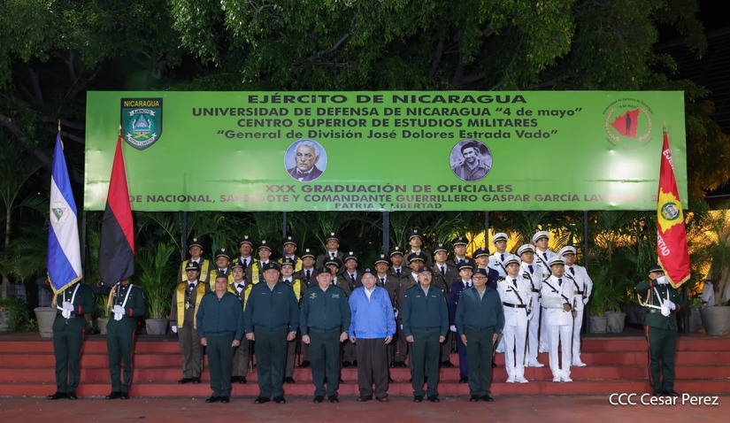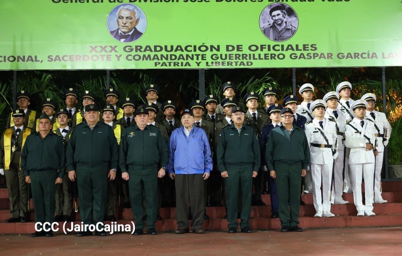 Los Copresidentes de la República, Comandante Daniel Ortega Saavedra y la Compañera Rosario Murillo, presiden junto al General de Ejército Julio César Avilés Castillo, la XXX Graduación de Cadetes del Centro Superior de Estudios Militares "General de División José Dolores Estrada Vado".
