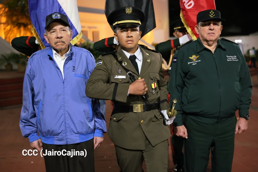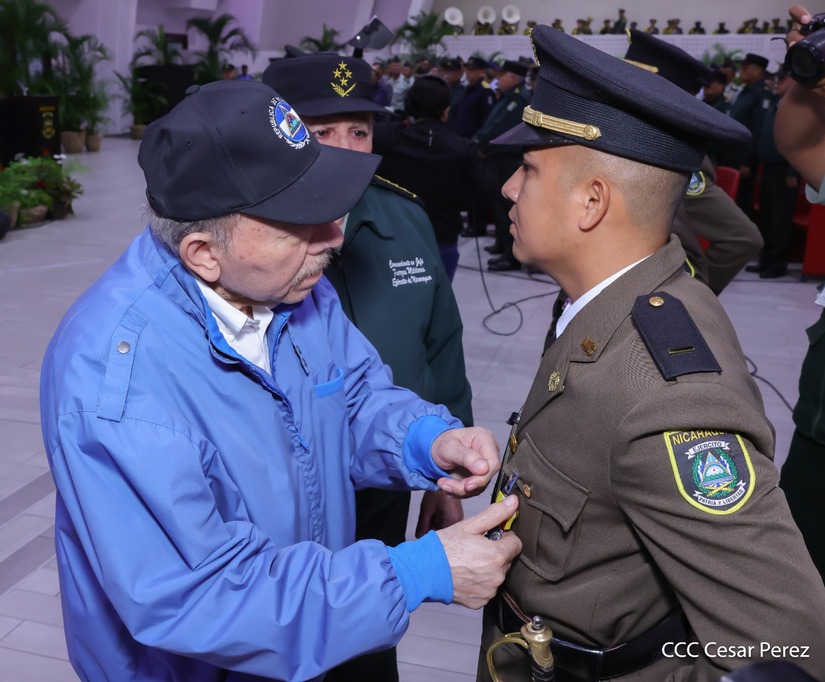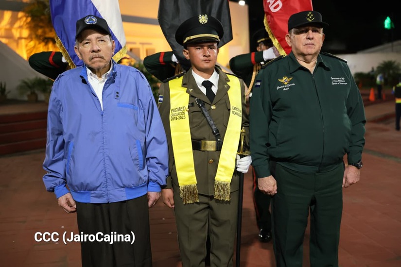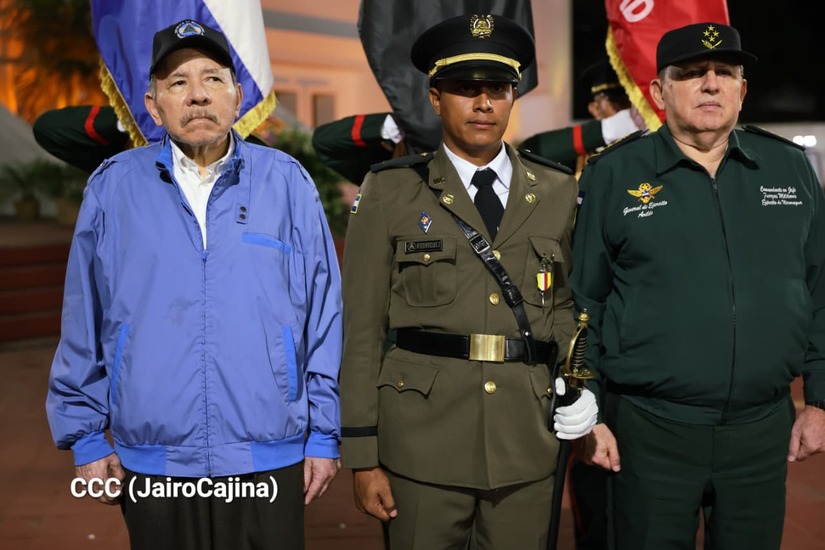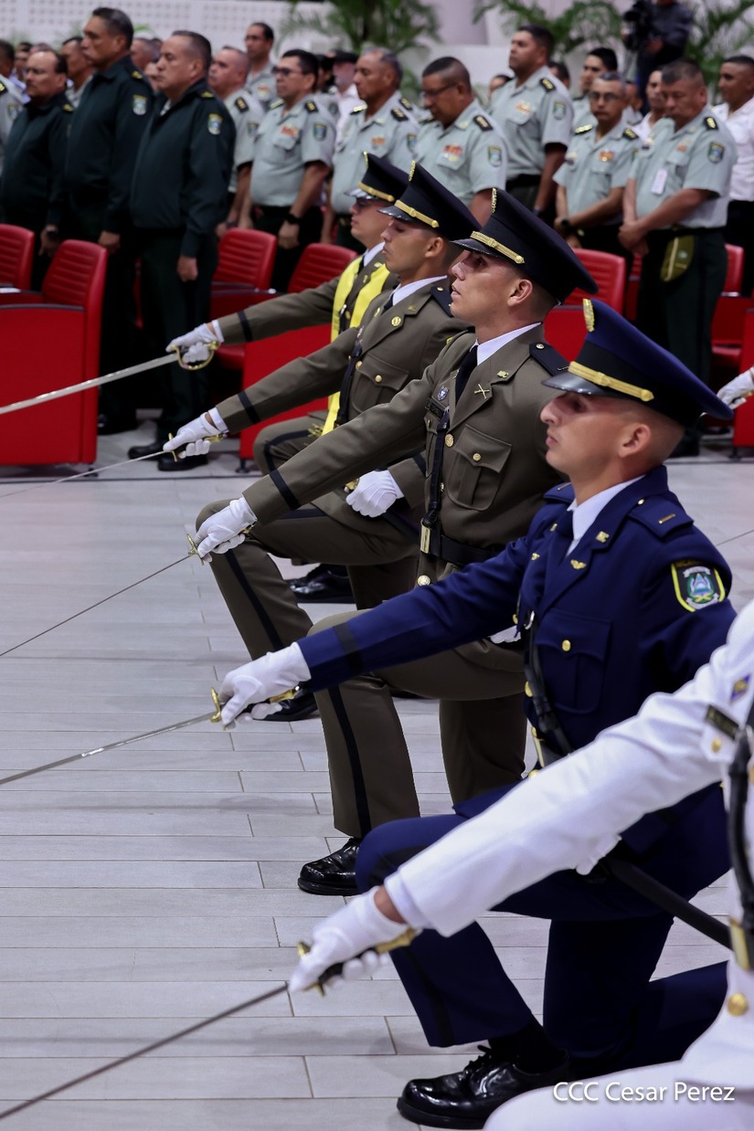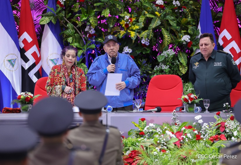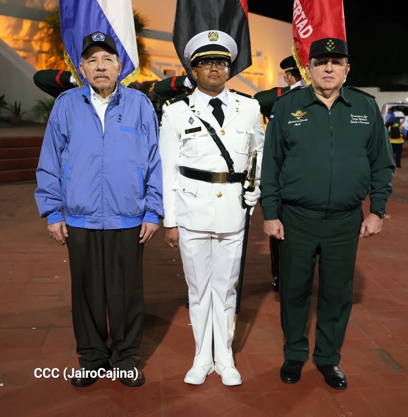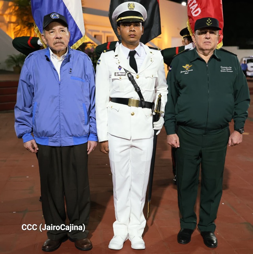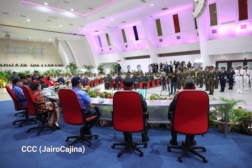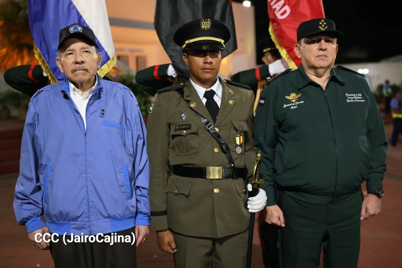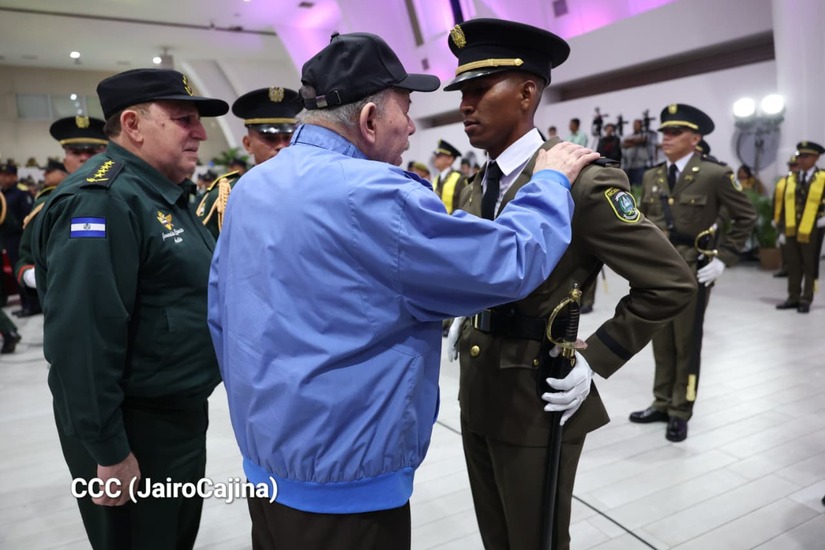 Los Copresidentes de la República, Comandante Daniel Ortega Saavedra y la Compañera Rosario Murillo, presiden junto al General de Ejército Julio César Avilés Castillo, la XXX Graduación de Cadetes del Centro Superior de Estudios Militares "General de División José Dolores Estrada Vado".