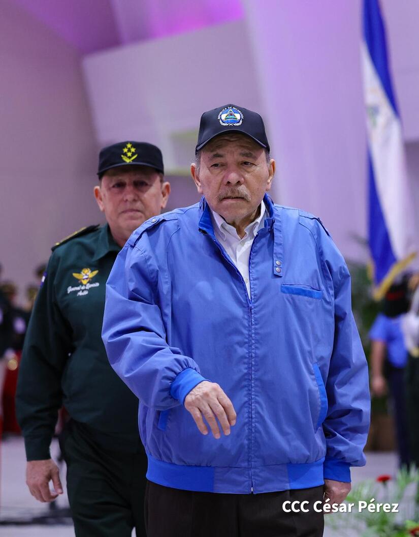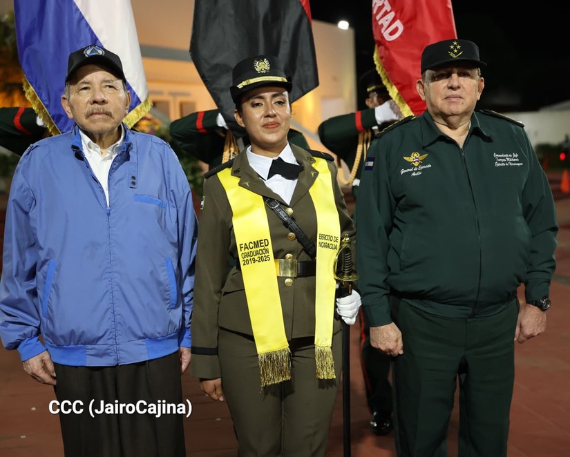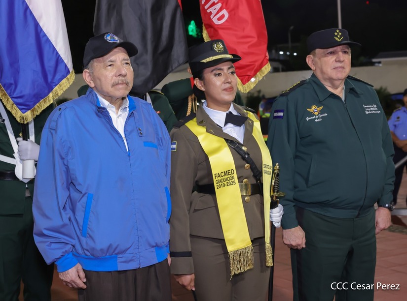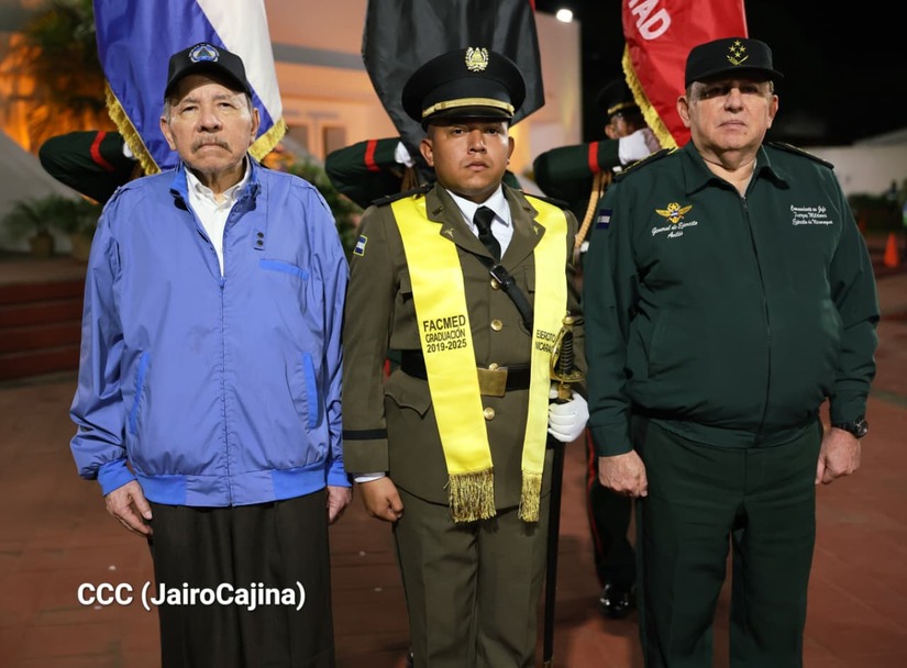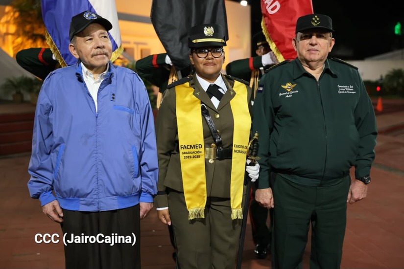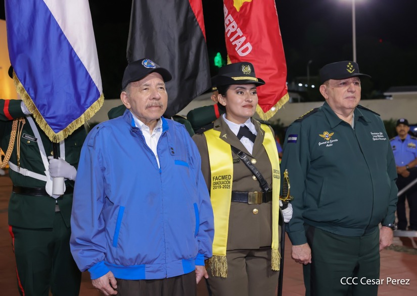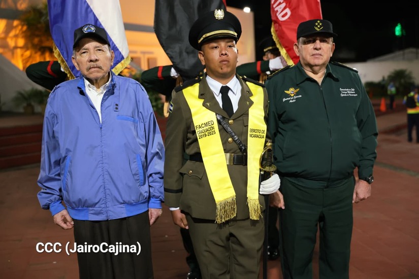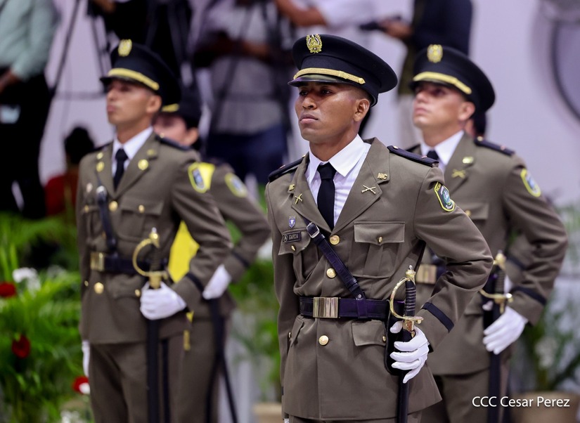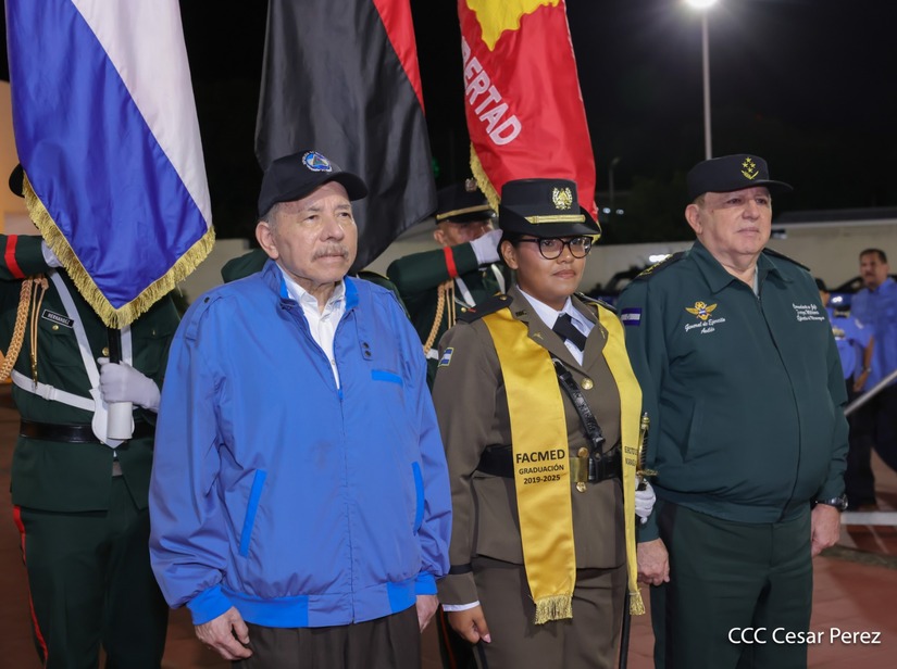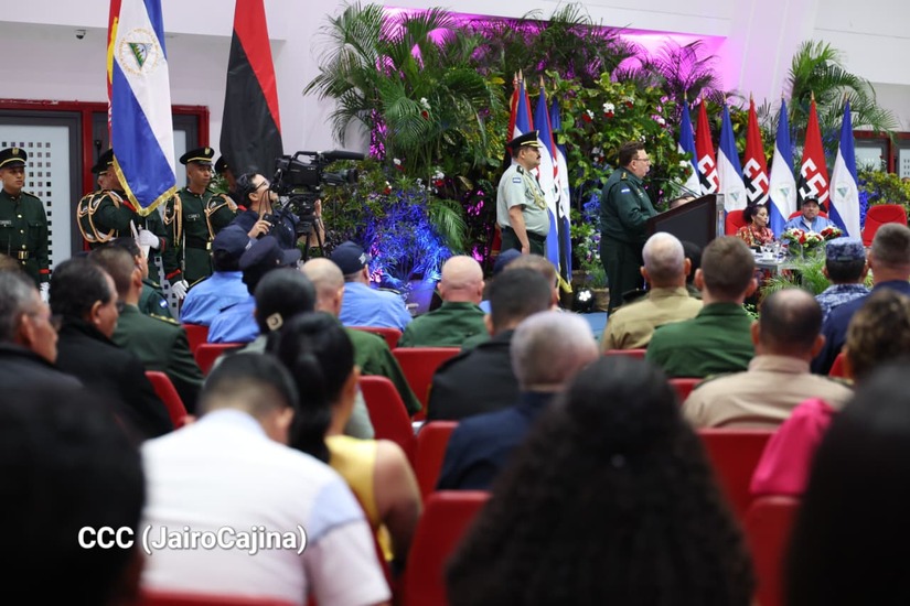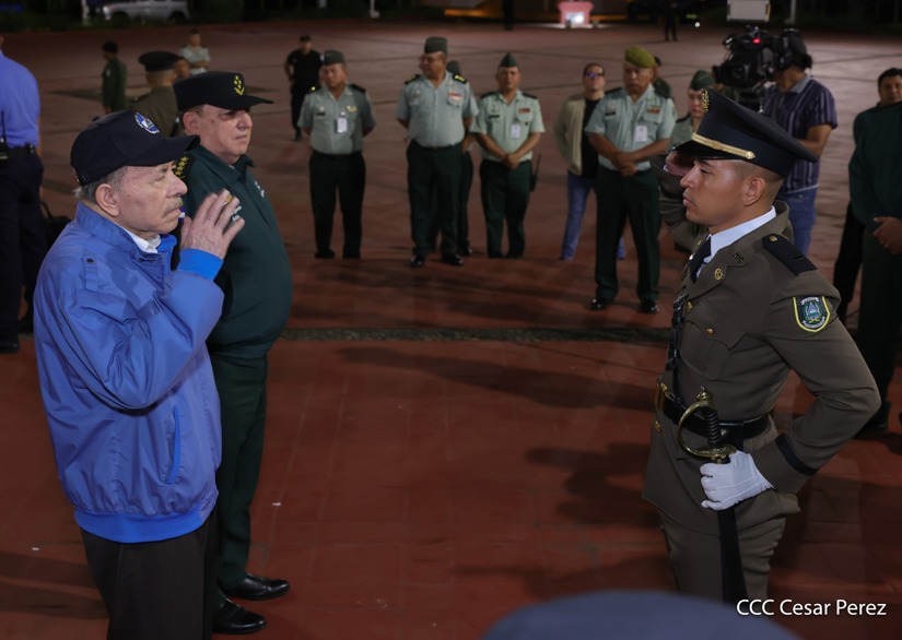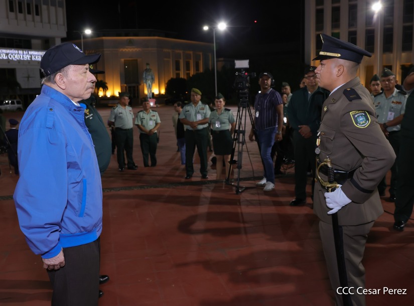 Los Copresidentes de la República, Comandante Daniel Ortega Saavedra y la Compañera Rosario Murillo, presiden junto al General de Ejército Julio César Avilés Castillo, la XXX Graduación de Cadetes del Centro Superior de Estudios Militares "General de División José Dolores Estrada Vado".
