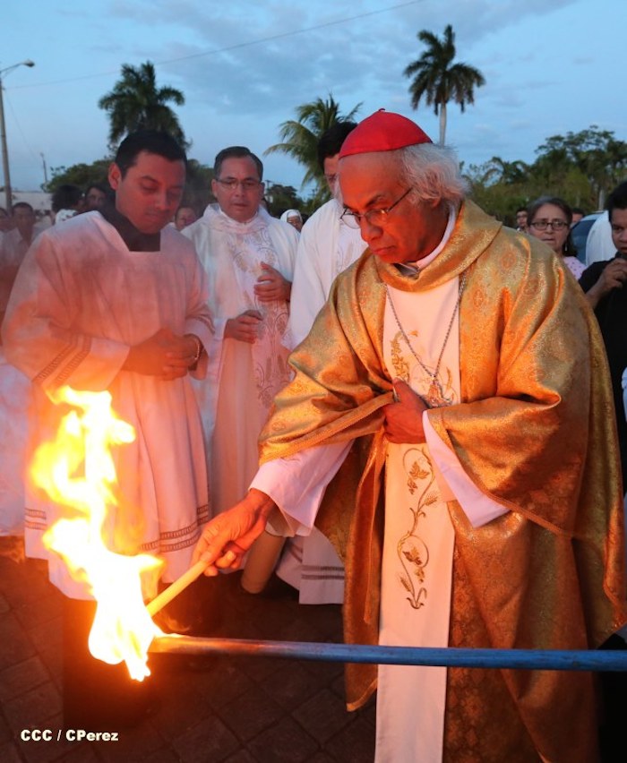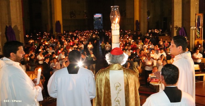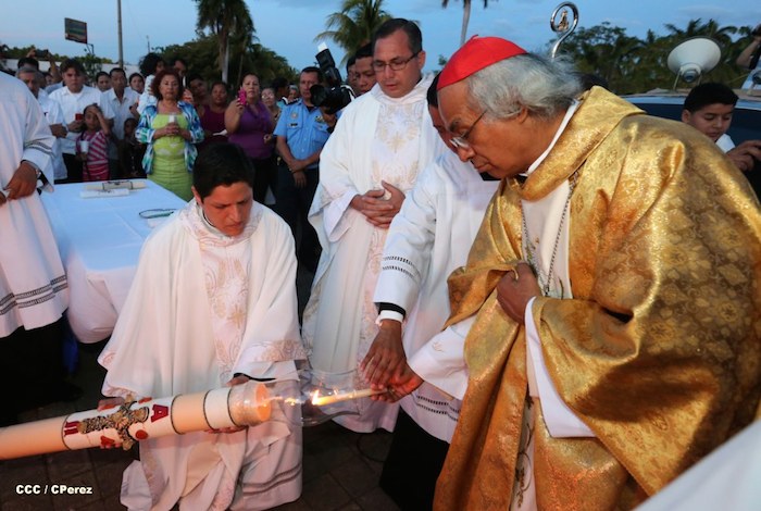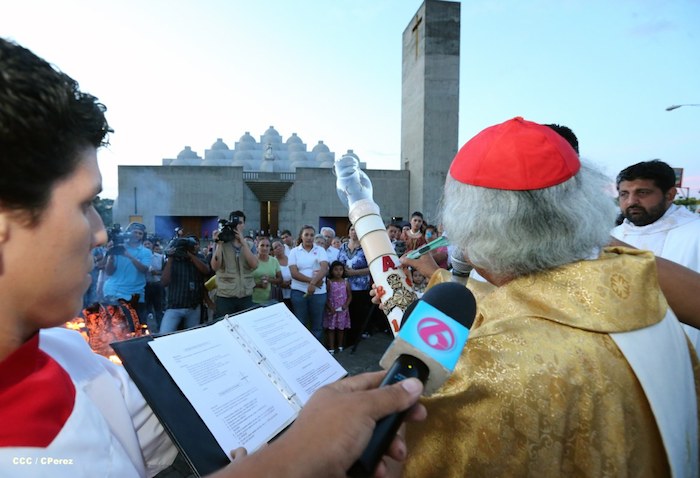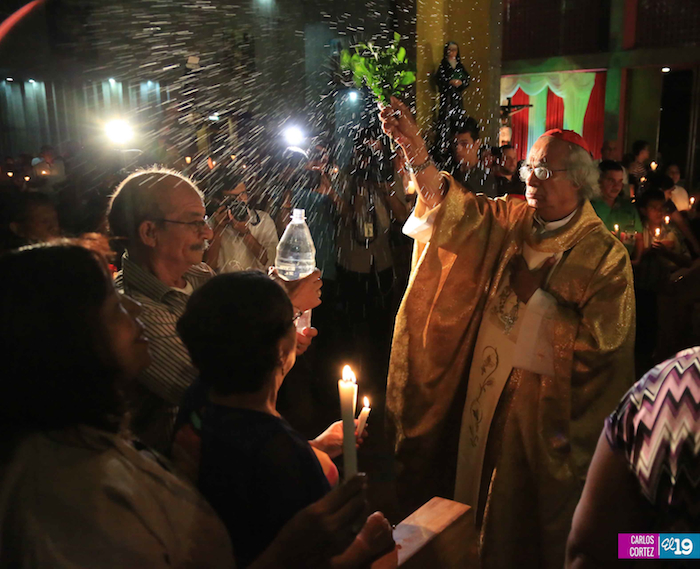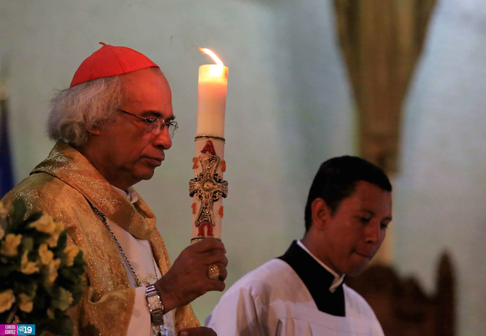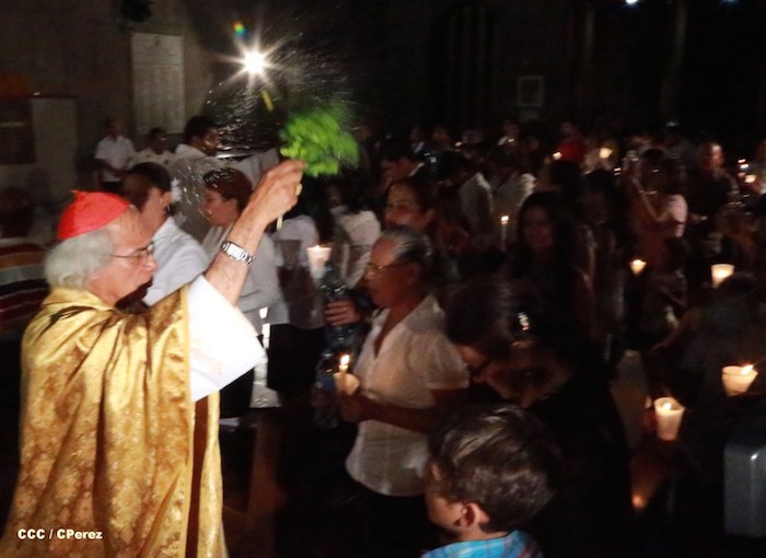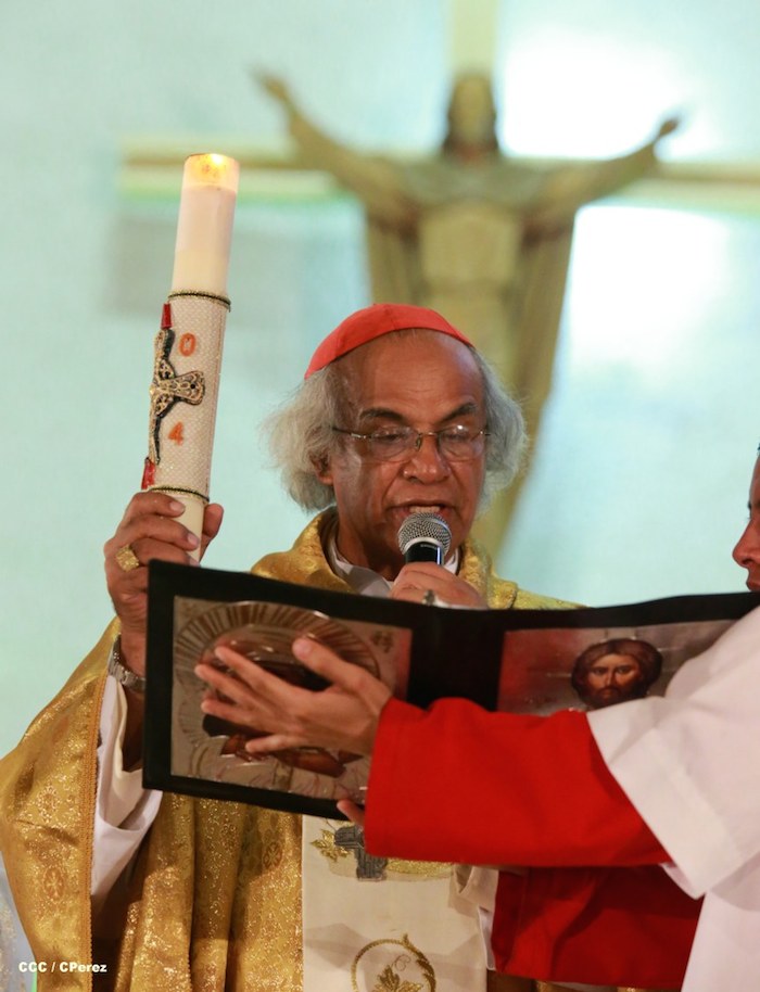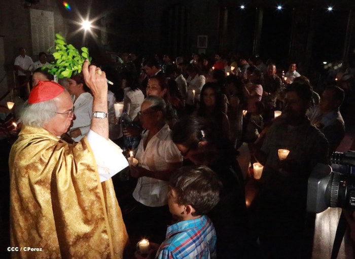 Un bonito y estremecedor mensaje emitió Su Eminencia Reverendísima, Cardenal Leopoldo Brenes, a la feligresía nicaragüense durante la Vigilia de Pascua este sábado santo por la noche. El recién ordenado Cardenal por el Papa Francisco, durante la misa litúrgica, se puso en pie frente a todas las familias católicas y, tomando fuertemente el micrófono, anunció la gran noticia: ¡Cristo ha resucitado!