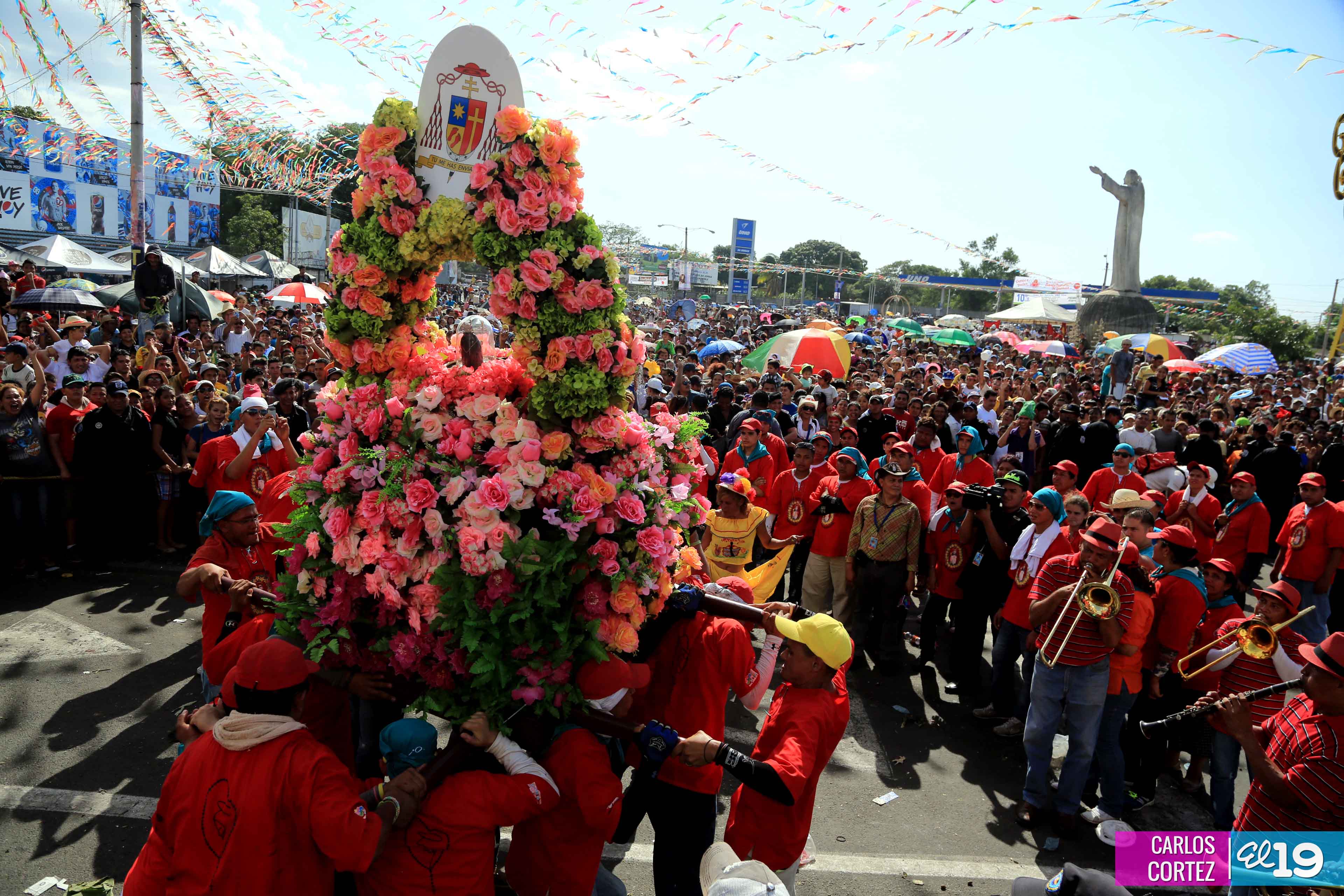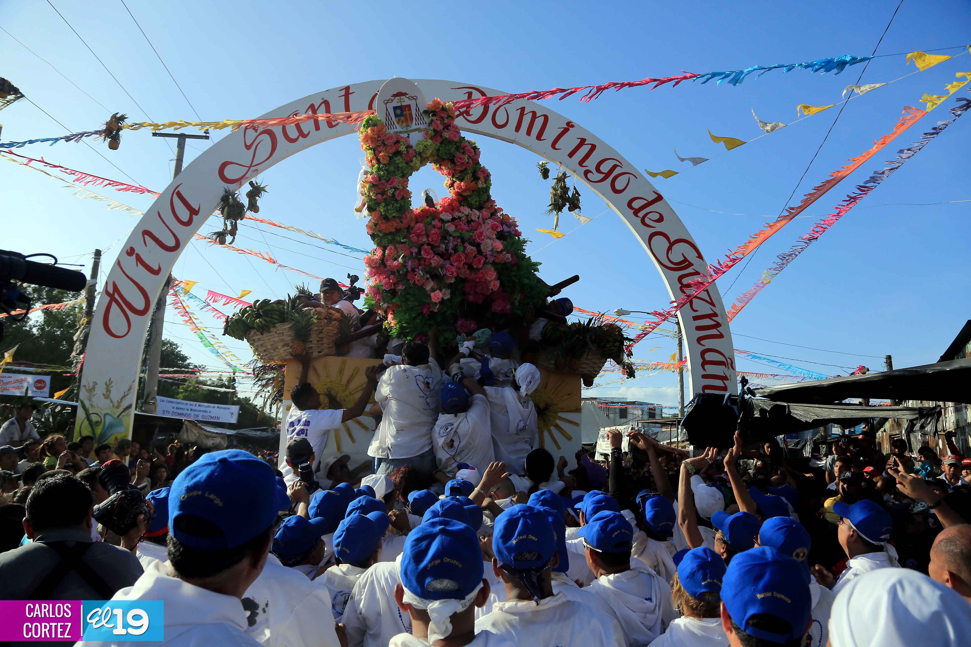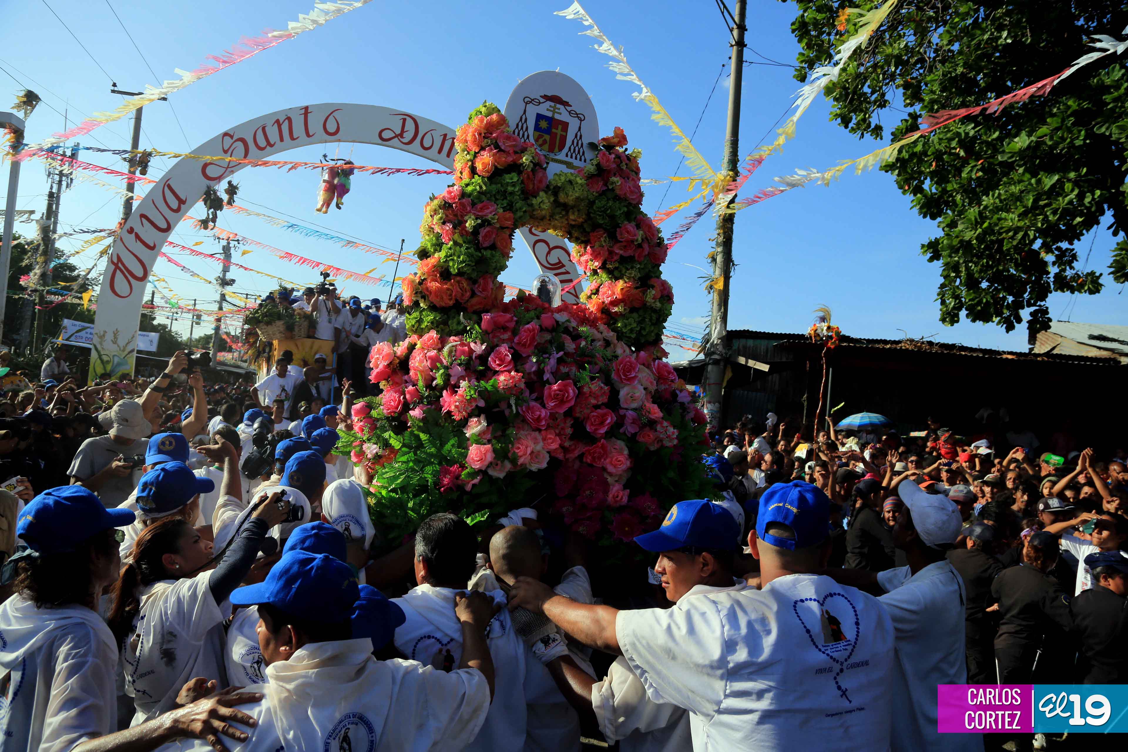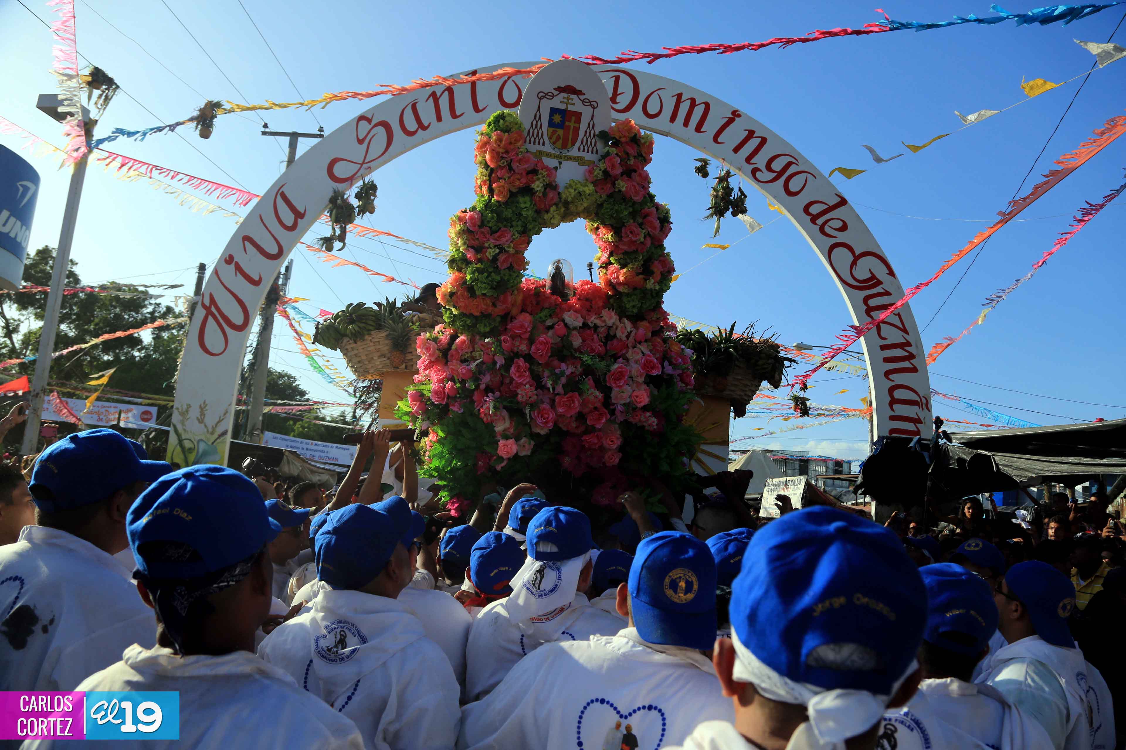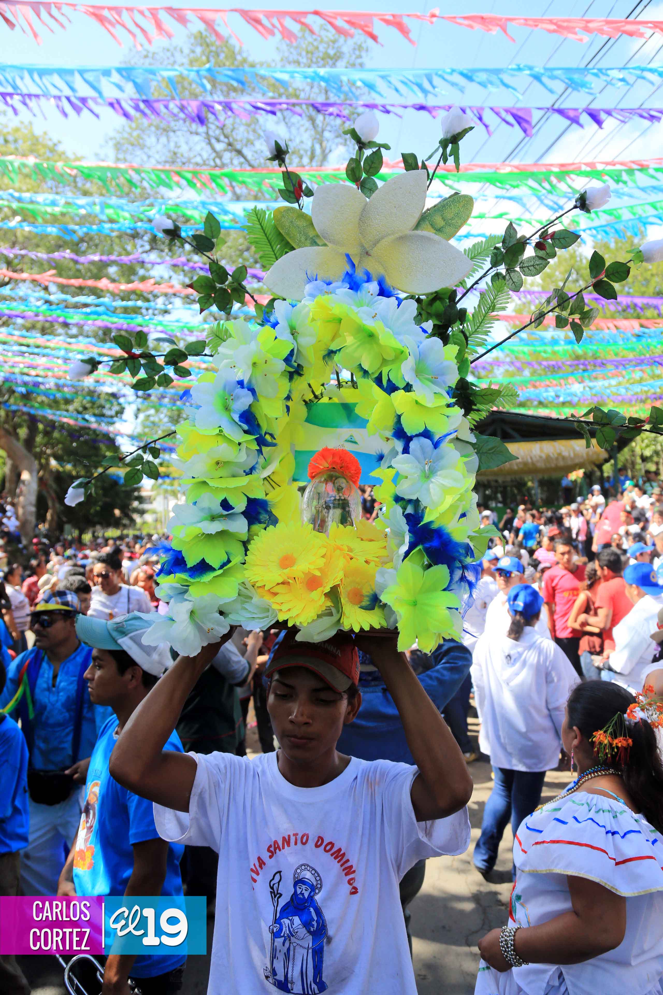 Centenares de miles de nicaragüenses acompañaron por casi 12 horas la llegada de Santo Domingo de Guzmán a Managua, que entre vivas, explosión de cohetes y una algarabía multicolor lo llevaron hasta la Iglesia de su mismo nombre en el sector del barrio 19 de Julio, lugar en que permanecerá los próximos diez días.