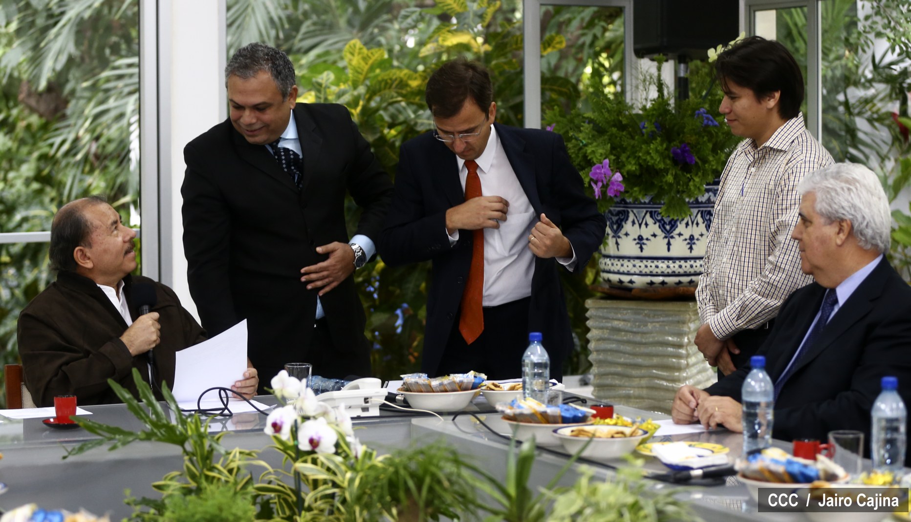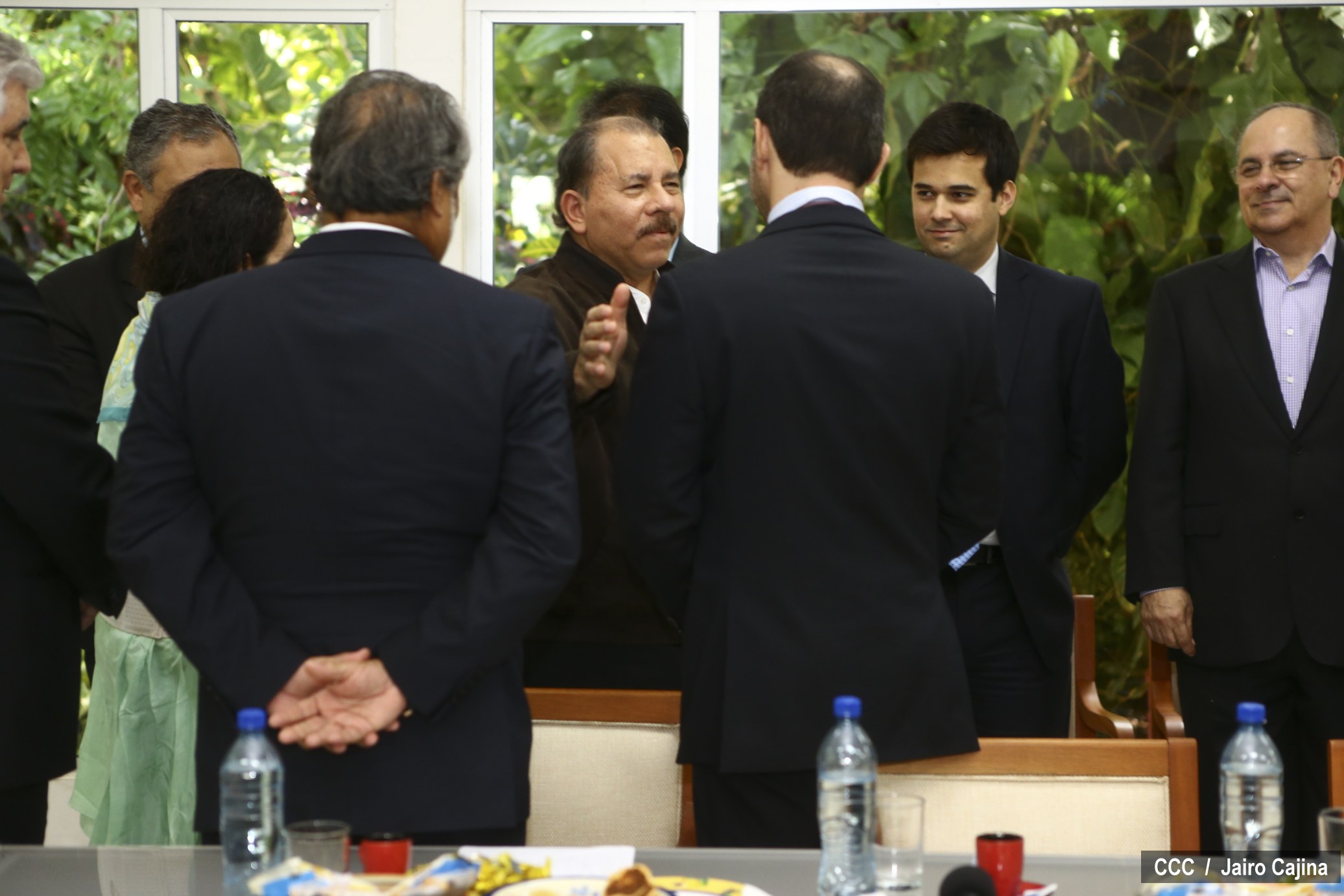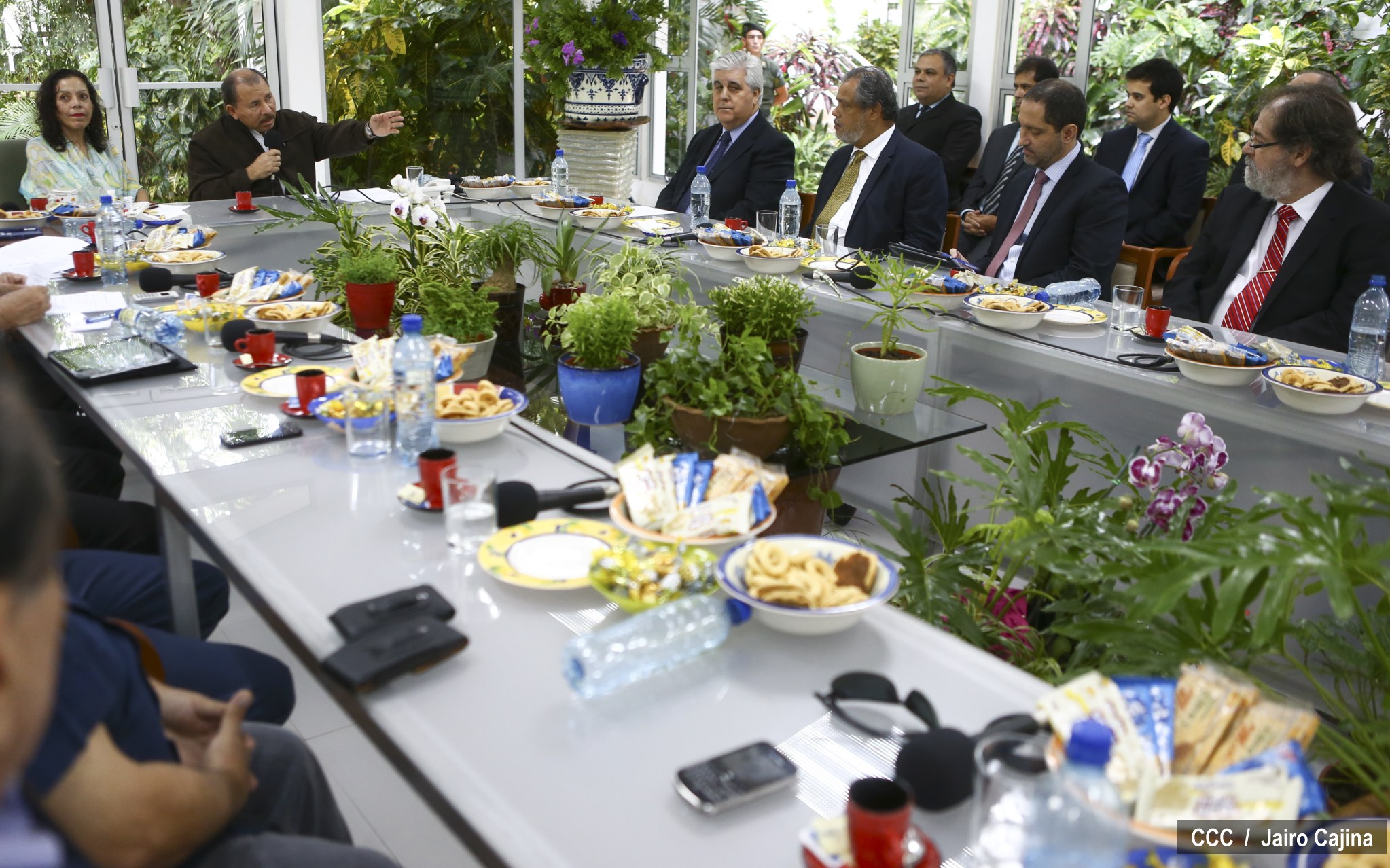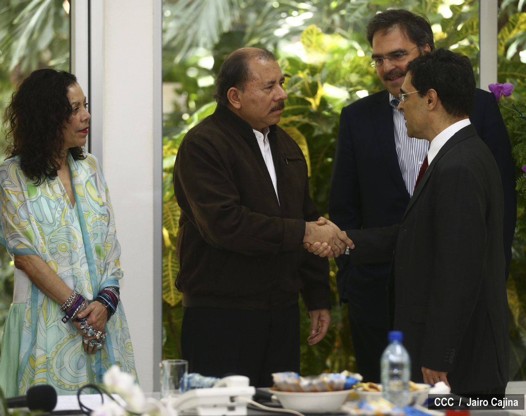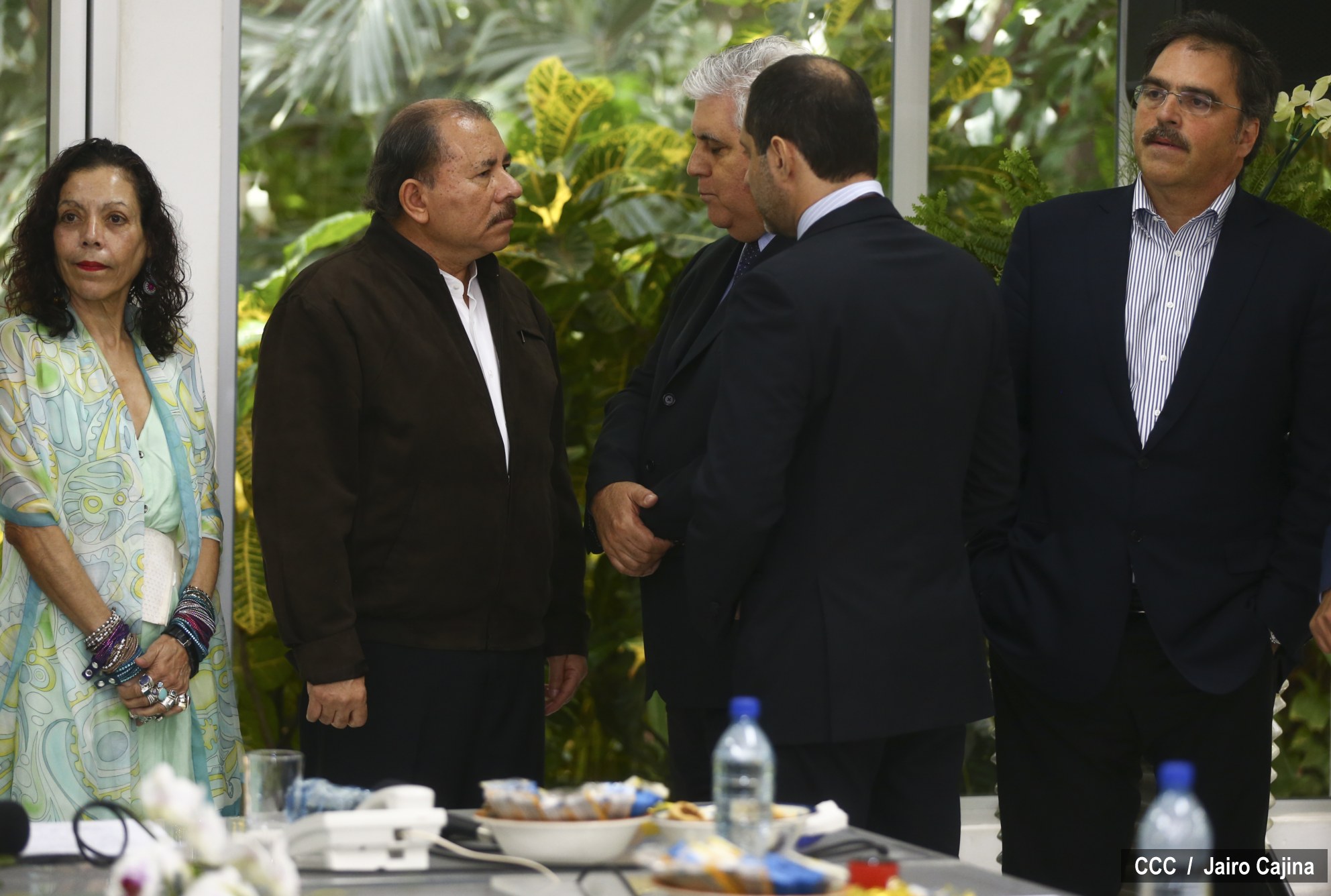 El Presidente de la República, Comandante Daniel Ortega Saavedra, y la Compañera Rosario Murillo, Coordinadora del Consejo de Comunicación y Ciudadanía, sostuvieron una sesión de trabajo con los representantes de empresas brasileñas que a partir del próximo año iniciarán la construcción de la planta de generación hidroeléctrica Tumarín.