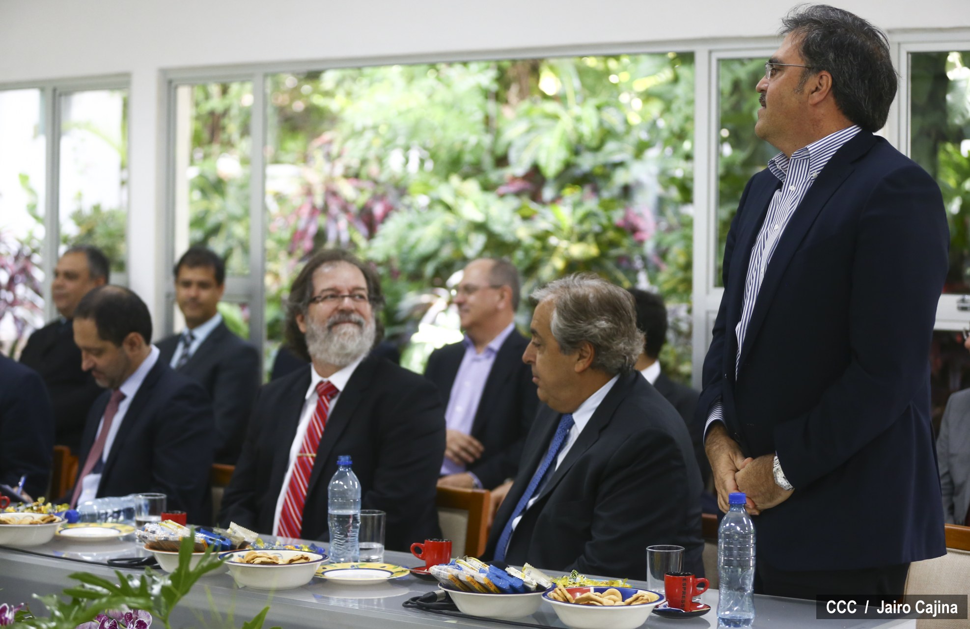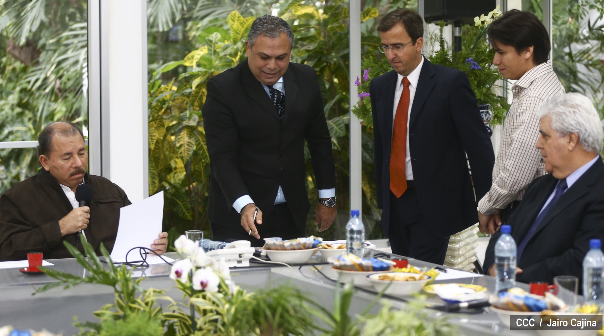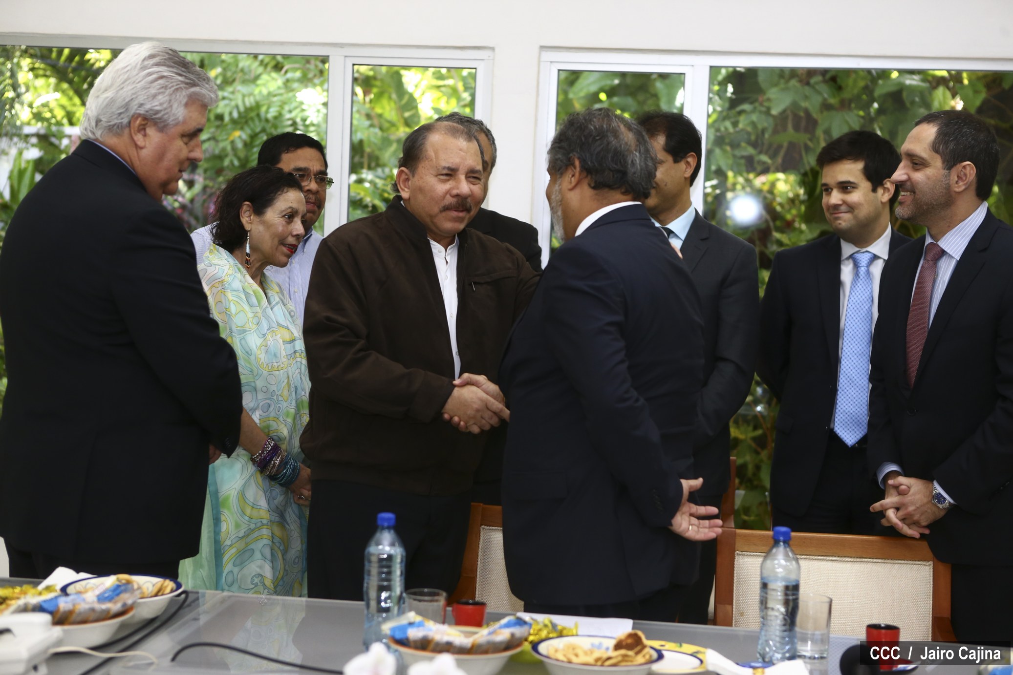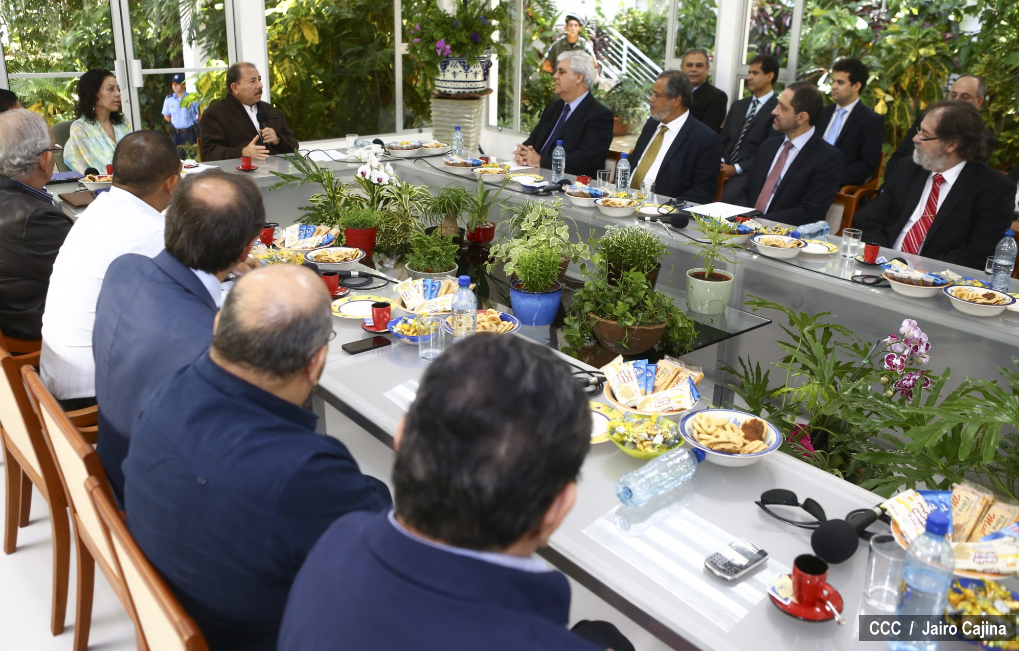 El Presidente de la República, Comandante Daniel Ortega Saavedra, y la Compañera Rosario Murillo, Coordinadora del Consejo de Comunicación y Ciudadanía, sostuvieron una sesión de trabajo con los representantes de empresas brasileñas que a partir del próximo año iniciarán la construcción de la planta de generación hidroeléctrica Tumarín.