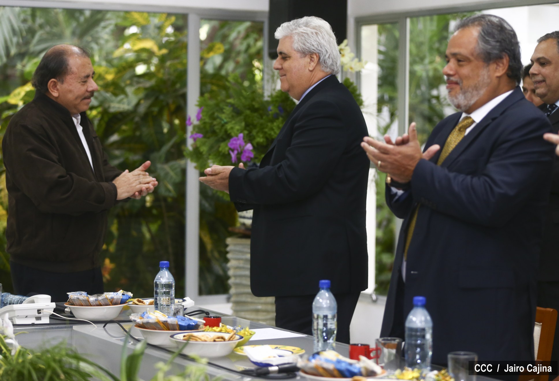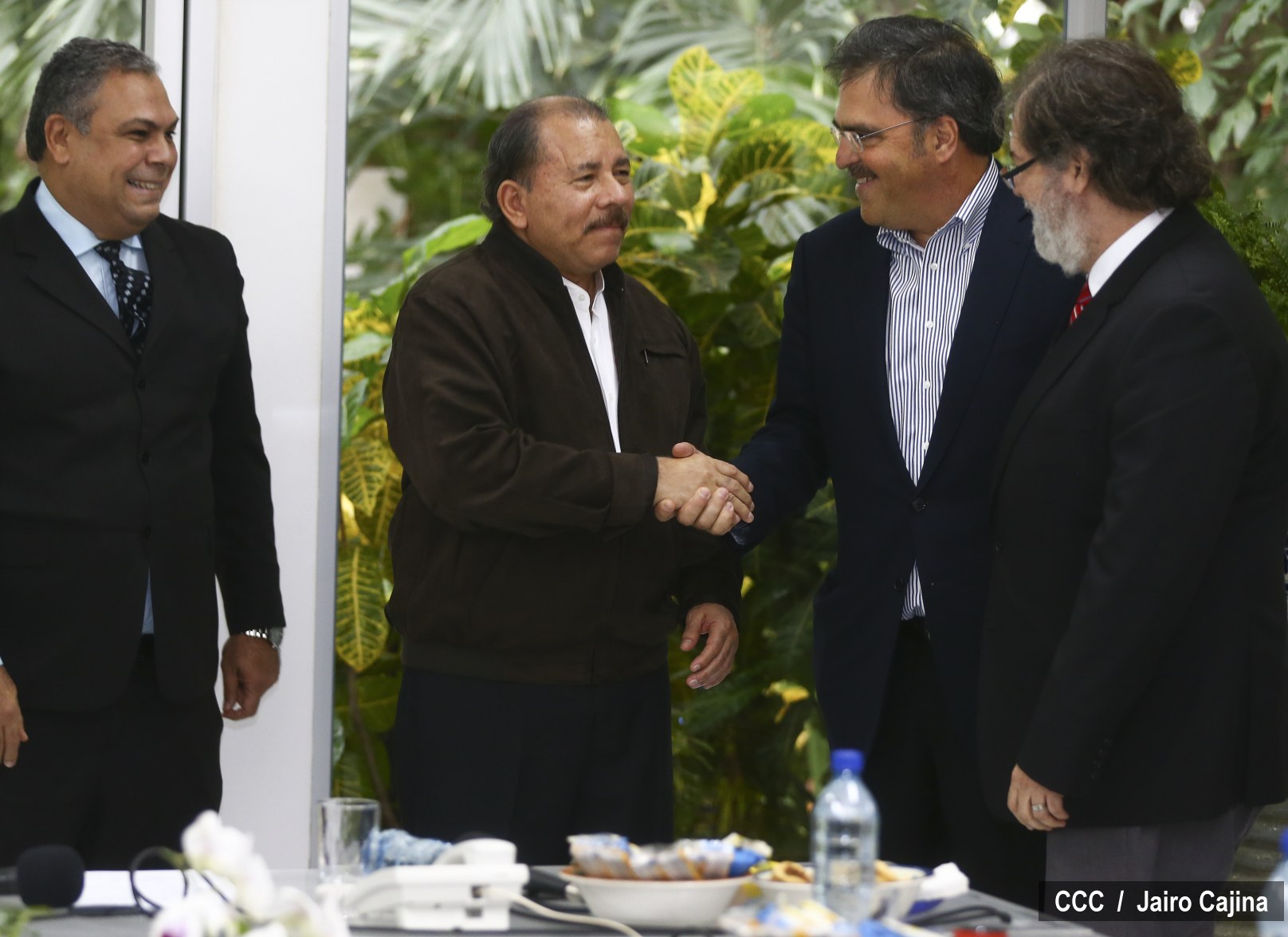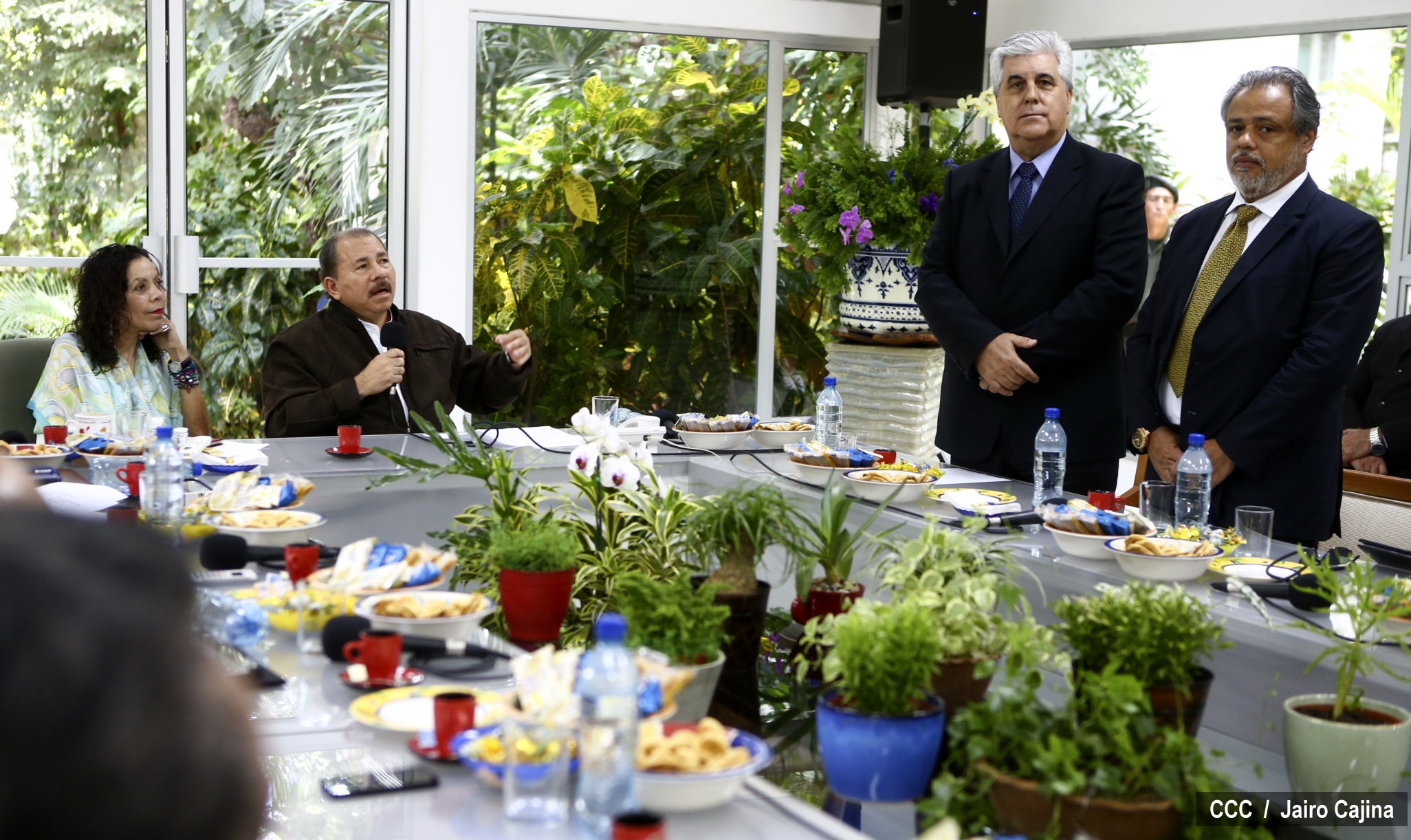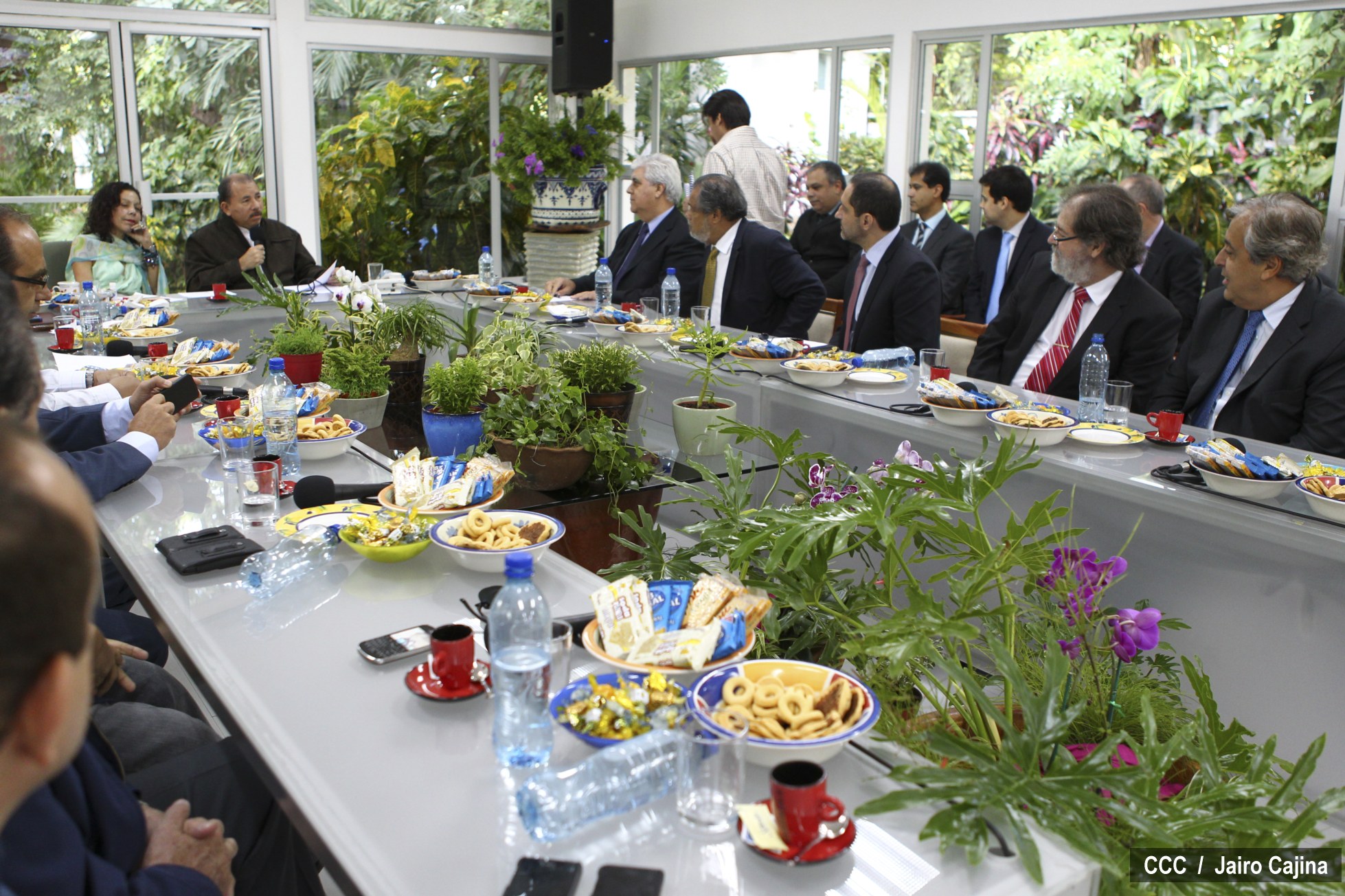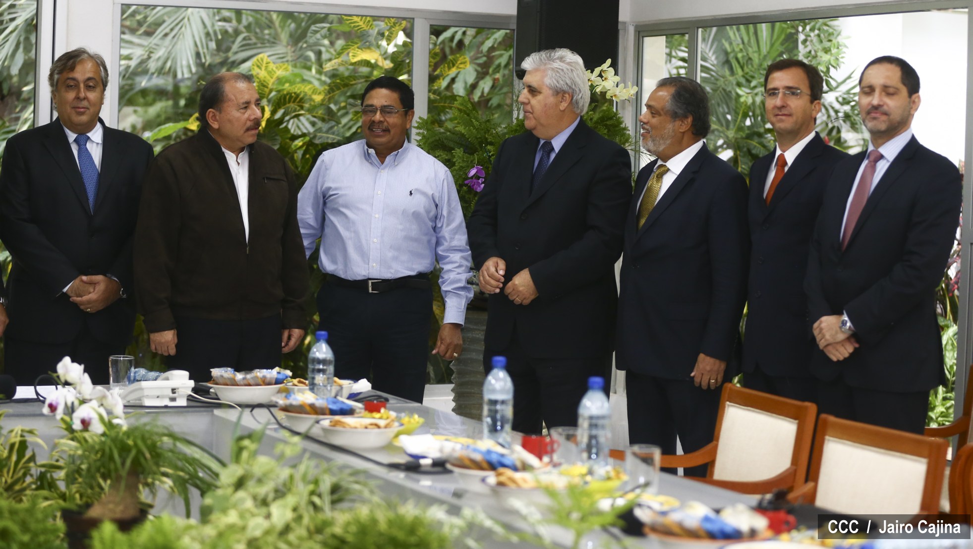 El Presidente de la República, Comandante Daniel Ortega Saavedra, y la Compañera Rosario Murillo, Coordinadora del Consejo de Comunicación y Ciudadanía, sostuvieron una sesión de trabajo con los representantes de empresas brasileñas que a partir del próximo año iniciarán la construcción de la planta de generación hidroeléctrica Tumarín.