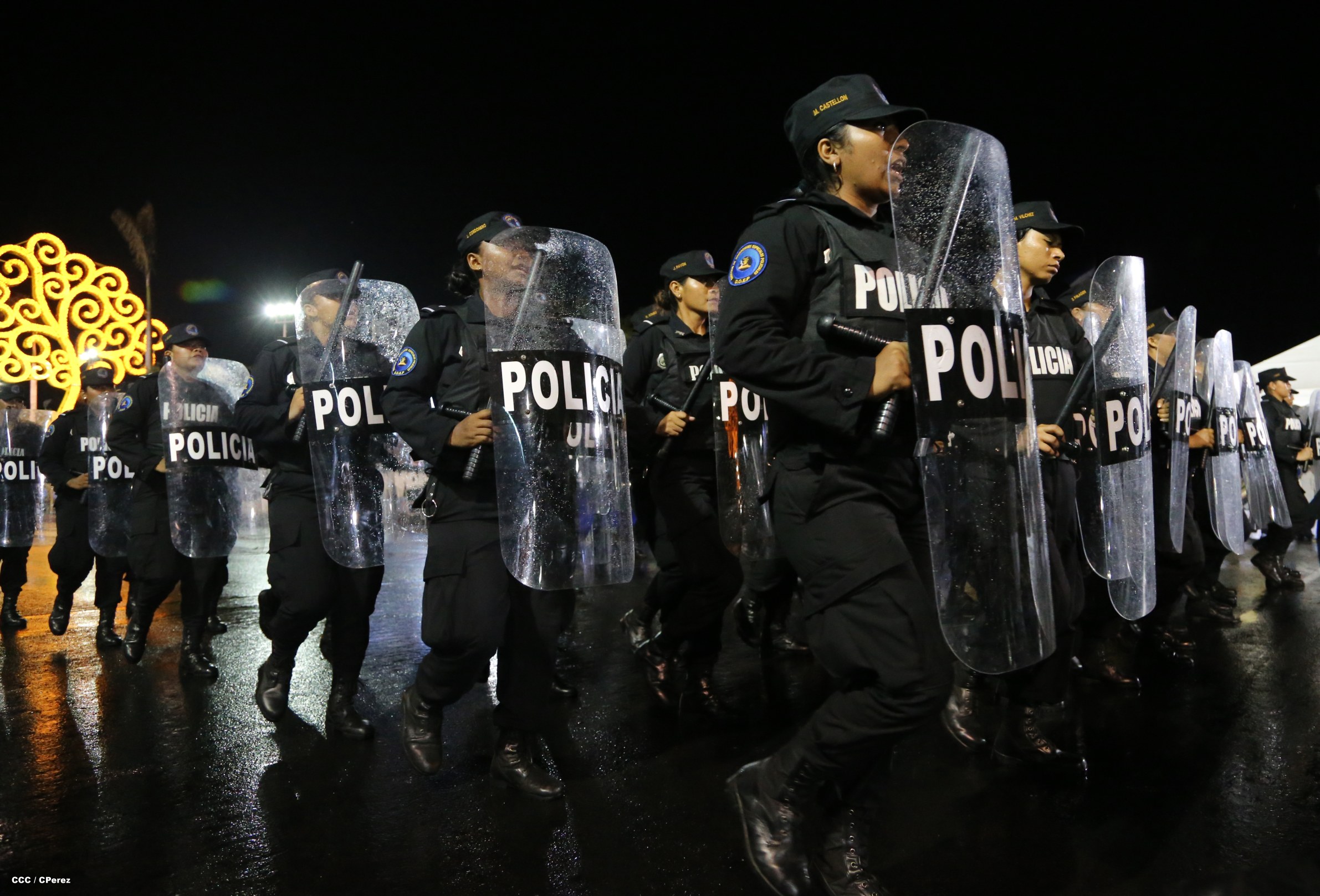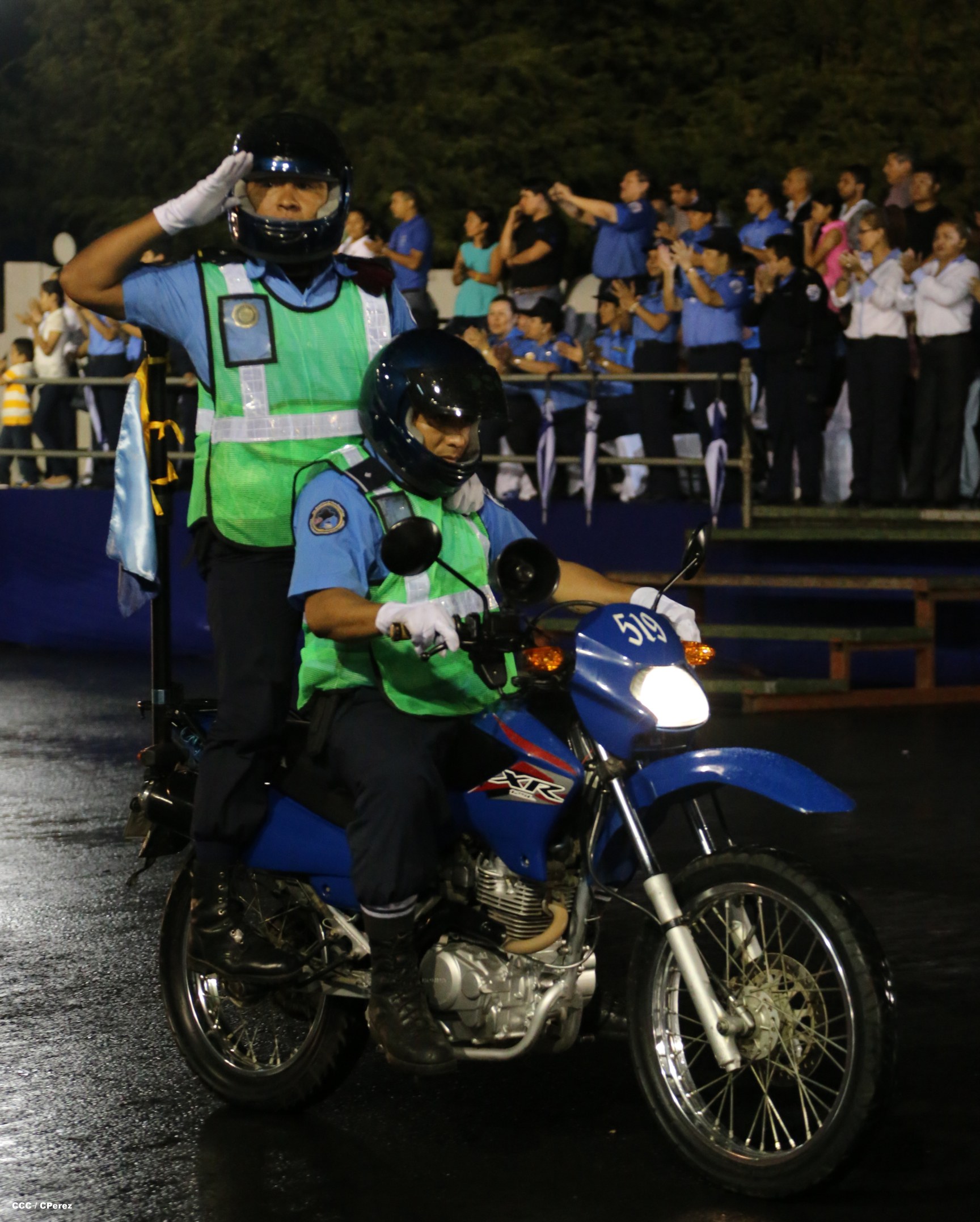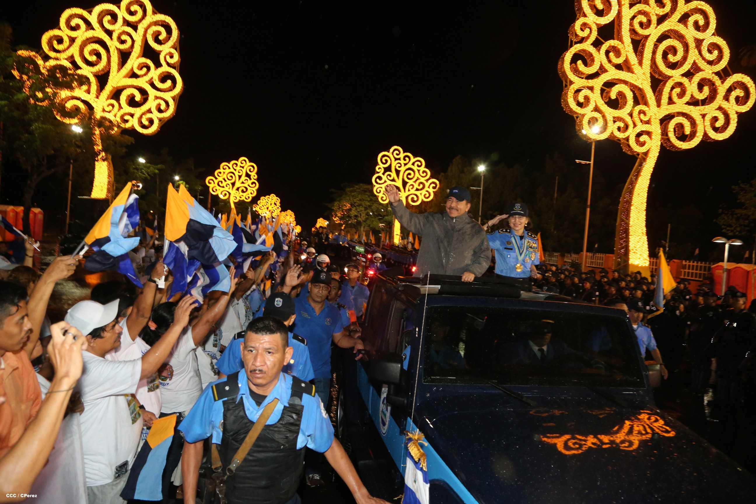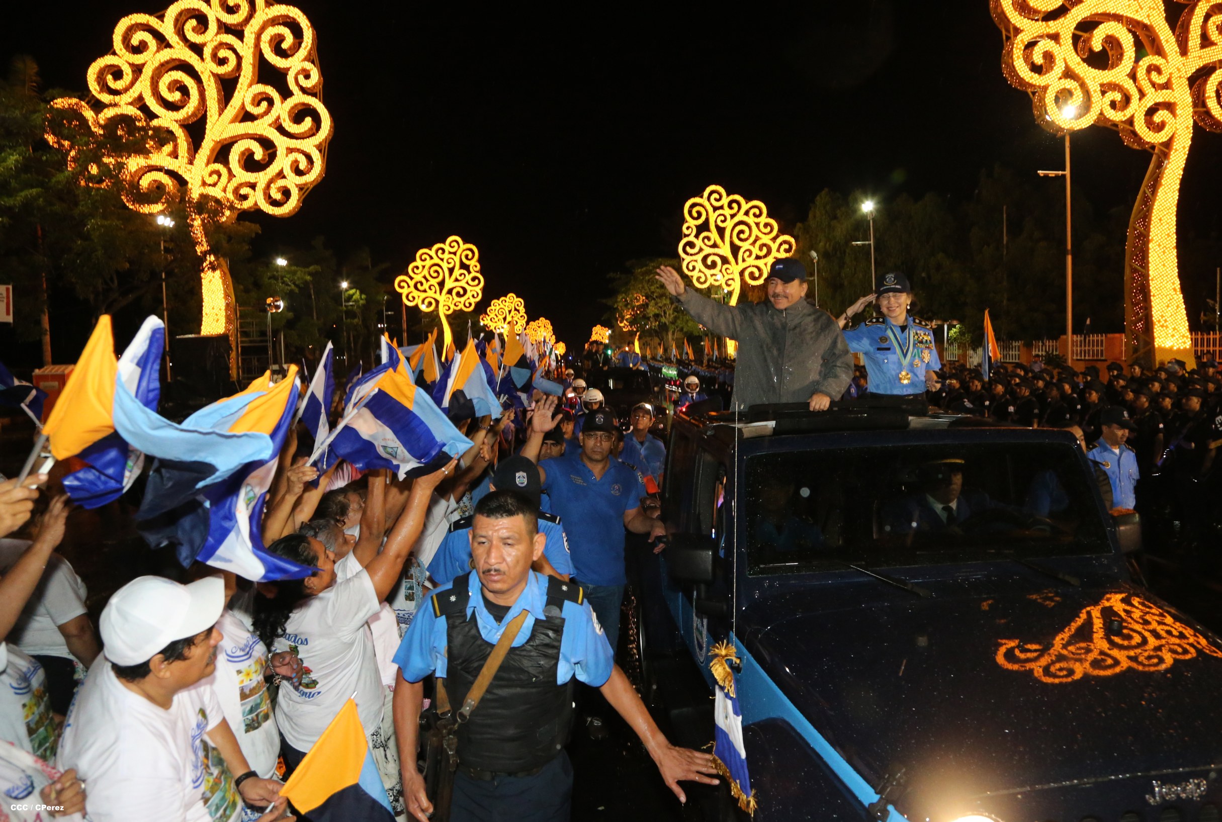 Desde la Avenida de Bolívar a Chávez, el Presidente de la República, Comandante Daniel Ortega Saavedra, presidió la noche de este jueves el desfile conmemorativo del 35 Aniversario de Fundación de la Policía Nacional, institución que atribuyó parte de los importantes logros que ha tenido en los últimos años Nicaragua en materia de paz y estabilidad.