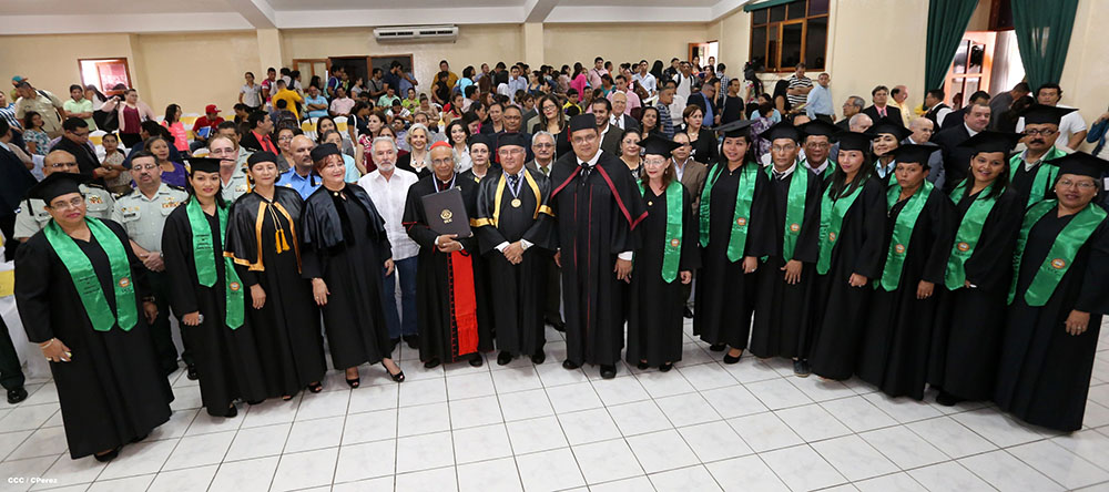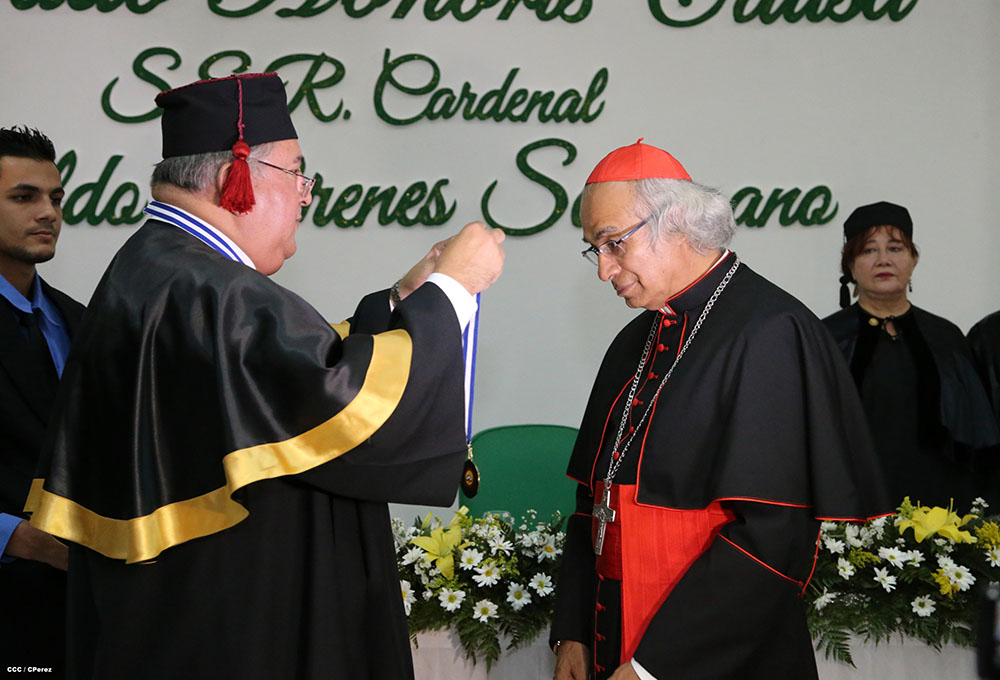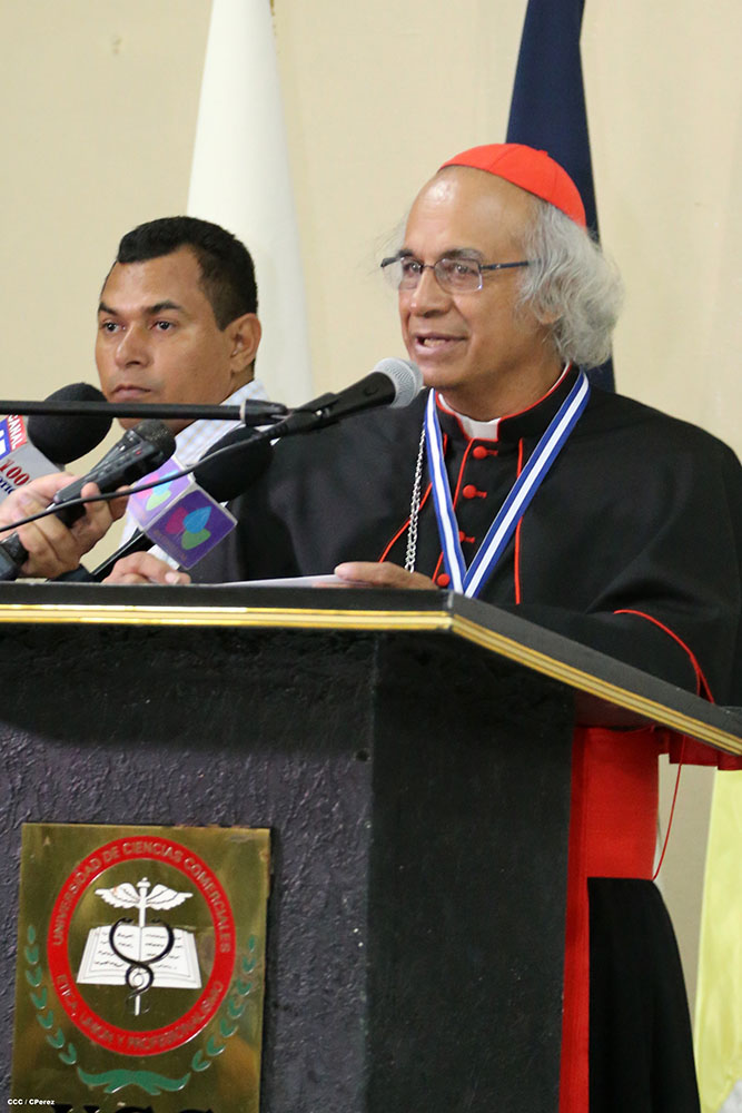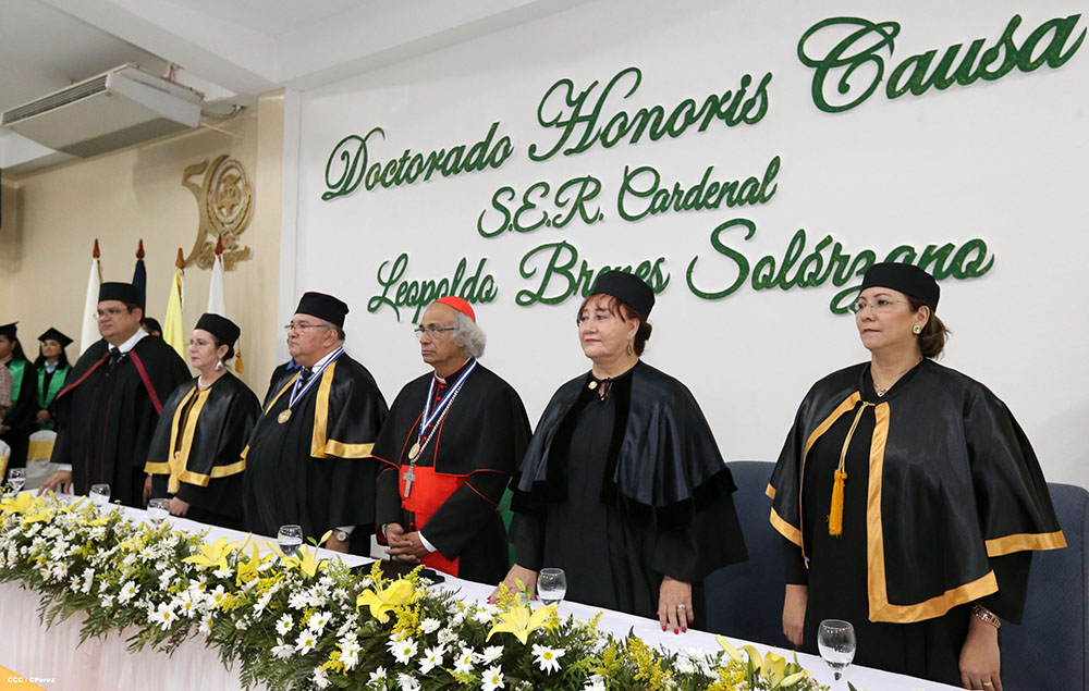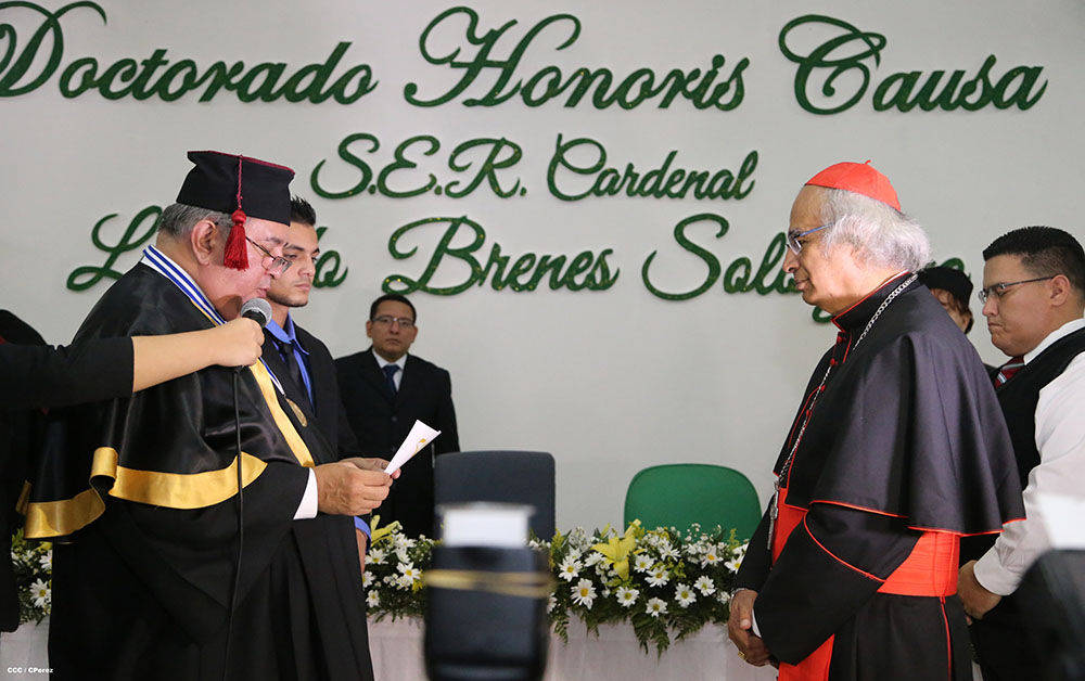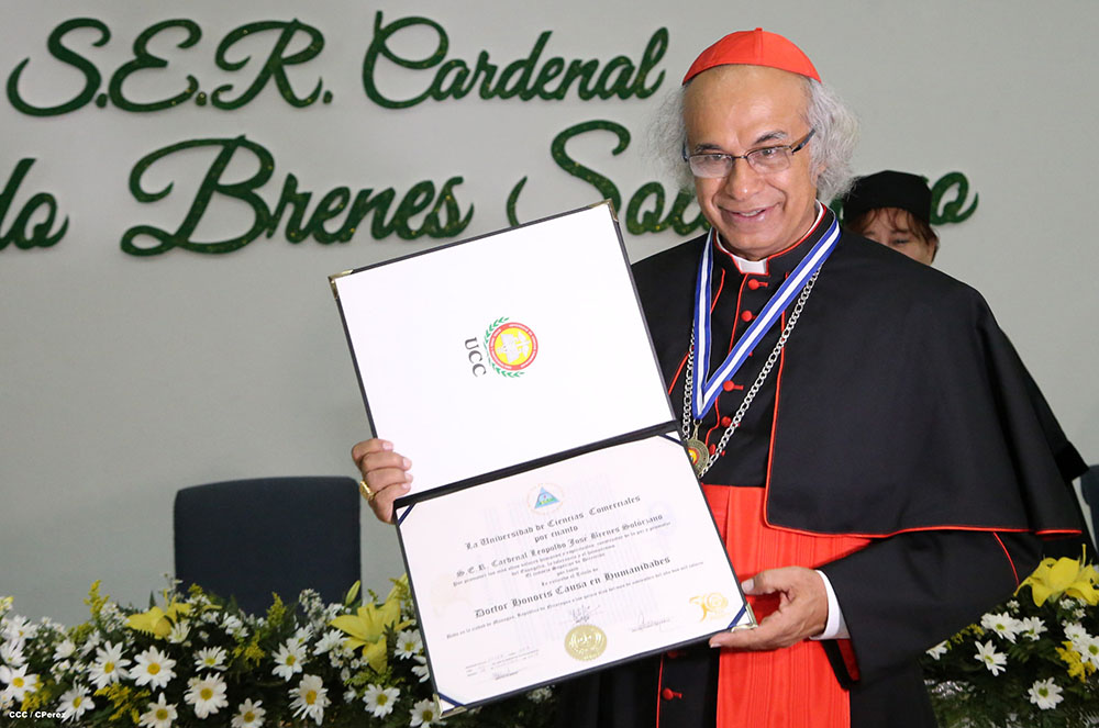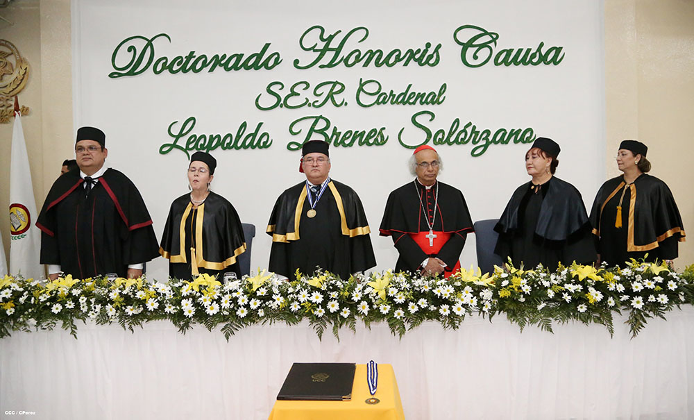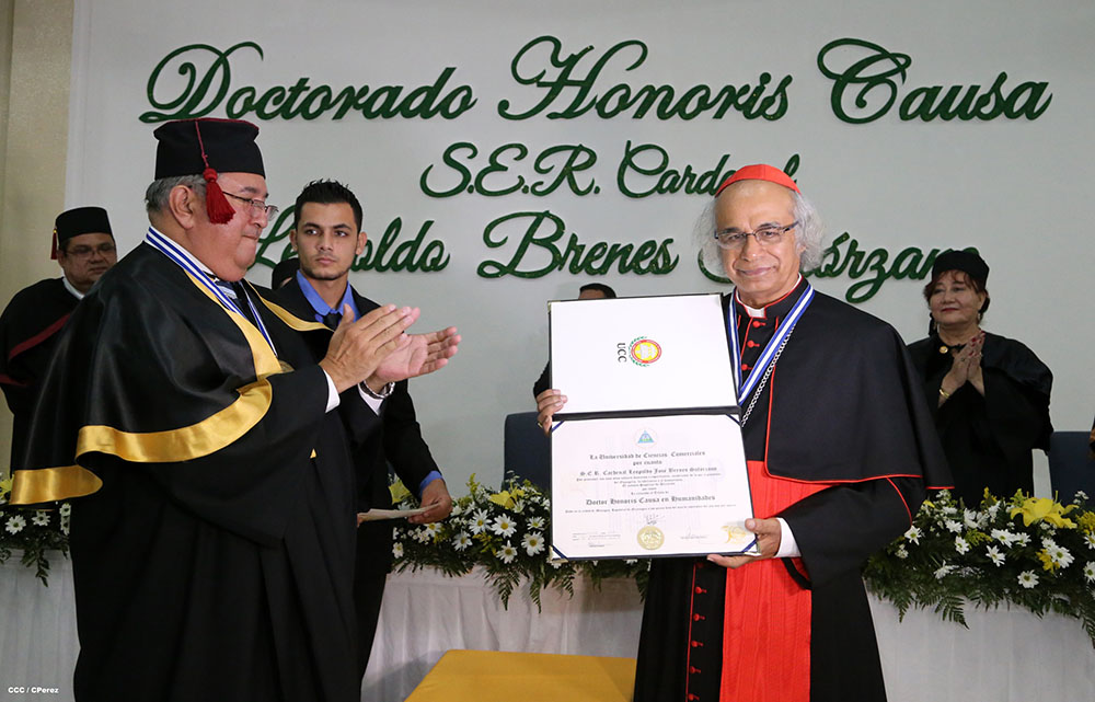 Esta mañana en acto solemne la Universidad de Ciencias Comerciales, le otorgó el Doctorado Honoris Causa a Ser Cardenal Leopoldo José Brenes Solorzano. A la actividad asistieron miembros del cuerpo diplomático, y de otros poderes del Estado Nicaragüense asi como las autoridades de dicha casa de estudios.