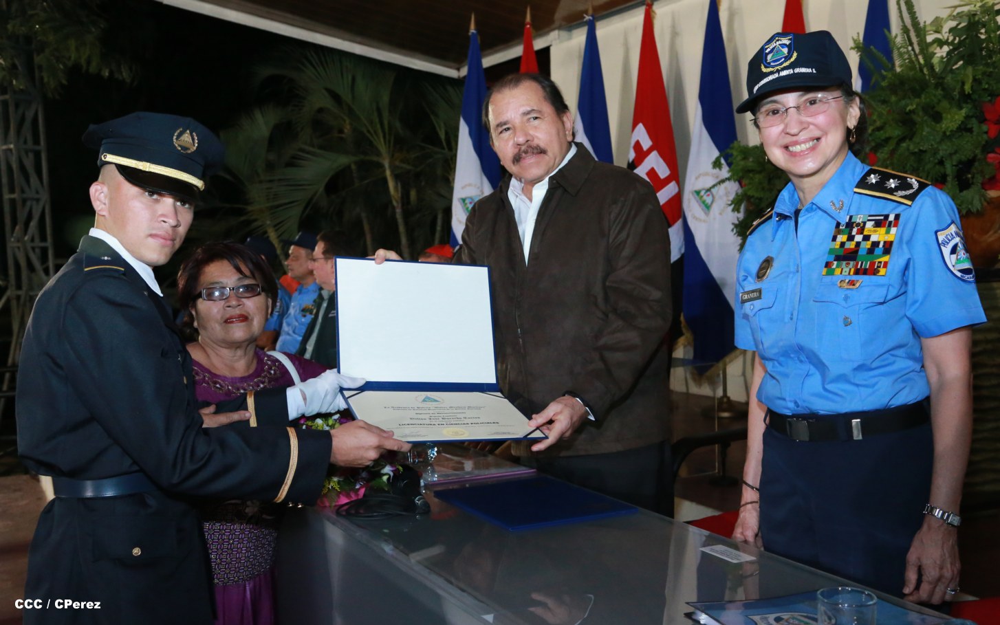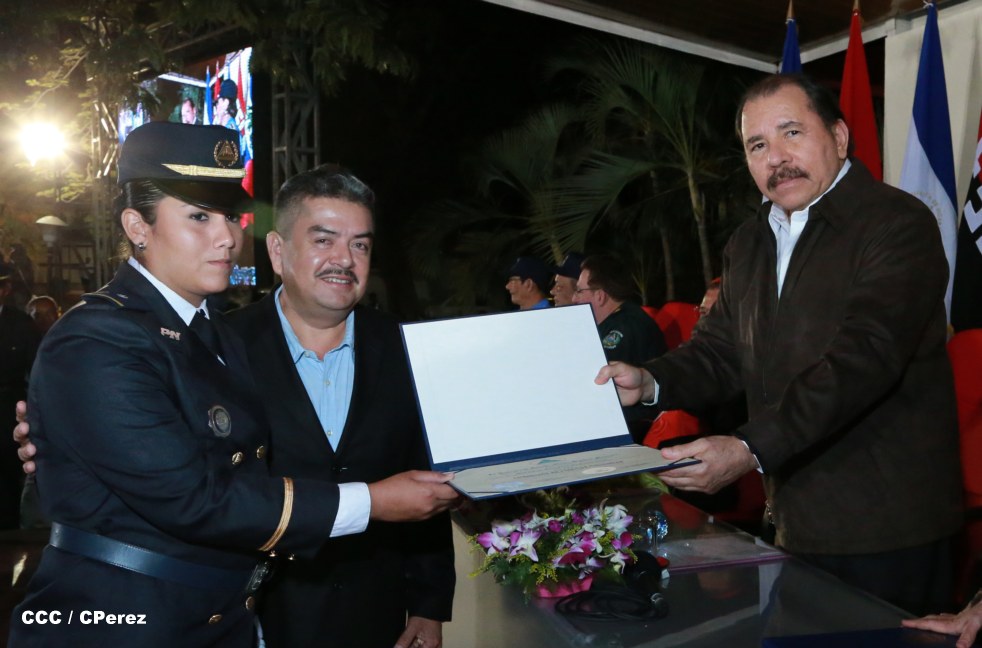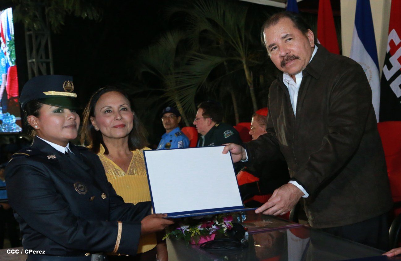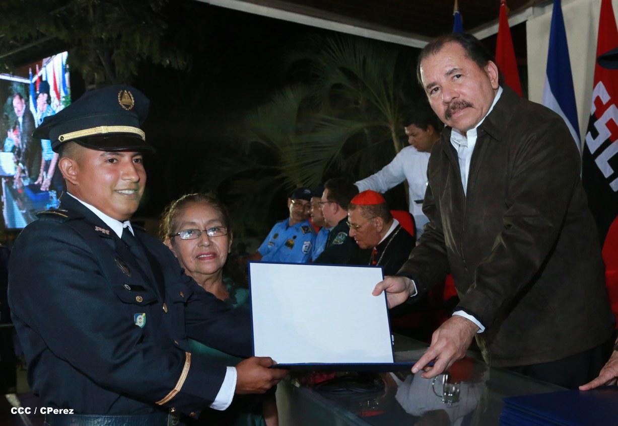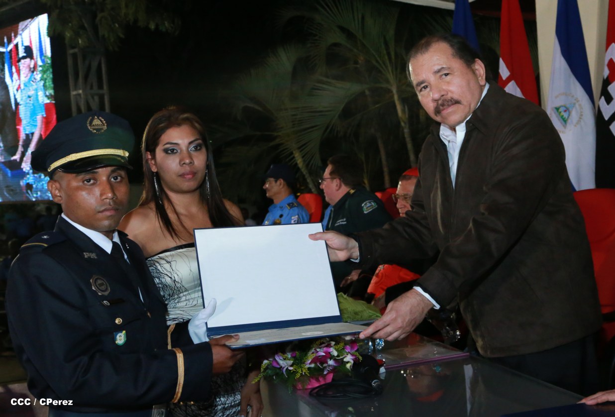 El Presidente de la República, Comandante Daniel Ortega, y la Coordinadora del Consejo de Comunicación y Ciudadanía, Compañera Rosario Murillo, presidieron este martes la XVII Promoción de Cadetes y Técnicos Medios de la Policía Nacional.