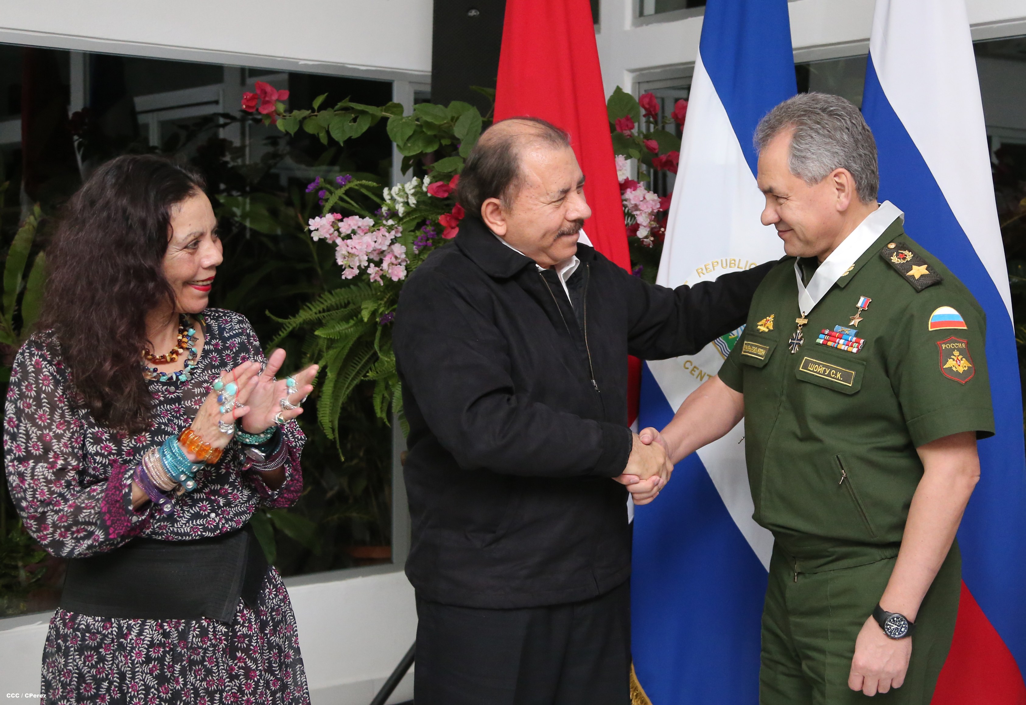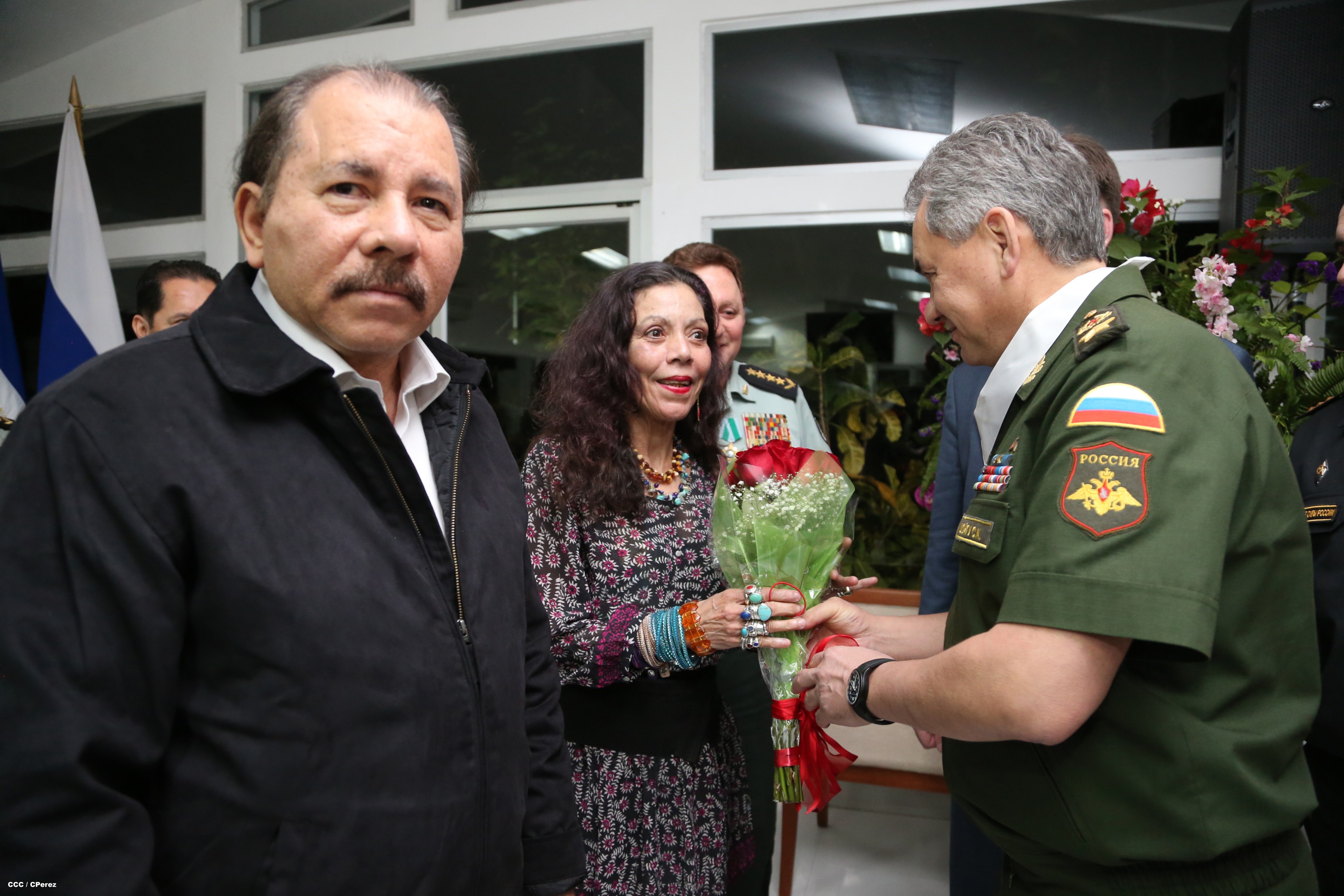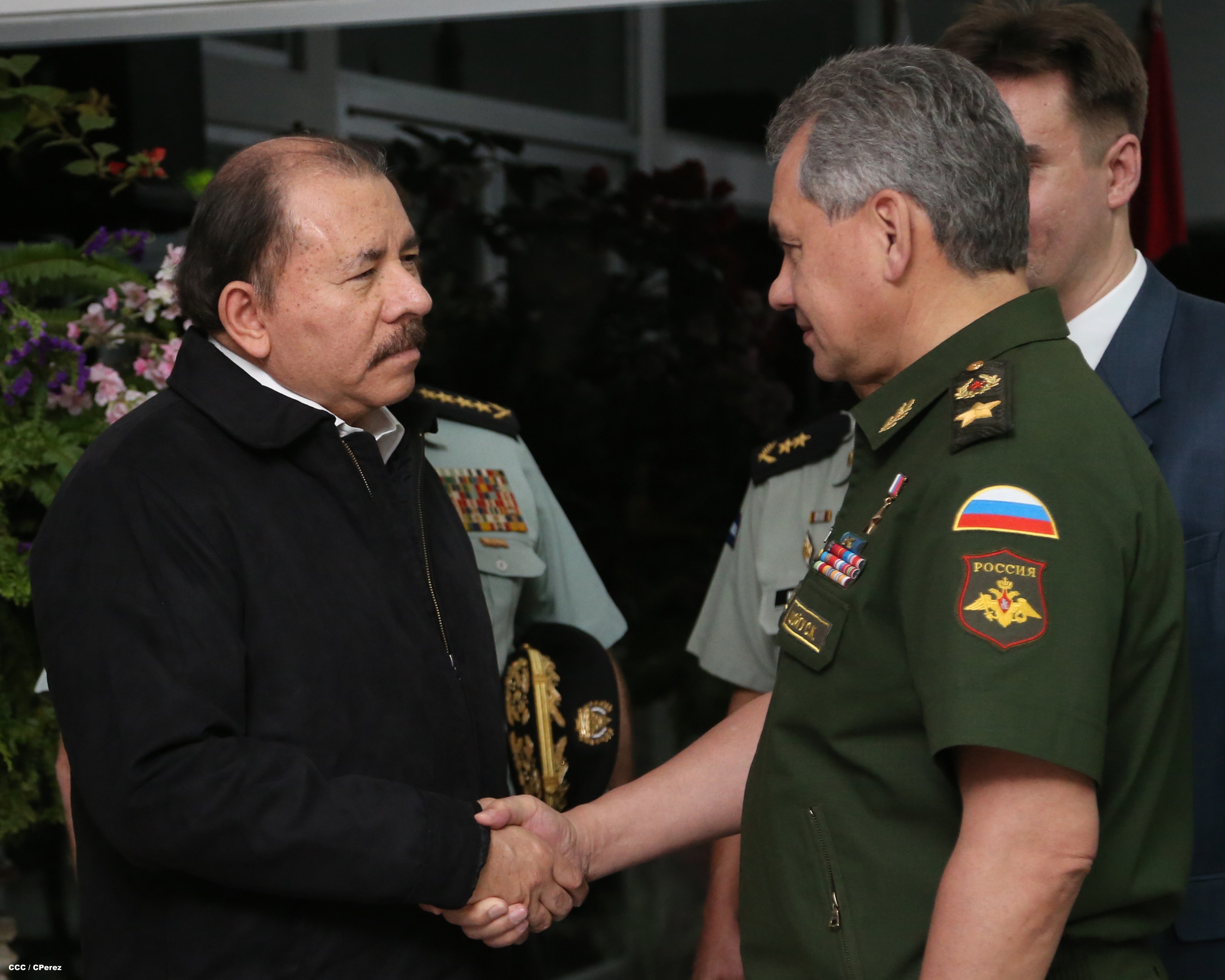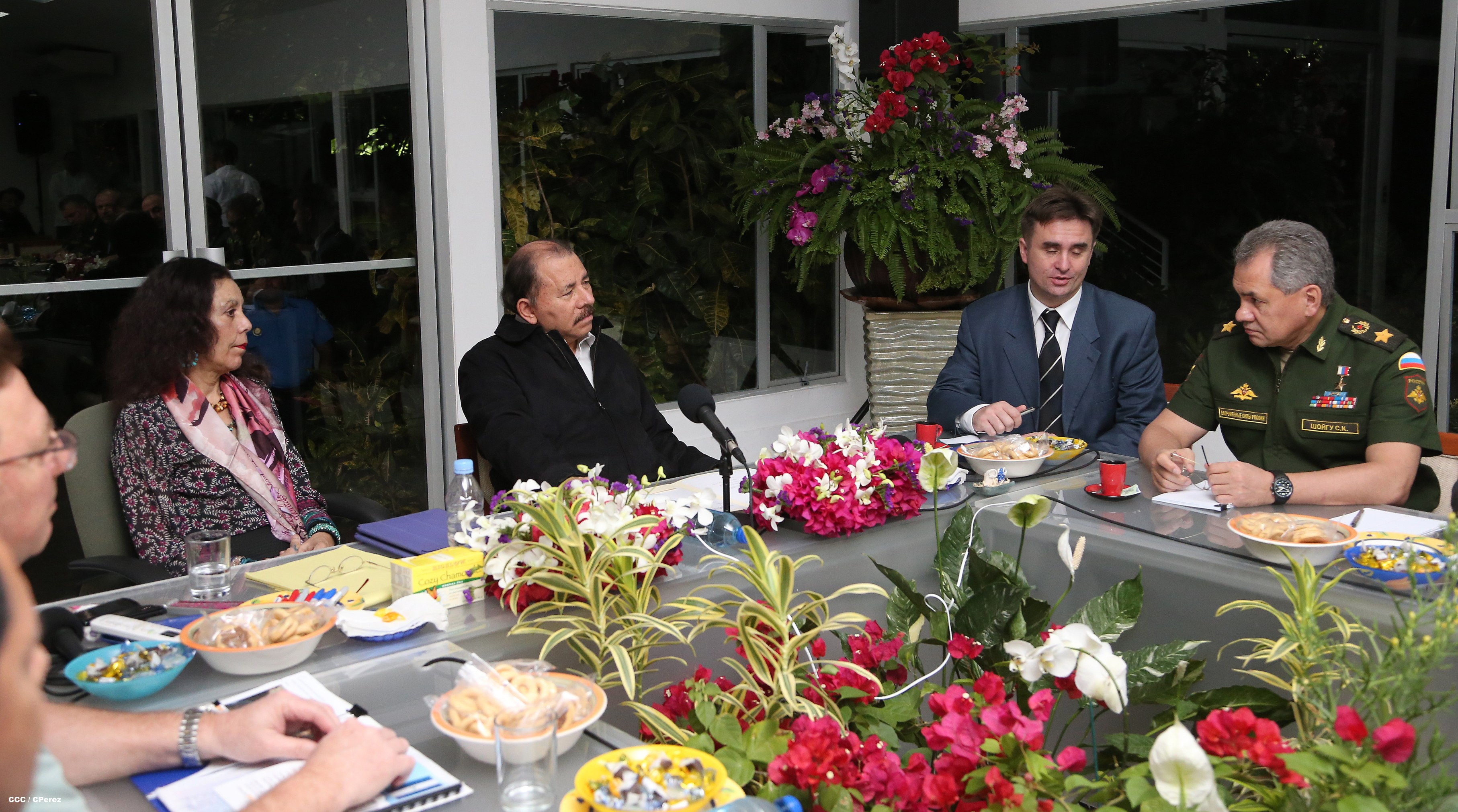 El Presidente de la República de Nicaragua, Comandante Daniel Ortega Saavedra, se reunió la noche de este jueves con el Ministro de Defensa de la Federación de Rusia, General Serguei Shoigu. En el encuentro participaron la Coordinadora del Consejo de Comunicación y Ciudadanía, Compañera Rosario Murillo; el Jefe del Ejército, Julio César Avilés, y miembros de la Comandancia del Ejército. Igualmente estuvieron presentes el viceministro de la Defensa de Rusia, Anatoly Antonov, y los demás integrantes de la delegación que visita nuestro país.
