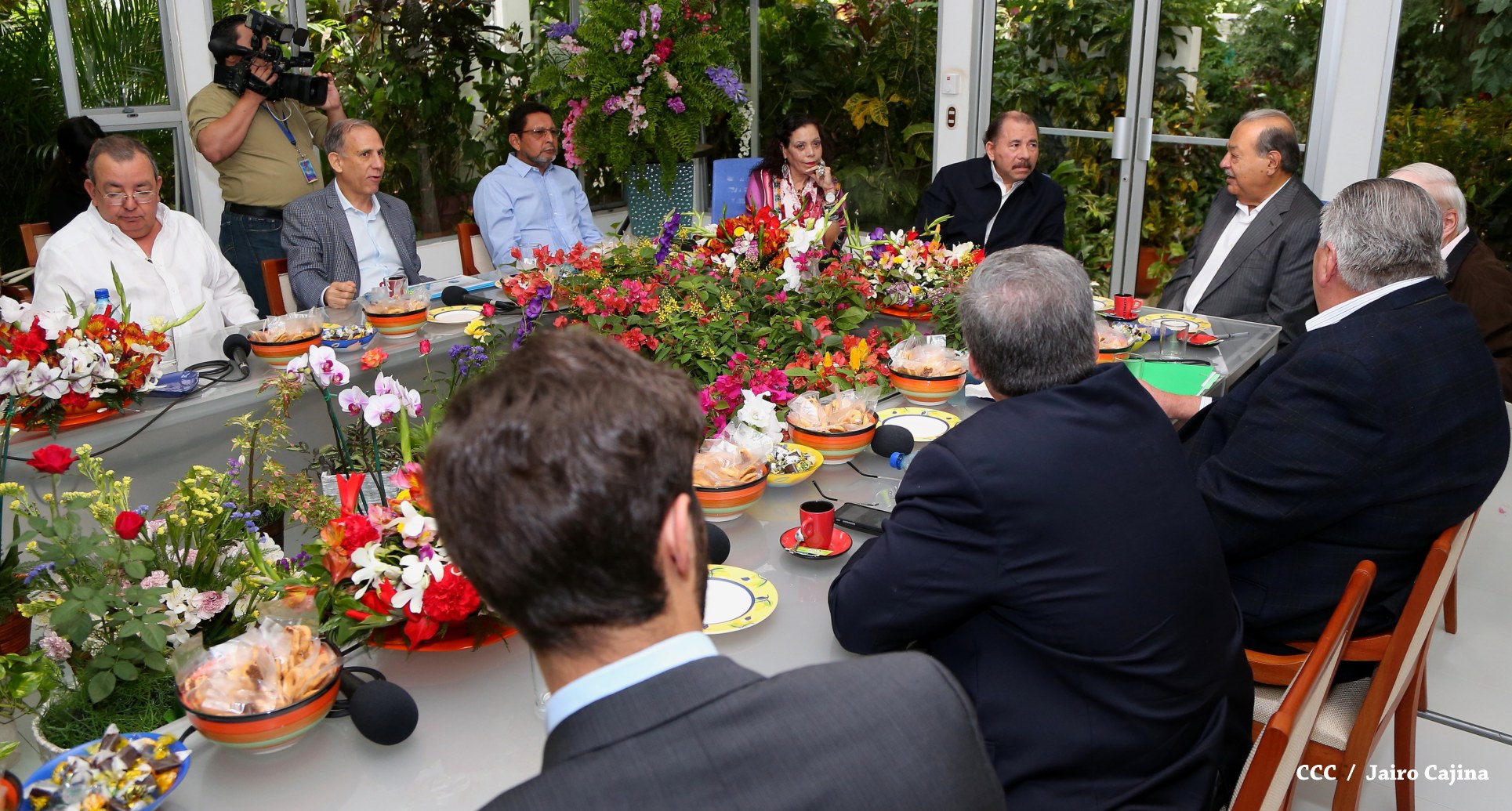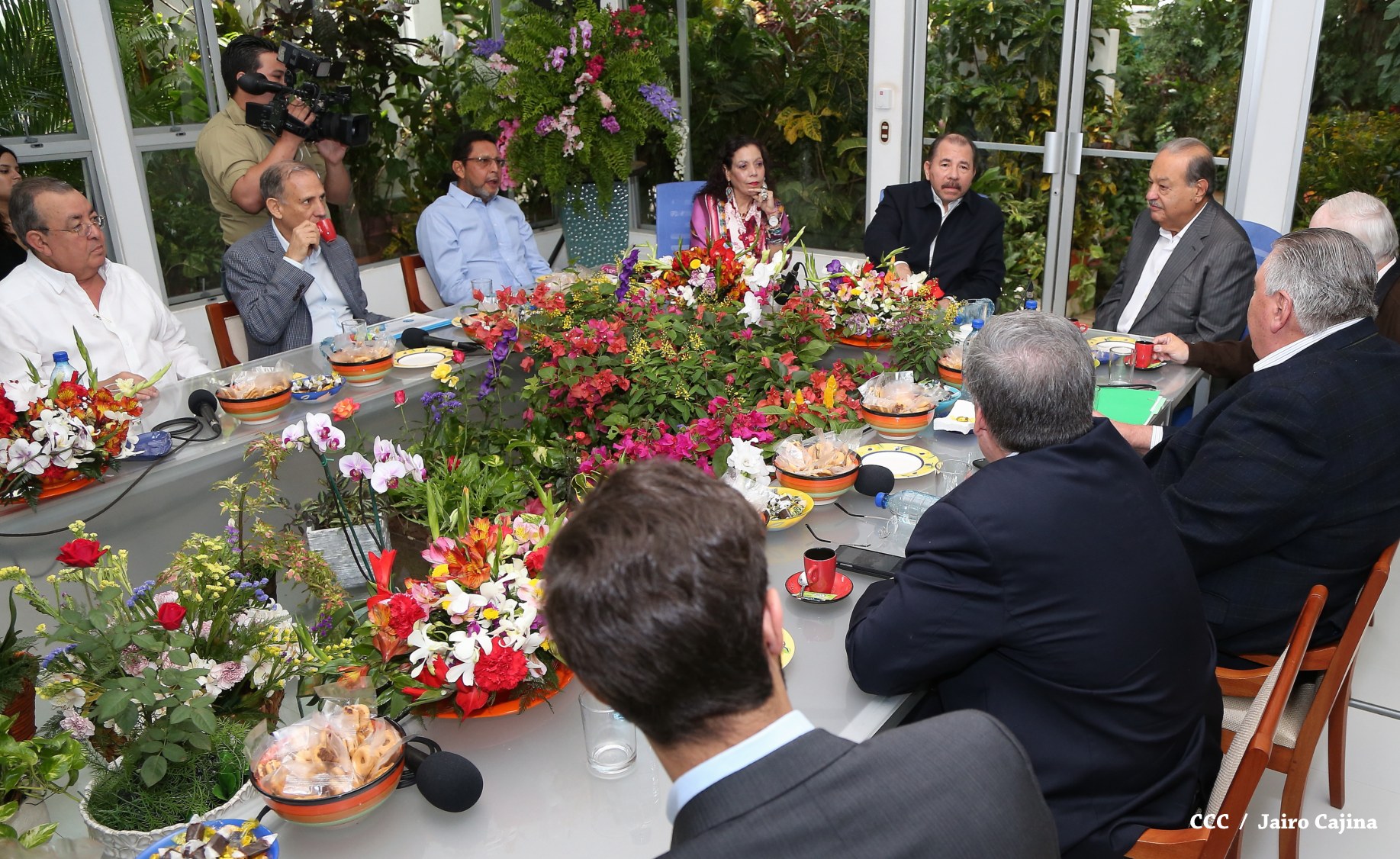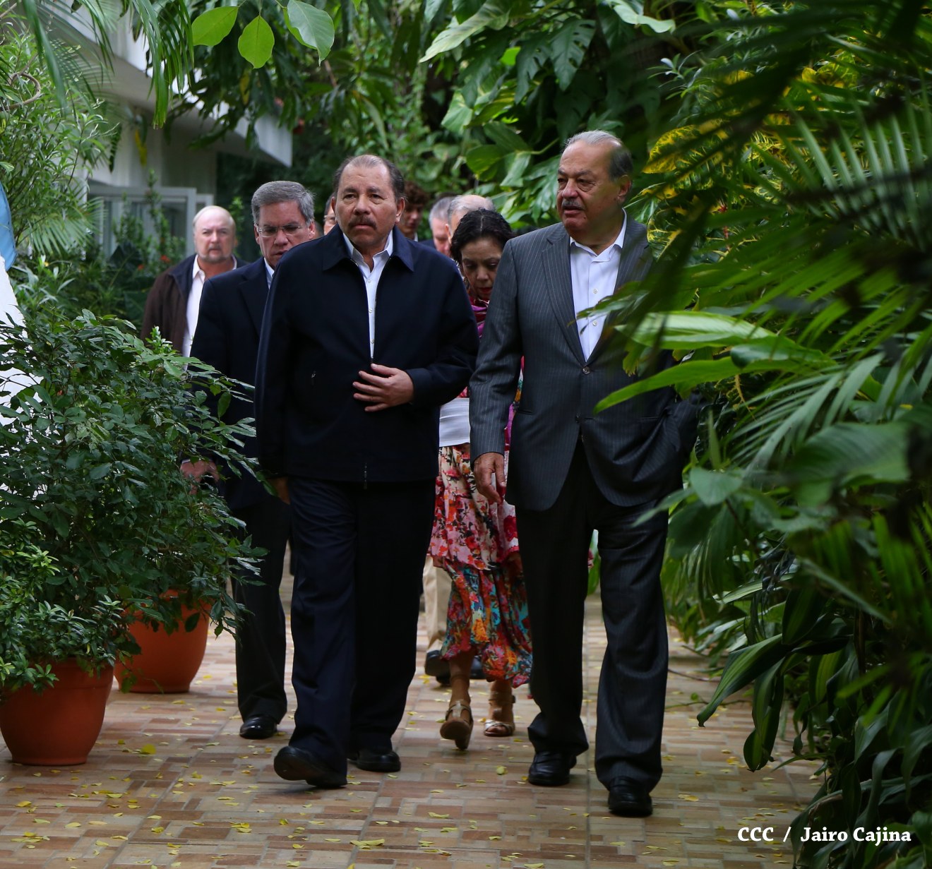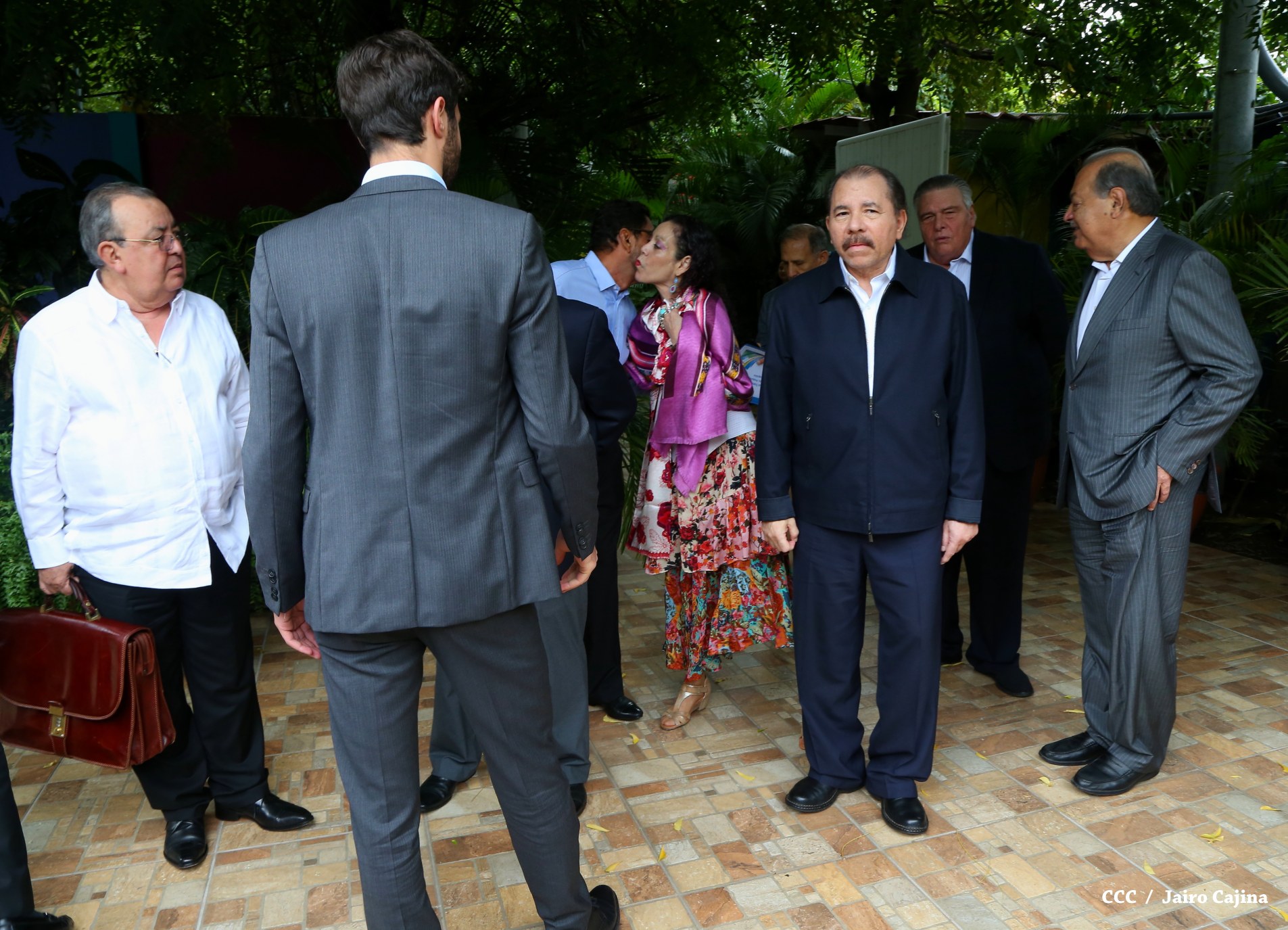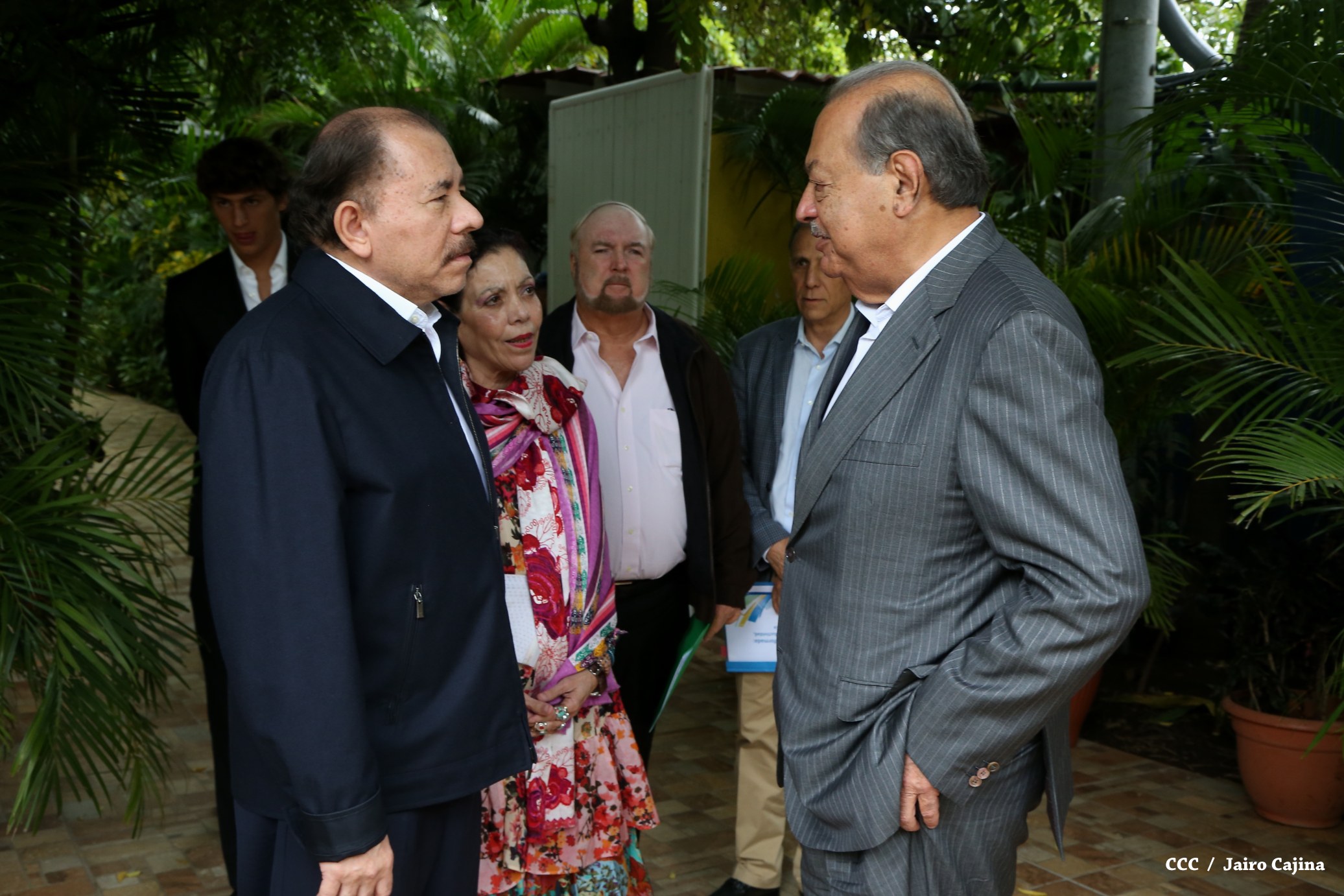 El Presidente de la República, Comandante Daniel Ortega Saavedra, y la Coordinadora del Consejo de Comunicación y Ciudadanía, Compañera Rosario Murillo Zambrana, sostienen este jueves un encuentro con el empresario mexicano, Carlos Slim.