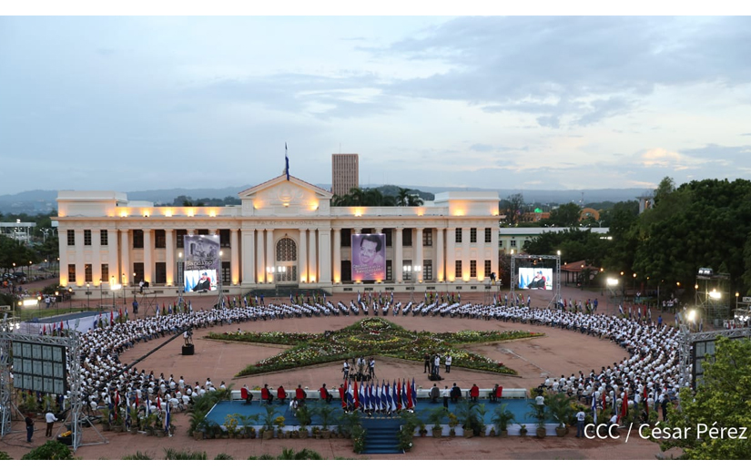 Yo quiero felicitar a los arquitectos y diseñadores que construyeron ese majestuoso escenario circular con una gigantesca estrella verde en el centro de la Plaza de la Revolución, desde la cual el presidente Daniel Ortega se dirigió a la nación. Qué imaginación la de quienes concibieron algo así porque la vista que nos proporcionaron los drones, donde hicieron arquitectónicamente lo suyo el Palacio Nacional, la vieja Catedral, La Casa de los Pueblos, el Parque Central, el Teatro Nacional, el Monumento a Rubén y en el fondo La Plaza la Fe, fue algo tan mágico y tan espectacular que las mejores portadas, de los periódicos más reputados del planeta, ilustraban los reportajes de este 41 aniversario, totalmente diferente a todos los que le precedieron.
