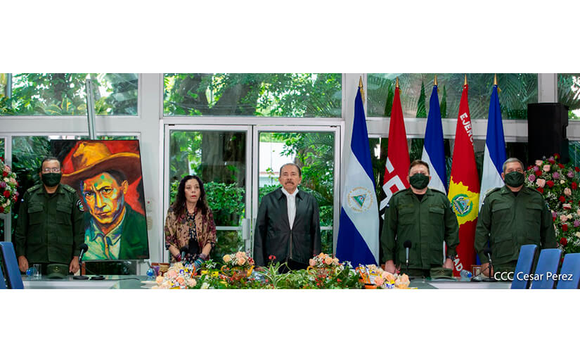 Nos acompañan, la Compañera Rosario, Vicepresidenta de la República; el Mayor General Bayardo Rodríguez, Jefe del Estado Mayor General del Ejército; el Mayor General Marvin Corrales Rodríguez, Inspector General del Ejército. Y nuestros saludos para el Jefe de la Fuerza Aérea, el General de Brigada Spiro Bassi Aguilar.