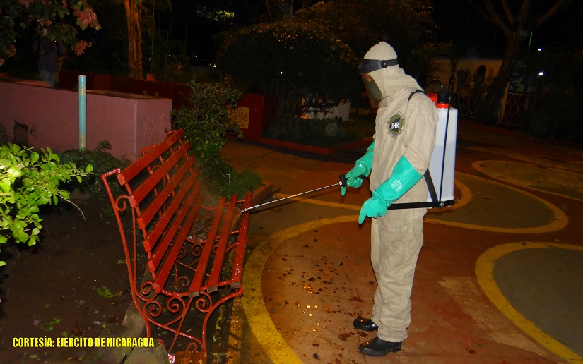 El 3 de agosto de 2020, en el marco de las tareas de protección a la población y en cumplimiento al Plan de Empleo de Fuerzas y Medios del Ejército de Nicaragua para el combate ante la COVID-19, efectivos militares de la Unidad Humanitaria y de Rescate “Comandante William Ramírez Solórzano” y el 6 Comando Militar Regional, en coordinación con las autoridades del Ministerio de Salud (MINSA) y la Alcaldía del municipio de Sébaco, continuaron jornada de desinfección en espacios públicos abiertos, beneficiando a 27,000 personas.