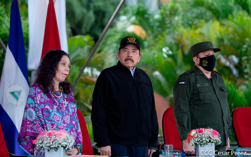 Comandante Daniel Ortega, Presidente de la República y Jefe Supremo del Ejército de Nicaragua; Compañera Rosario Murillo, Vicepresidenta de la República; Hermanos de la Comandancia General, Mayores Generales Bayardo Rodríguez, Jefe de Estado Mayor General, y Mayor General Marvin Corrales, Inspector General.