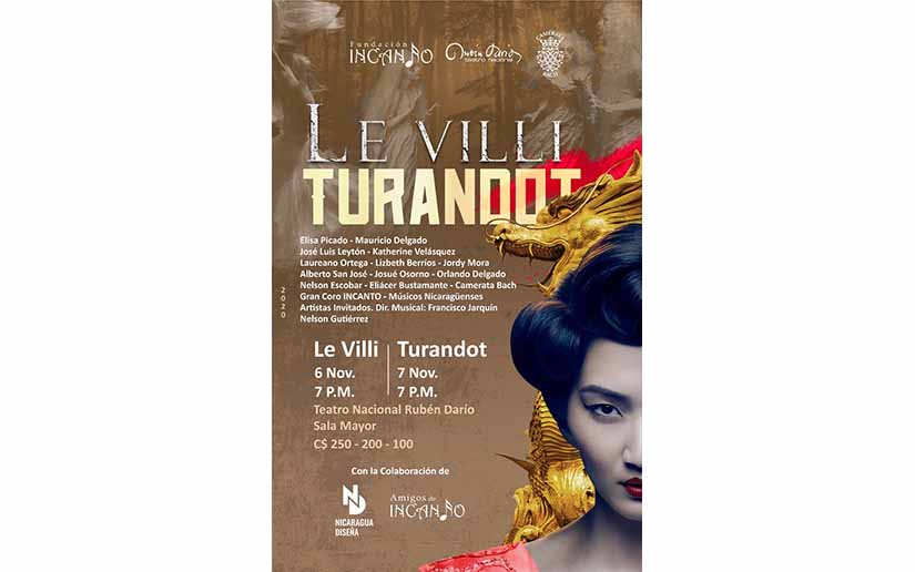 “En esta ocasión se llevará a escena las óperas italianas, Le Villi y Turandot, del compositor Giacomo Puccini. Serán dos noches de música, danza y riqueza visual que Fundación INCANTO está preparando con los mejores artistas de Nicaragua; los esperamos este 6 y 7 de noviembre, a las 7:00 p.m., en la sala mayor del Teatro Nacional Rubén Darío. Estaremos tomando todas las medidas preventivas de higiene para la salud y bienestar del público asistente. Desde este momento pueden adquirir sus boletos en la taquilla”, informó la compañera Santamaría.