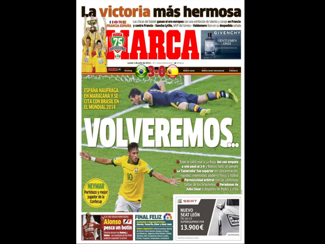 La prensa deportiva española asume la superioridad de Brasil en la final de la Copa de las Confederaciones y en sus portadas pasa del "Volveremos" a la "coronación" de Neymar, jugador del Barcelona a partir de la próxima temporada.