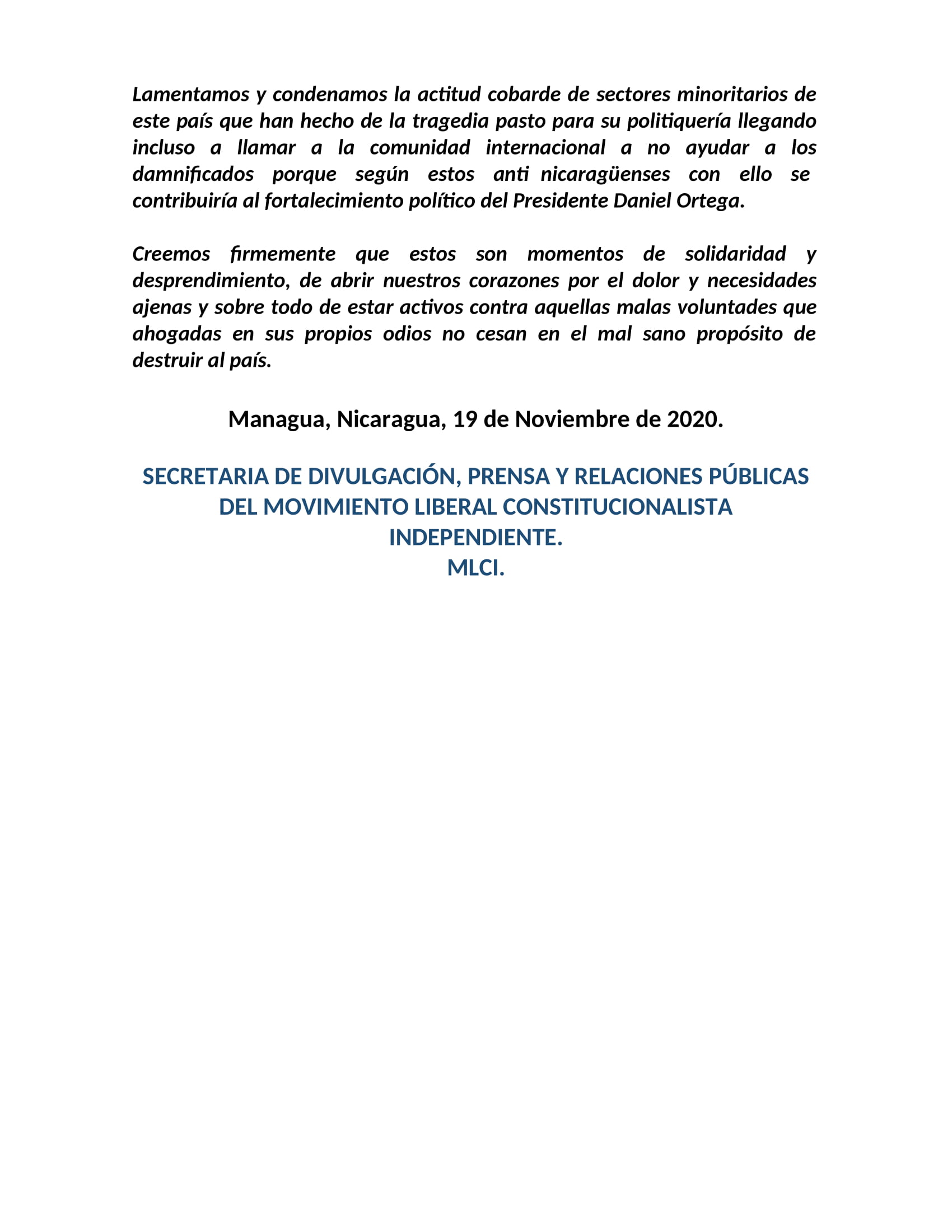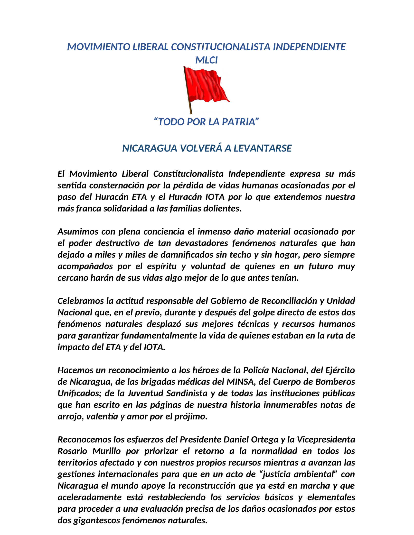 El Movimiento Liberal Constitucionalista Independiente expresa su más sentida consternación por la pérdida de vidas humanas ocasionadas por el paso del Huracán ETA y el Huracán IOTA por lo que extendemos nuestra más franca solidaridad a las familias dolientes.