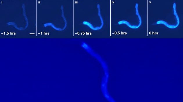Un grupo de investigadores logró captar cómo la muerte 'se extiende' por el cuerpo de un gusano como una ola azul fluorescente. Los expertos opinan que su estudio permitirá entender mejor el proceso de la muerte y quizá aumentar la esperanza de vida.