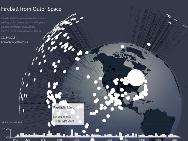 Basado en esta premisa, un diseñador berlinés de nombre Sebastian Sadowski creó un gráfico interactivo que muestra con exactitud qué meteoritos han caído en los diferentes países a lo largo de un siglo.