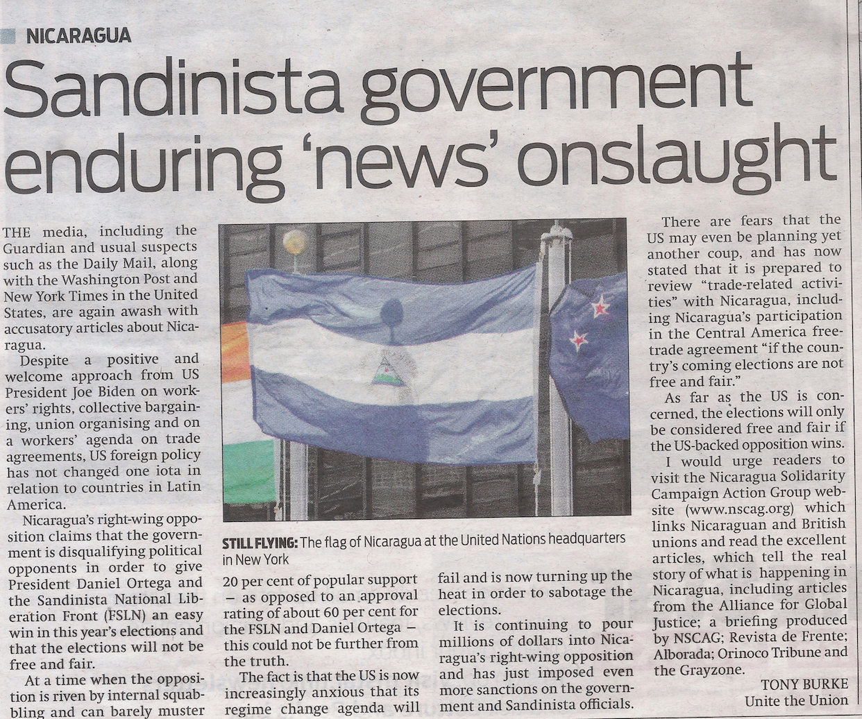I would urge readers to visit the Nicaragua Solidarity Campaign Action Group wen and website (www.nscag.org) which links Nicaraguan and British unions and read the excellent articles, which tell the real stoy of what is happening in Nicaragua, including articles from the Alliance for Global Justice; a briefing produced by NSCAG; Revista de Frente, Alborada, Orinoco Tribune and The Grayzone.