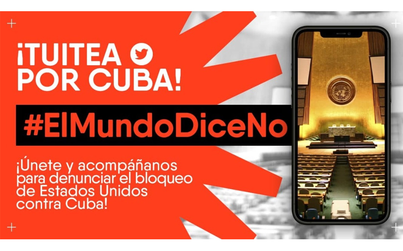 Hoy día de la votación en #AGNU????????contra el bloqueo de EE.UU. a Cuba????????, los invitamos a usar en Twitter el hashtag #ElMundoDiceNo. pic.twitter.com/6RpfVNsXkH