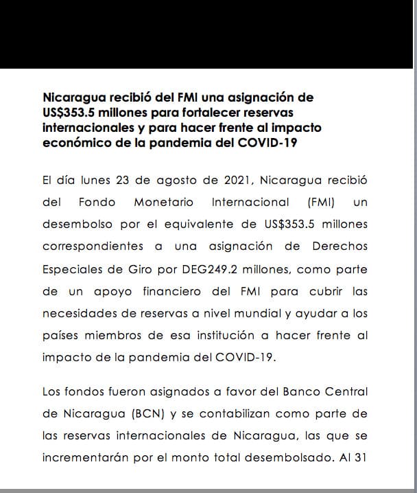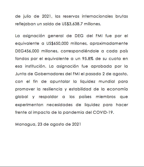 El día lunes 23 de agosto de 2021, Nicaragua recibió del Fondo Monetario Internacional (FMI) un desembolso por el equivalente de US$353.5 millones correspondientes a una asignación de Derechos Especiales de Giro por DEG249.2 millones, como parte de un apoyo financiero del FMI para cubrir las necesidades de reservas a nivel mundial y ayudar a los países miembros de esa institución a hacer frente al impacto de la pandemia del COVID-19.