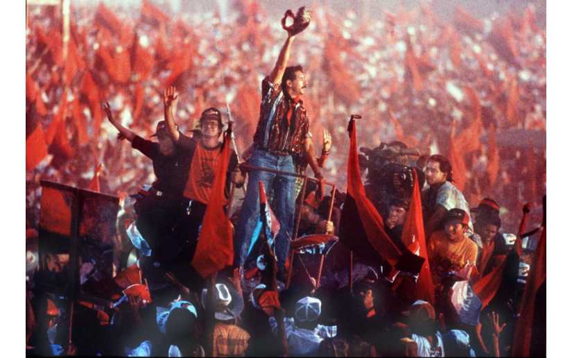 Ramírez se refiere ahí al cierre de campaña del FSLN el 21 de febrero del 90 en la Plaza de la Revolución, “frente a la multitud sin horizonte que celebraba de antemano la victoria definitiva, diez pasos delante de mí, el micrófono en la mano, caminando por aquel muelle que entraba en el inmenso mar de pueblo el estadista de jeans desteñidos y camisa juvenil que había salido del foso de los leones para conducir tantas luchas y tantas victorias, tras tantos años de cárcel y combates clandestinos, el jefe guerrillero el Frente Norte en Macuelizo y Dipilto que ahora encarnaba, frente a su pueblo despierto, lúcido y consecuente de su nueva victoria, a la Nicaragua invicta que ya no entregaríamos jamás a ningún imperio”.