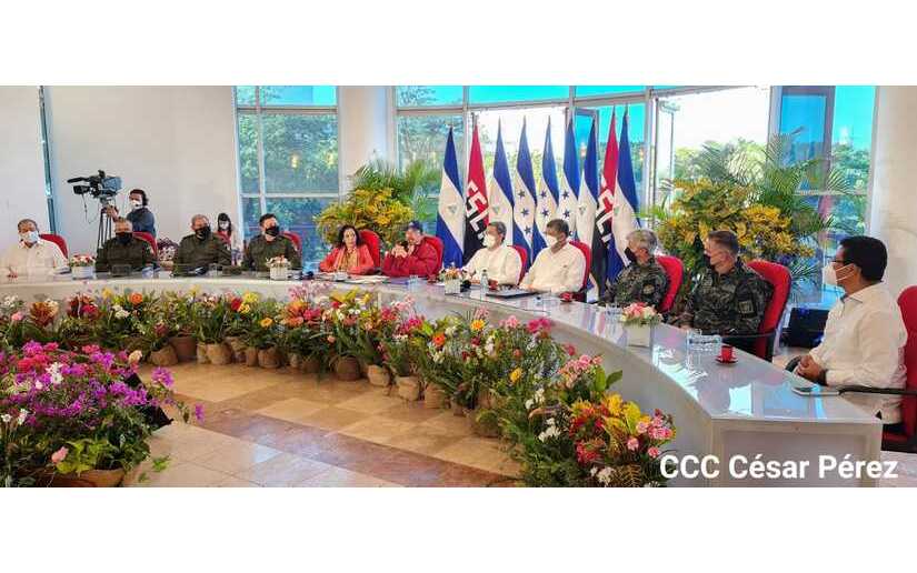 Somos Pueblos Hermanos y reconocemos el esfuerzo los Grupos de Trabajo de Honduras y Nicaragua. El General Avilés con los Hermanos del Ejército, el Doctor Carlos Argüello con toda su experiencia y sabiduría, los Hermanos de INETER aportando ahí con los detalles, porque no es tarea fácil, y fíjense, por eso tantos años pasaron... ¡Décadas pasaron!