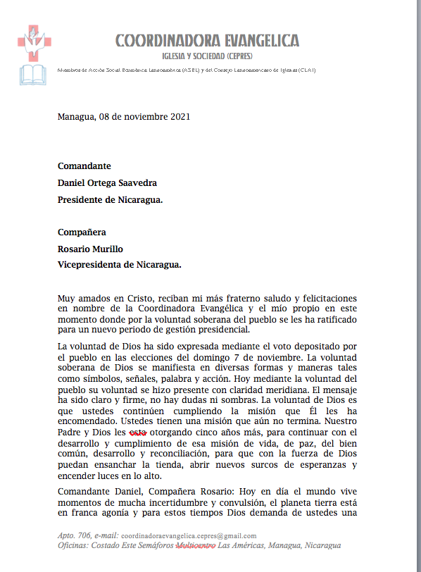 Mensaje al Presidente Daniel Ortega de la Coordinadora Evangélica: