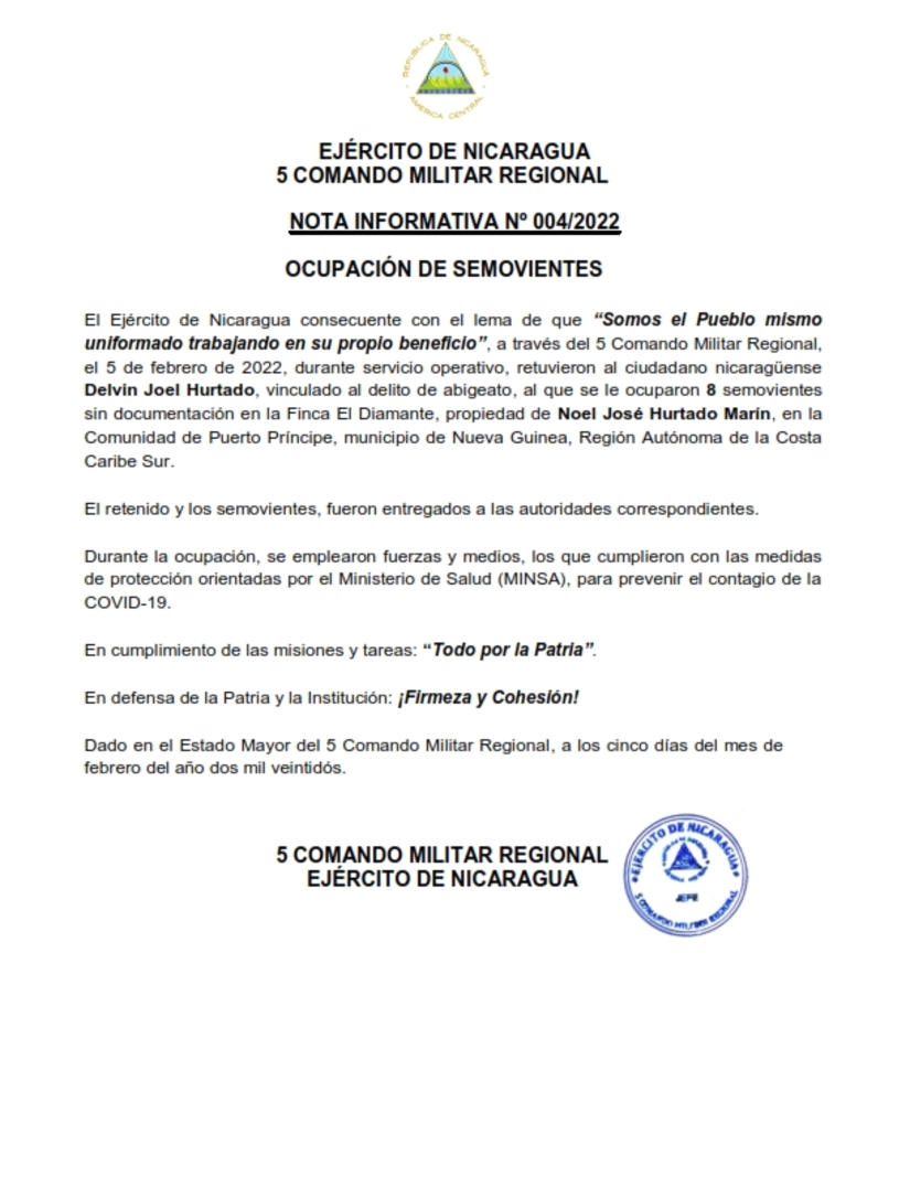 El Ejército de Nicaragua consecuente con el lema de que “Somos el Pueblo mismo uniformado trabajando en su propio beneficio”, a través del 5 Comando Militar Regional, el 5 de febrero de 2022, durante servicio operativo, retuvieron al ciudadano nicaragüense Delvin Joel Hurtado, vinculado al delito de abigeato, al que se le ocuparon 8 semovientes sin documentación en la Finca El Diamante, propiedad de Noel José Hurtado Marín, en la Comunidad de Puerto Príncipe, municipio de Nueva Guinea, Región Autónoma de la Costa Caribe Sur.