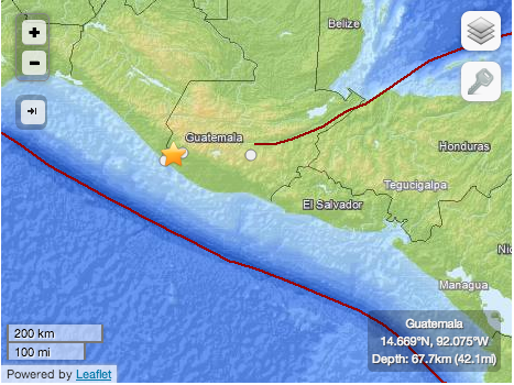 Según el Servicio Geológico de EE.UU. (USGS, por sus siglas en inglés), el sismo de magnitud 6,5 se produjo a las 00.13 GMT a unos seis kilómetros al suroeste de la localidad guatemalteca de Pajapita.