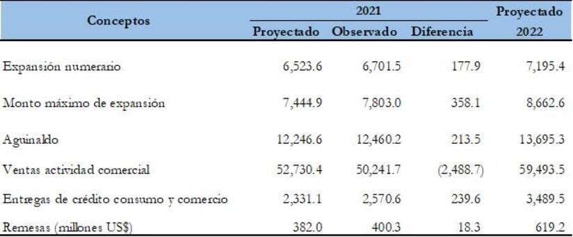 El incremento en el numerario estará vinculado principalmente a la mayor demanda de dinero por concepto de pago del aguinaldo, o treceavo mes de salario, el que se estima alcance la suma de C$13,695.3 millones en el año 2022 (C$12,460.2 millones estimado para 2021). Así mismo, también se verá favorecido por las entregas de crédito a las actividades de consumo y comercio por parte del sistema bancario y financieras, así como por las remesas familiares. En este sentido, se estiman entregas netas de crédito por C$3,489.5 millones (C$2,570.6 millones observado en 2021) y entradas de remesas por US$619.2 millones (US$400.3 millones observado en 2021).