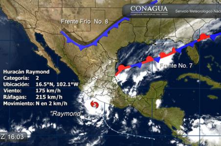 Autoridades mexicanas alertaron que continúa la alerta roja para cinco municipios del estado de Guerrero, naranja para la Costa Grande y amarilla para el resto de la entidad, por el huracán Raymond; las lluvias han sido de intensas a moderadas en la mayor parte.