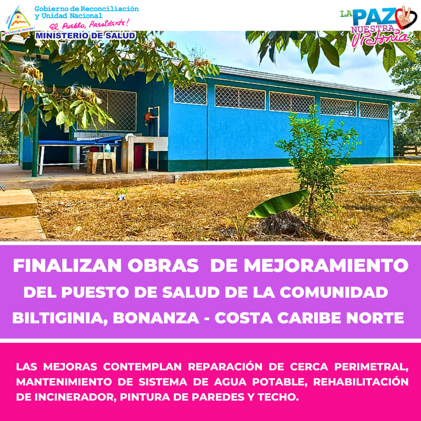 Hoy, se realizará entrega del mejoramiento del Puesto de Salud de la Comunidad Biltiginia, Bonanza - Costa Caribe Norte, para brindar servicios de atención en salud a 3 mil habitantes de esta localidad. Las mejoras contemplan reparación de cerca perimetral, mantenimiento de sistema de agua potable, tanque de almacenamiento de agua, rehabilitación de incinerador, pintura de paredes y techo. (Inversión de 616 mil córdobas).