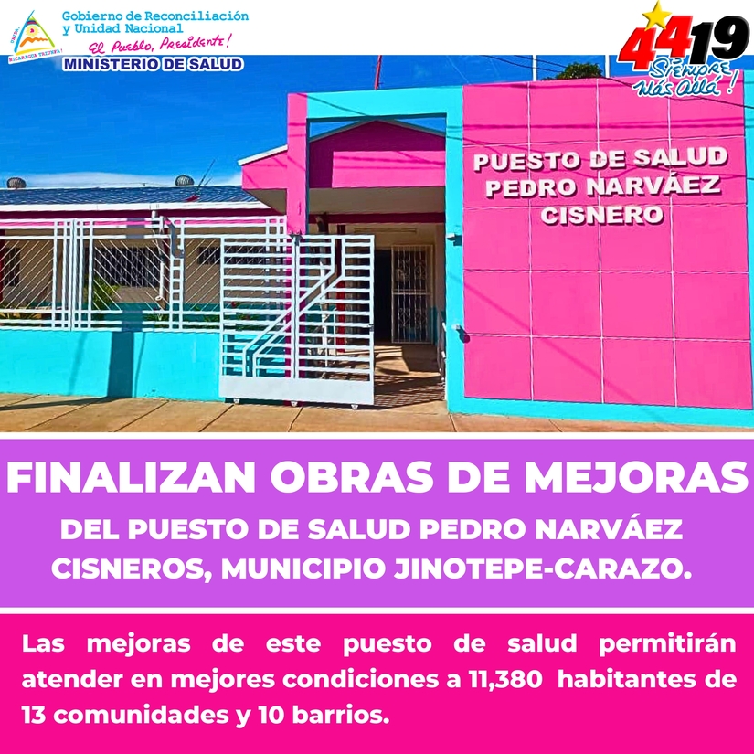 Este Miércoles, se realizará entrega de las mejoras del Puesto de Salud Pedro Narváez Cisneros, en el Barrio Ernesto Thelman, Jinotepe-Carazo, para atender en condiciones dignas a 11,380 habitantes de 13 comunidades y 10 barrios. (Inversión 500 mil córdobas).