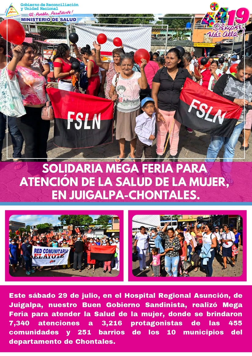 Este Sábado 29 de Julio, en el Hospital Regional Asunción de Juigalpa, nuestro Buen Gobierno Sandinista, realizó Mega Feria para atender la Salud de la Mujer, donde se brindaron 7,340 atenciones a 3,216 protagonistas de las 455 Comunidades y 251 Barrios de los 10 Municipios del Departamento de Chontales.
