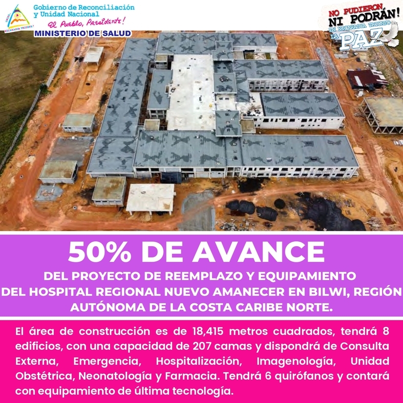 Se está construyendo el Hospital Regional Nuevo Amanecer de la Región Autónoma de la Costa Caribe Norte, que permitirá atender a más de 242,145 habitantes de esta Región quienes mayoritariamente pertenecen a los pueblos Mayagnas y Miskitus.