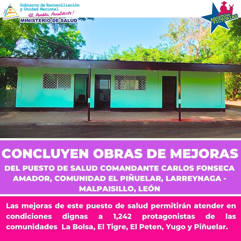 Este Viernes, se realizará entrega de las mejoras en el Puesto de Salud Comandante Carlos Fonseca Amador, Comunidad El Piñuelar, en el Municipio Larreynaga - Malpaisillo, del departamento de León, para atender en condiciones dignas a 1,242 habitantes de estas localidades.