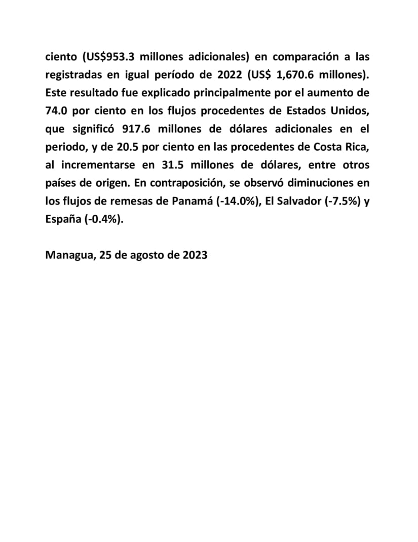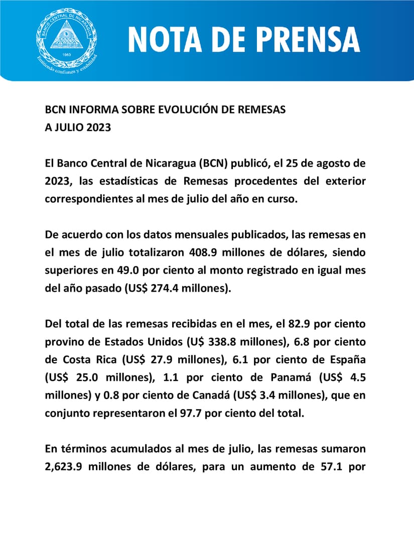El Banco Central de Nicaragua (BCN) publicó, el 25 de agosto de 2023, las estadísticas de Remesas procedentes del exterior correspondientes al mes de julio del año en curso.