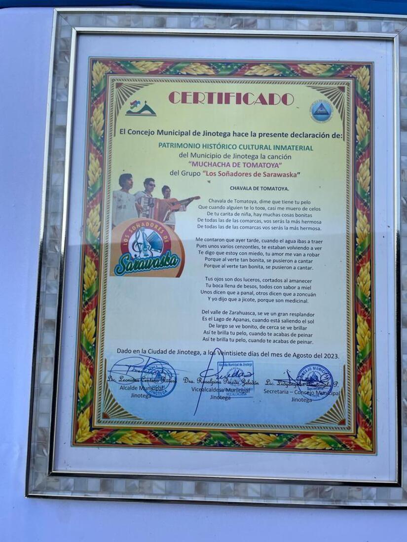 III Festival de Polcas, Mazurcas y Jamaquellos en Homenaje al famoso grupo musical “Los Soñadores de SARAWASKA”, este 27 de Agosto, incluyó una sesión especial del Concejo Municipal de Jinotega donde fueron Declarados Patrimonio Histórico Cultural Municipal y Patrimonio Cultural Intangible la canción “Muchacha de Tomatoya” de la misma agrupación musical.