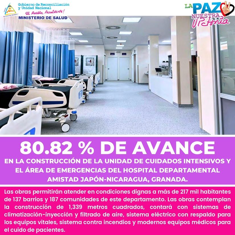 Se está construyendo la Unidad de Cuidados Intensivos y Área de Emergencias, del Hospital Departamental Amistad Japón-Nicaragua, en Granada, para atender en condiciones dignas a más de 217 mil habitantes de 137 Barrios y 187 Comunidades de este Departamento.