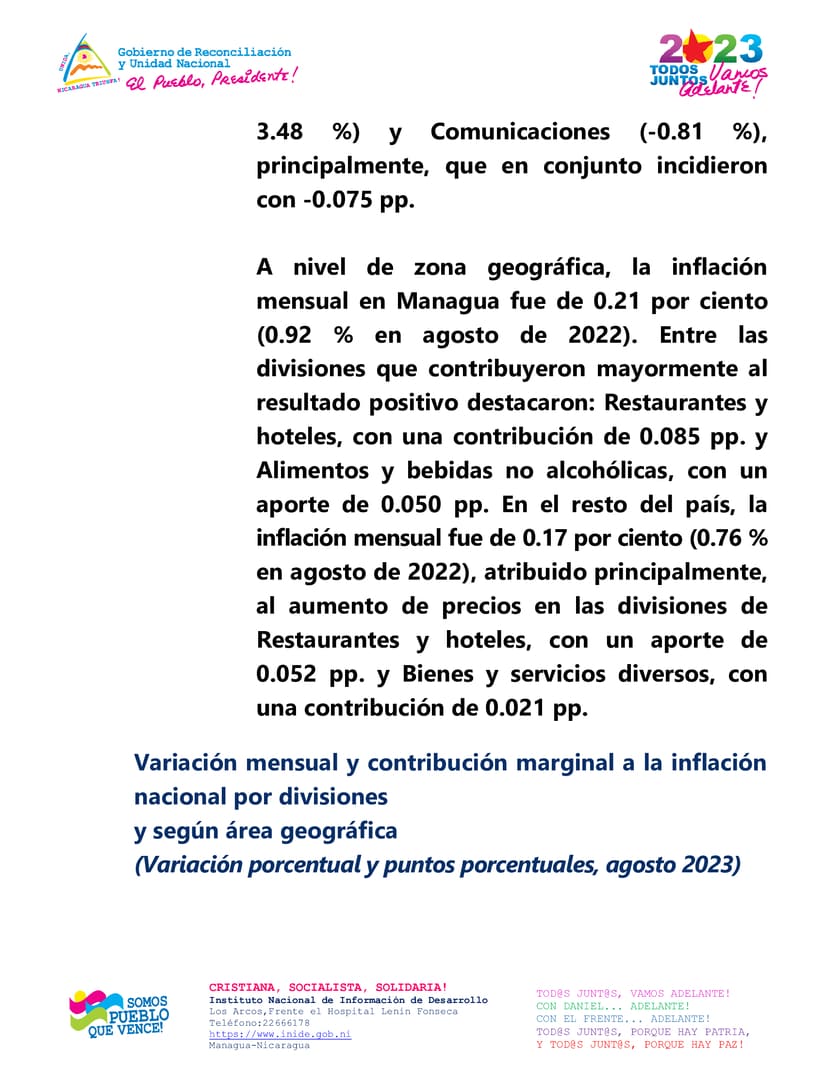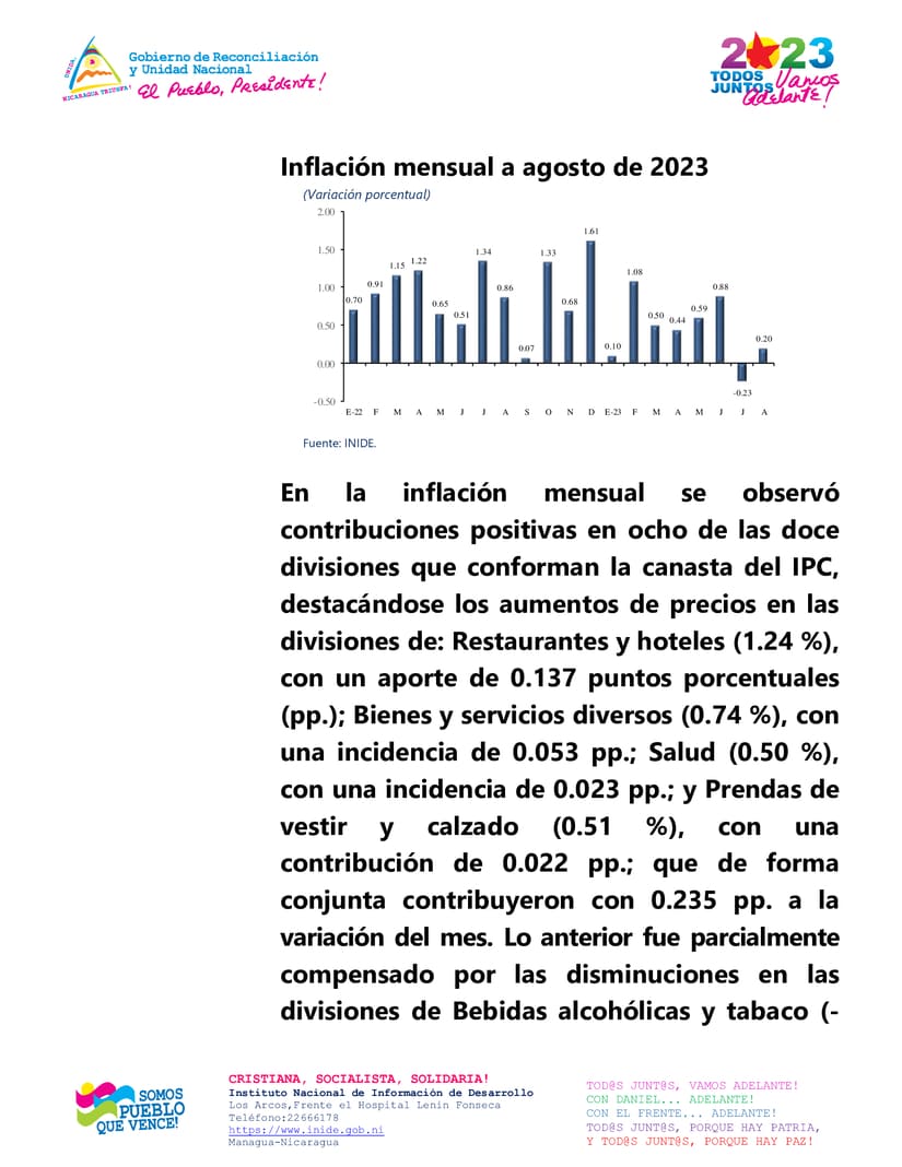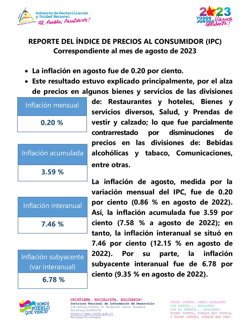 La inflación de Agosto, medida por la variación mensual del IPC, fue de 0.20 por ciento (0.86 % en agosto de 2022). Así, la inflación acumulada fue 3.59 por ciento (7.58 % a Agosto de 2022); en tanto, la inflación interanual se situó en 7.46 por ciento (12.15 % en Agosto de 2022). Por su parte, la inflación subyacente interanual fue de 6.78 por ciento (9.35 % en agosto de 2022).