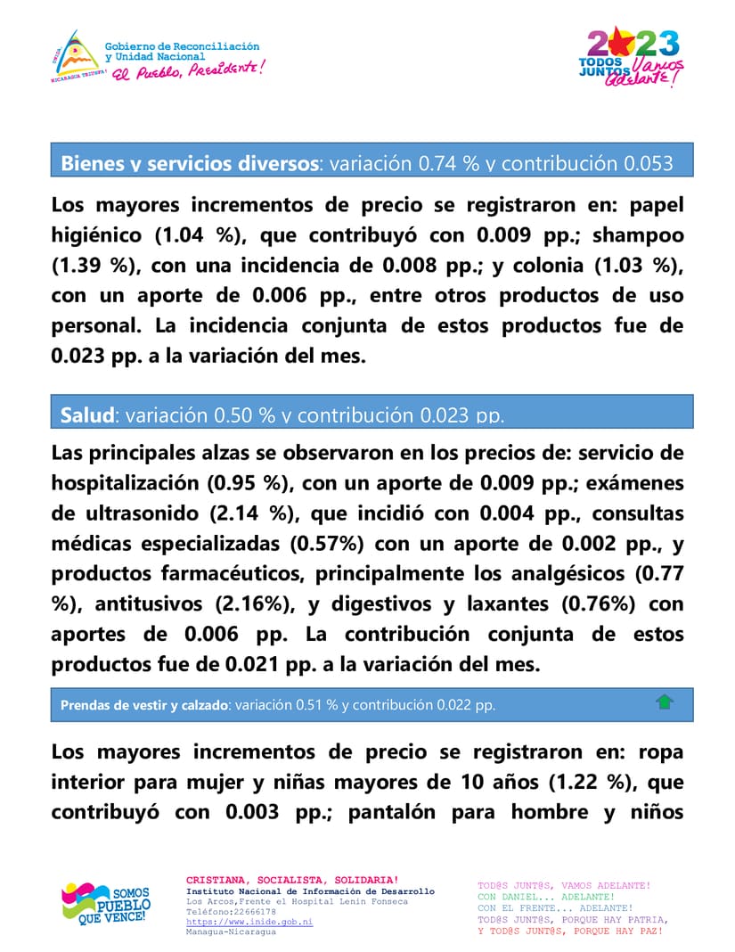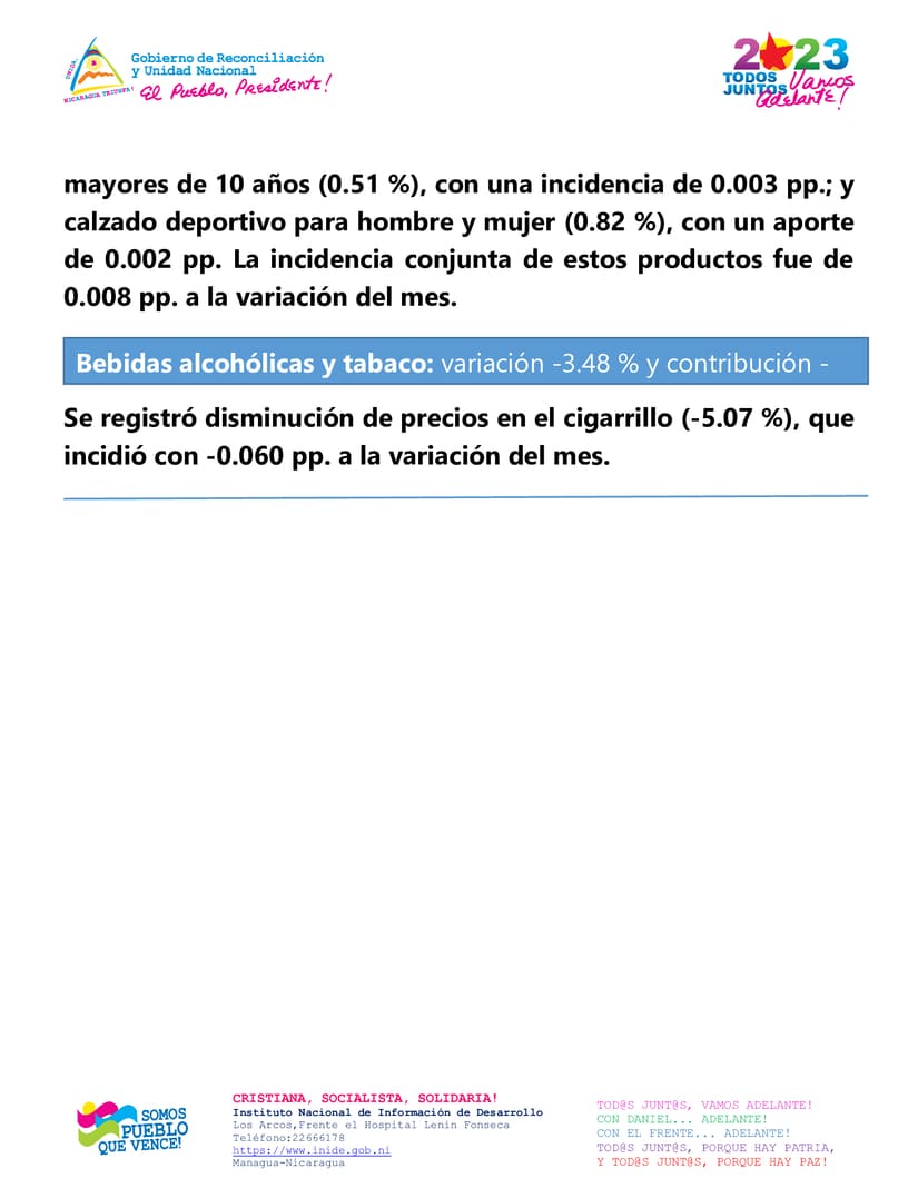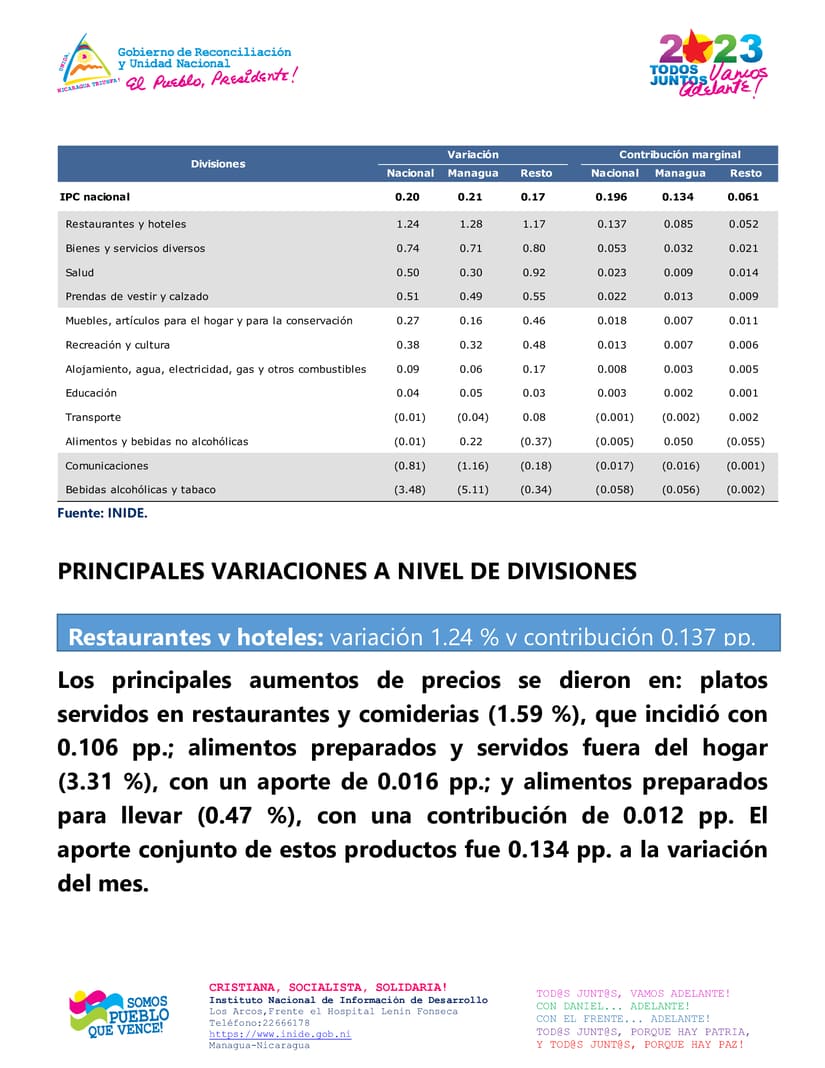 En la inflación mensual se observó contribuciones positivas en ocho de las doce divisiones que conforman la canasta del IPC, destacándose los aumentos de precios en las divisiones de: Restaurantes y hoteles (1.24 %), con un aporte de 0.137 puntos porcentuales (pp.); Bienes y servicios diversos (0.74 %), con una incidencia de 0.053 pp.; Salud (0.50 %), con una incidencia de 0.023 pp.; y Prendas de vestir y calzado (0.51 %), con una contribución de 0.022 pp.; que de forma conjunta contribuyeron con 0.235 pp. a la variación del mes. Lo anterior fue parcialmente compensado por las disminuciones en las divisiones de Bebidas alcohólicas y tabaco (-3.48 %) y Comunicaciones (-0.81 %), principalmente, que en conjunto incidieron con -0.075 pp.