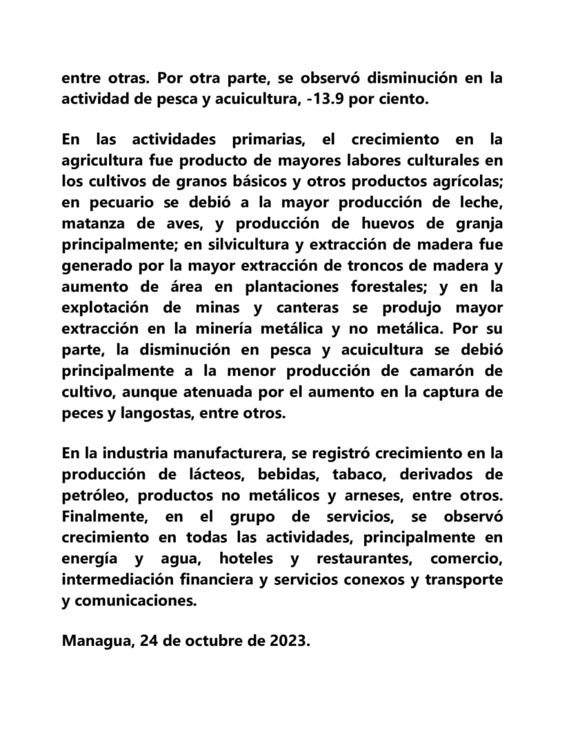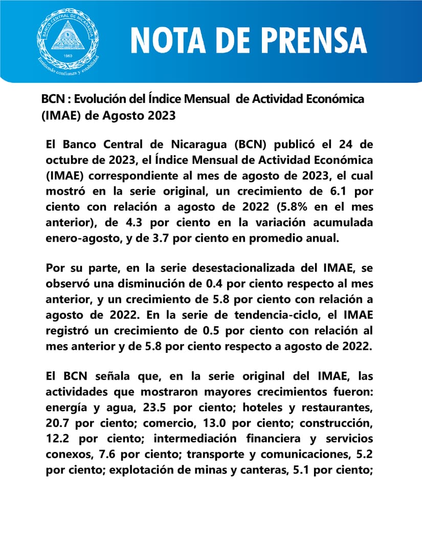 El Banco Central de Nicaragua (BCN) publicó el 24 de octubre de 2023, el Índice Mensual de Actividad Económica (IMAE) correspondiente al mes de agosto de 2023, el cual mostró en la serie original, un crecimiento de 6.1 por ciento con relación a agosto de 2022 (5.8% en el mes anterior), de 4.3 por ciento en la variación acumulada enero-agosto, y de 3.7 por ciento en promedio anual.