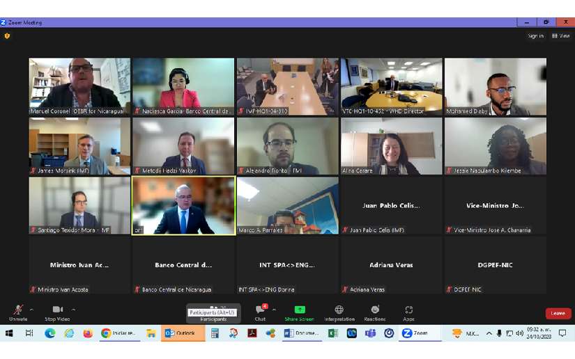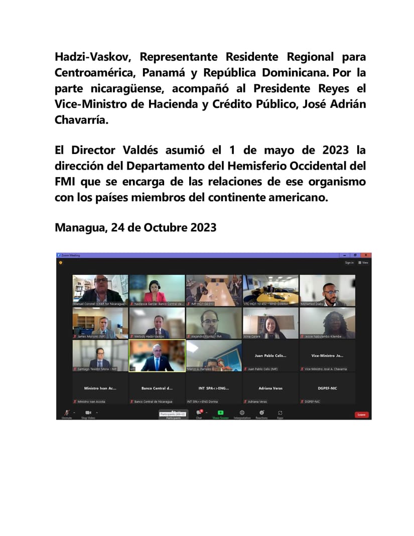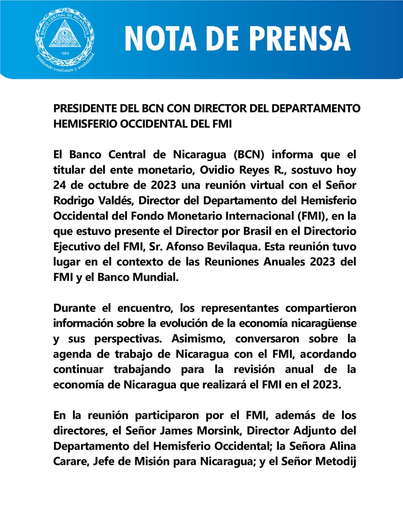 El Banco Central de Nicaragua (BCN) informa que el titular del ente monetario, Ovidio Reyes R., sostuvo hoy 24 de octubre de 2023 una reunión virtual con el Señor Rodrigo Valdés, Director del Departamento del Hemisferio Occidental del Fondo Monetario Internacional (FMI), en la que estuvo presente el Director por Brasil en el Directorio Ejecutivo del FMI, Sr. Afonso Bevilaqua. Esta reunión tuvo lugar en el contexto de las Reuniones Anuales 2023 del FMI y el Banco Mundial.